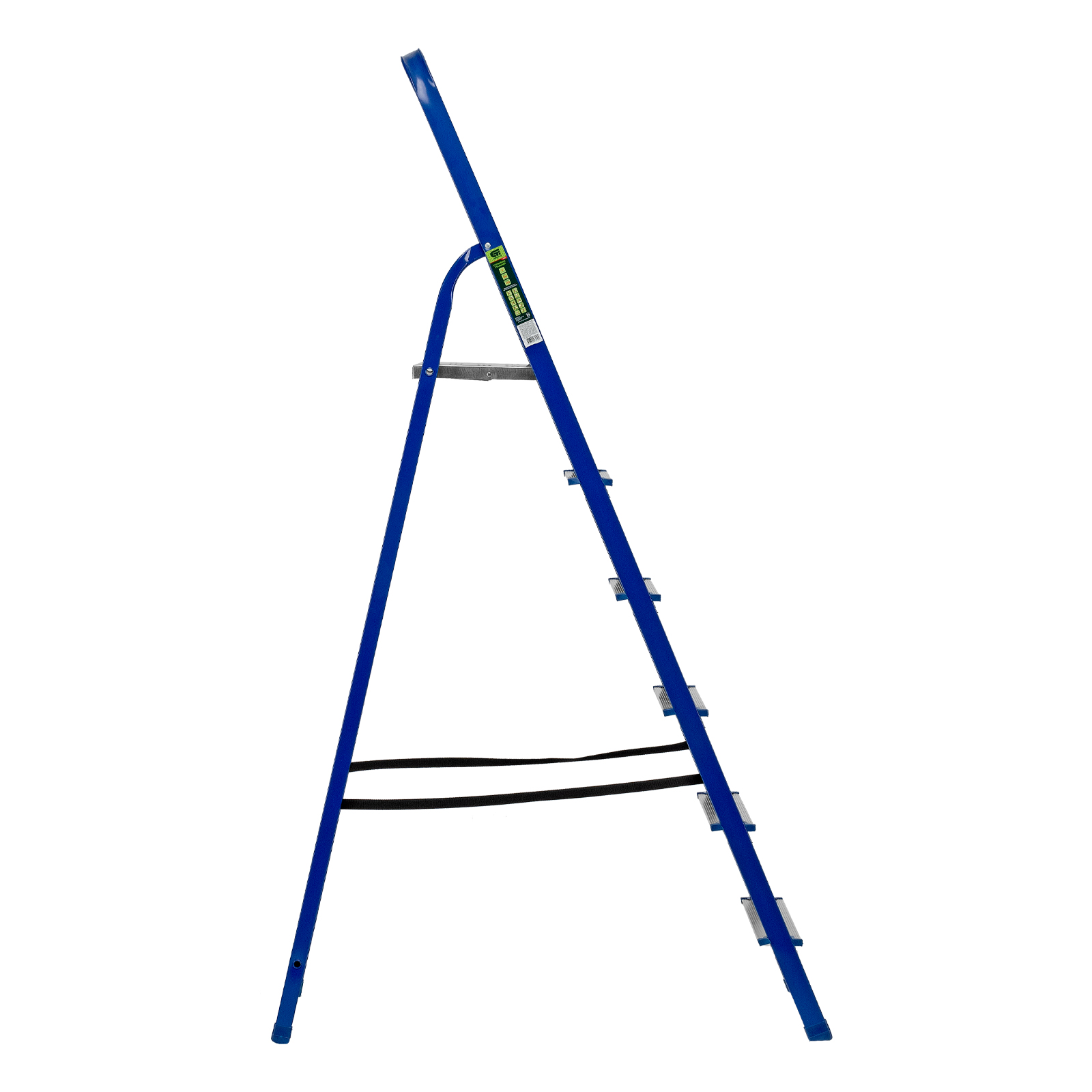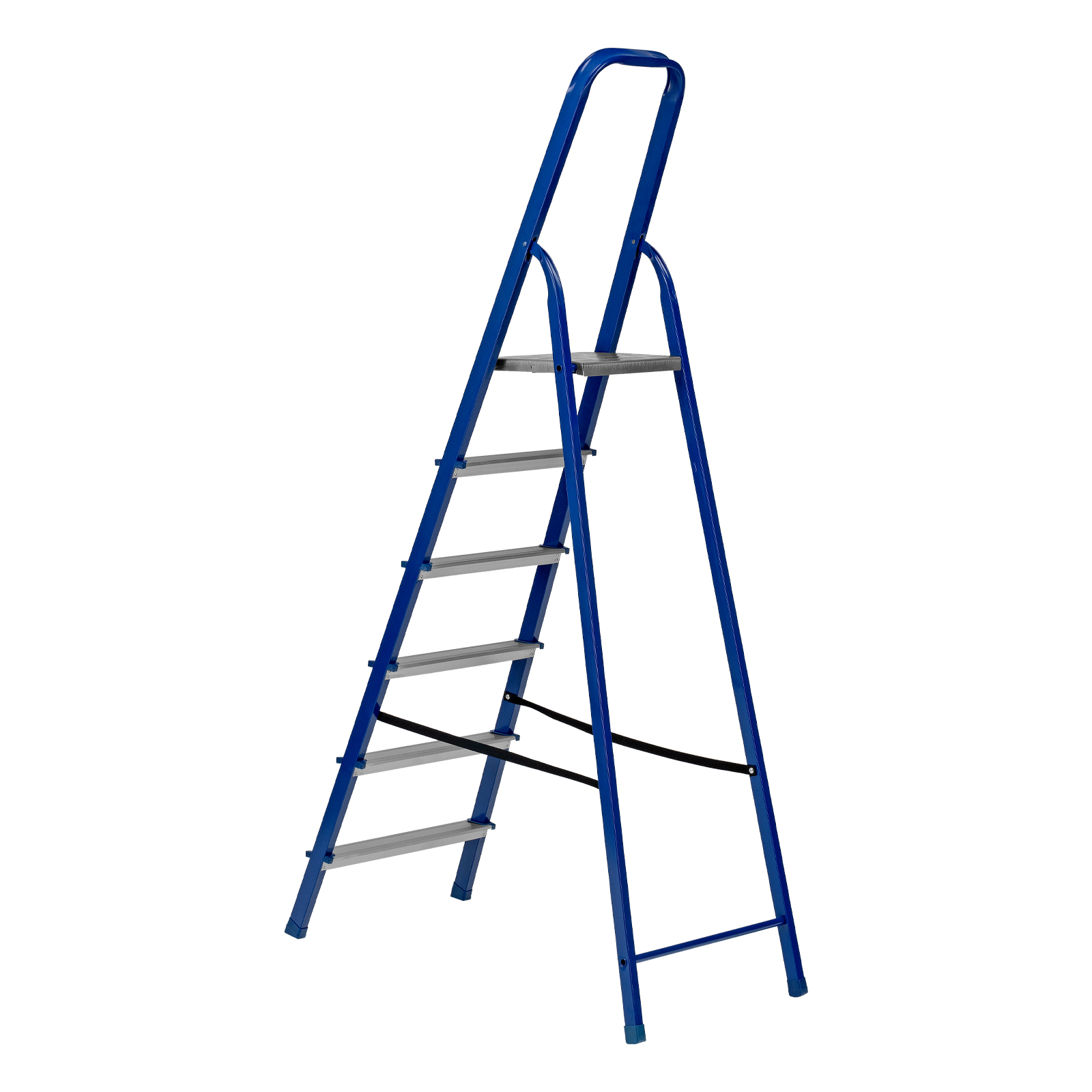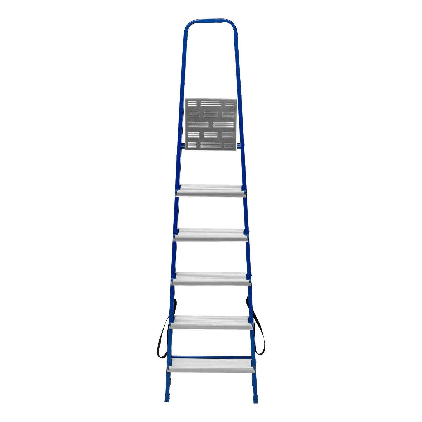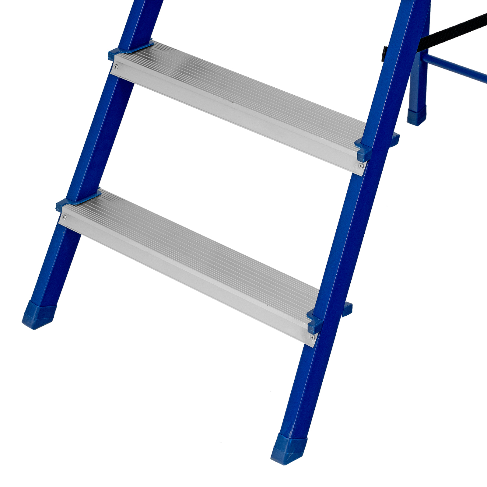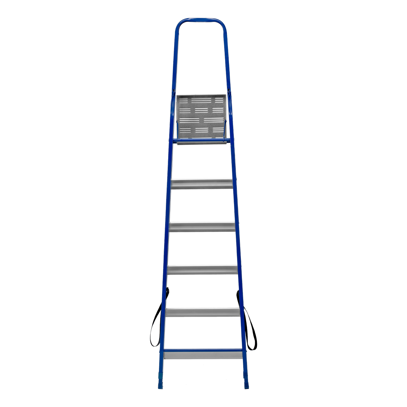 - Надежность — рама изготовлена из профилированной стали, стальная верхняя площадка с зацепами прочно фиксирует стремянку в рабочем положении, страховочные ленты придают дополнительную прочность конструкции.