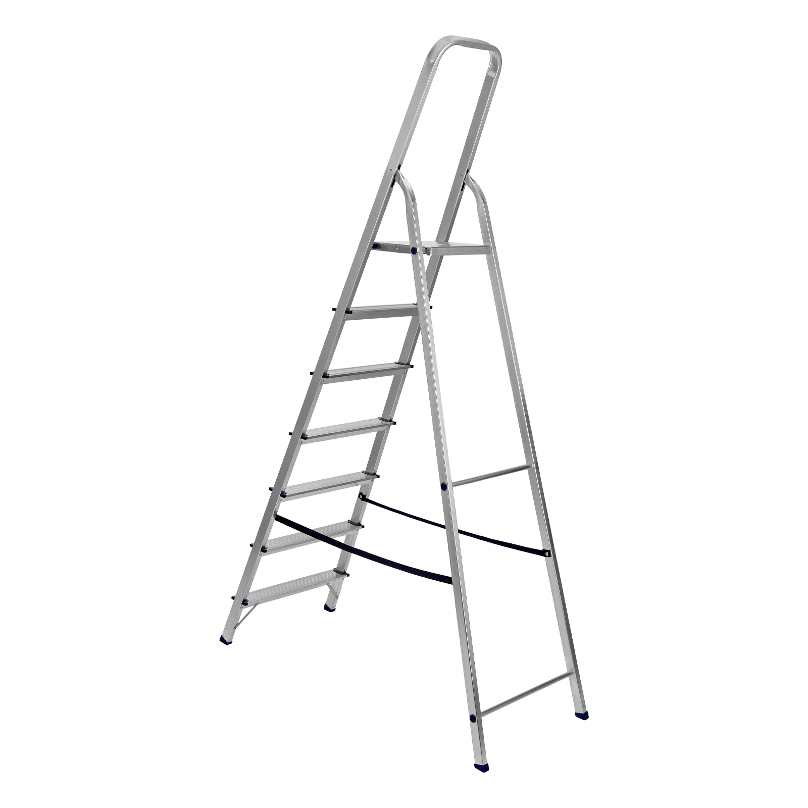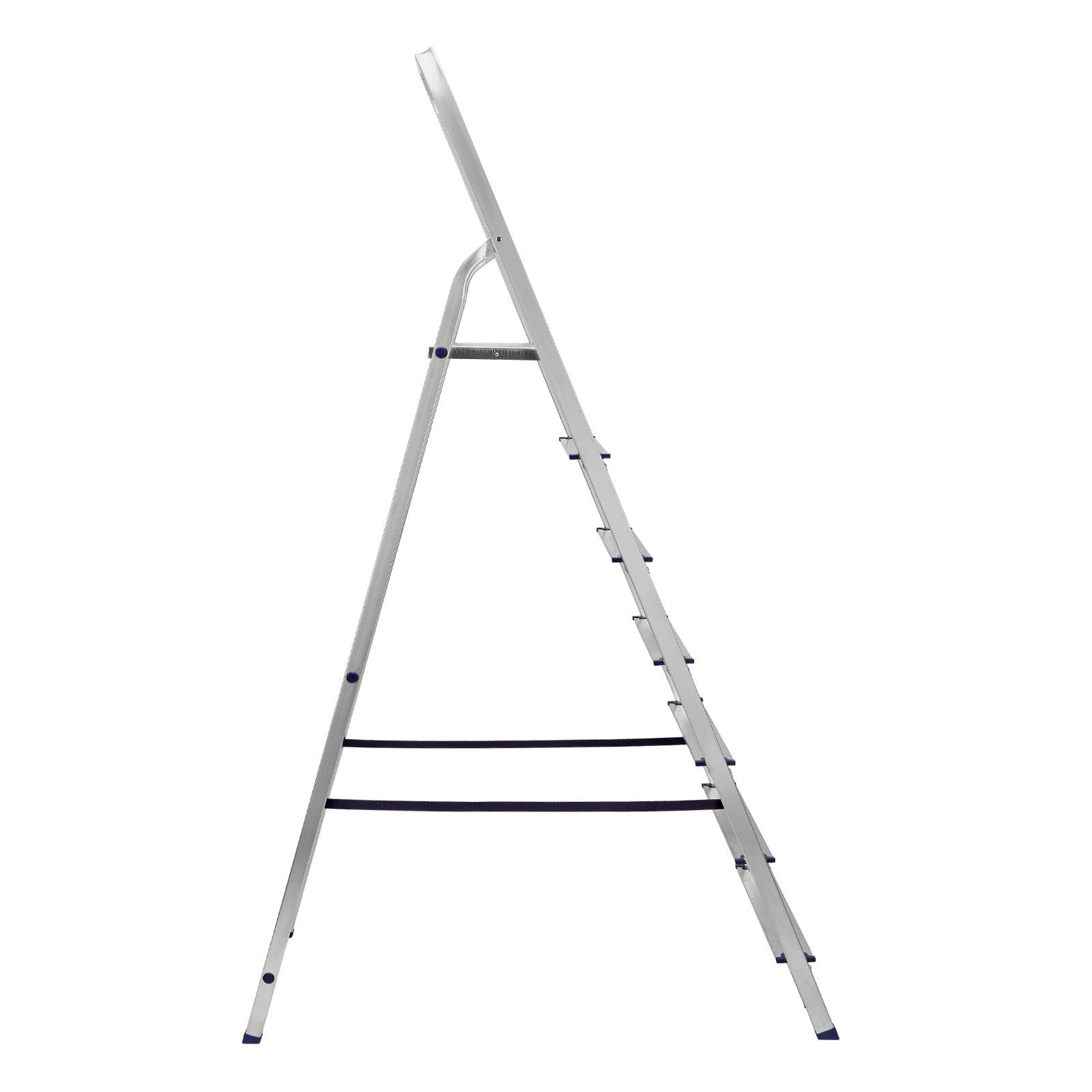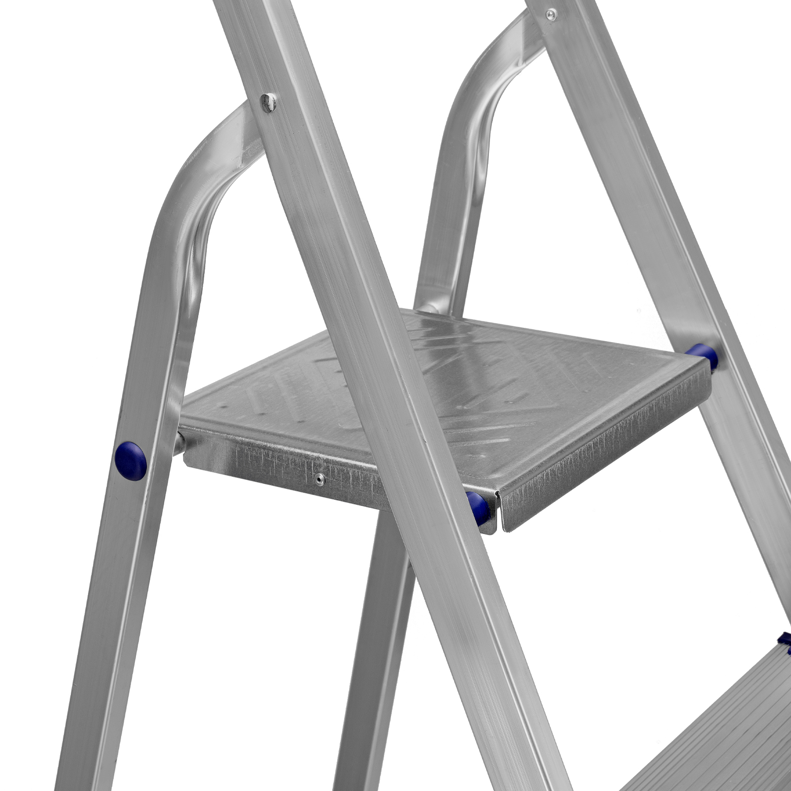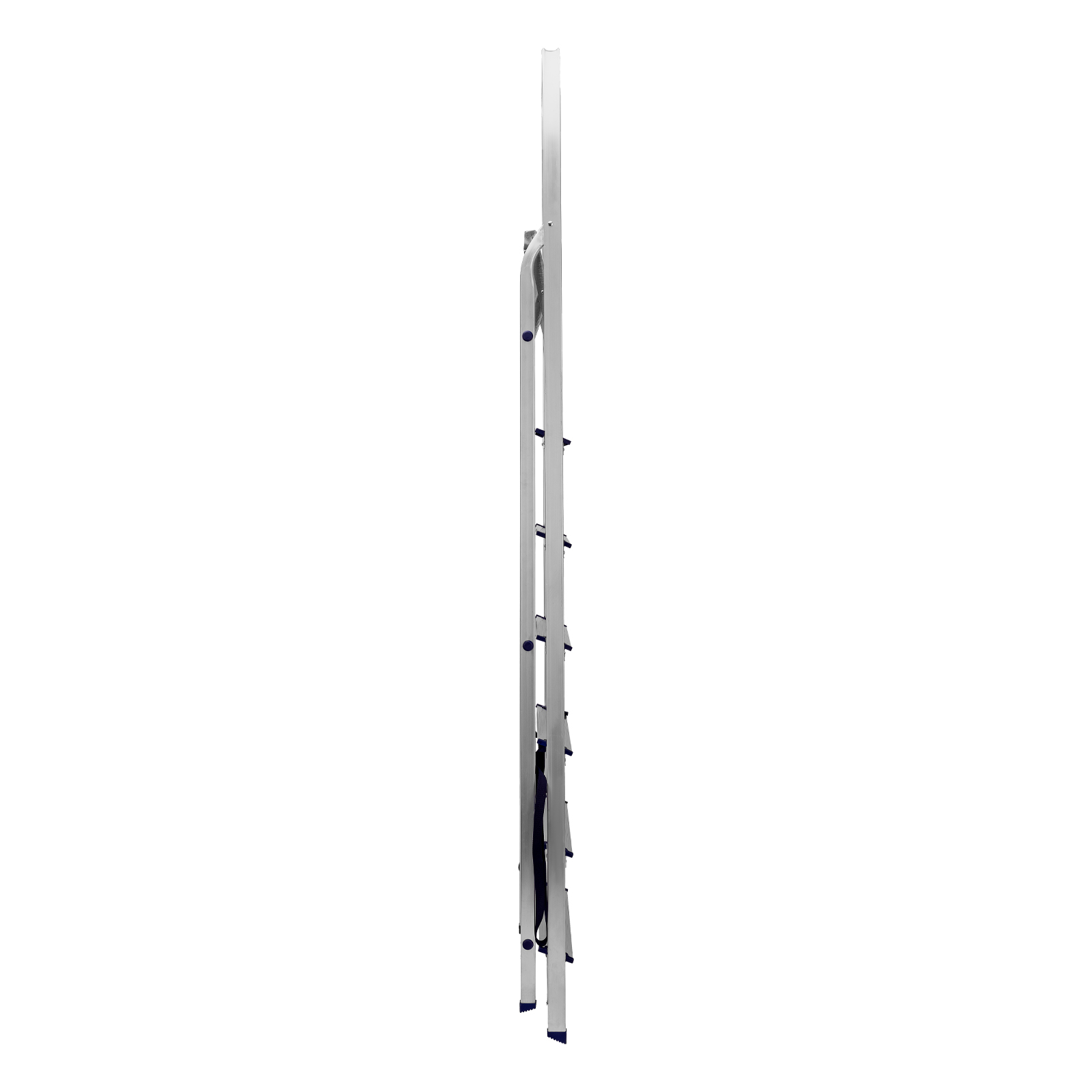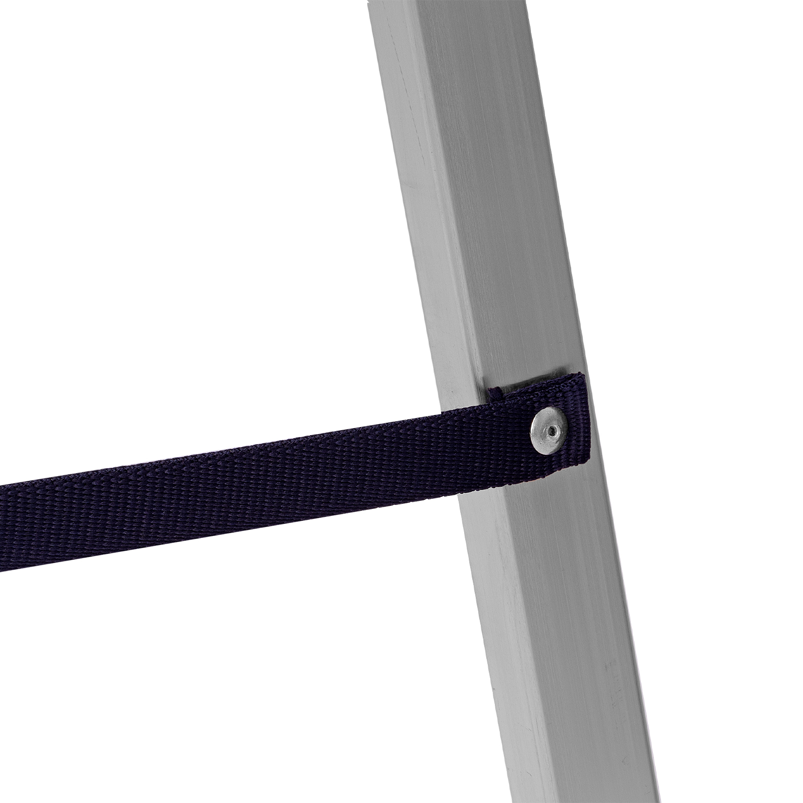 - Надежность — рама из прямоугольного алюминиевого профиля выдерживает нагрузку до 150 кг, широкие ступени закреплены заклепками, страховочные стяжки повышают прочность конструкции.