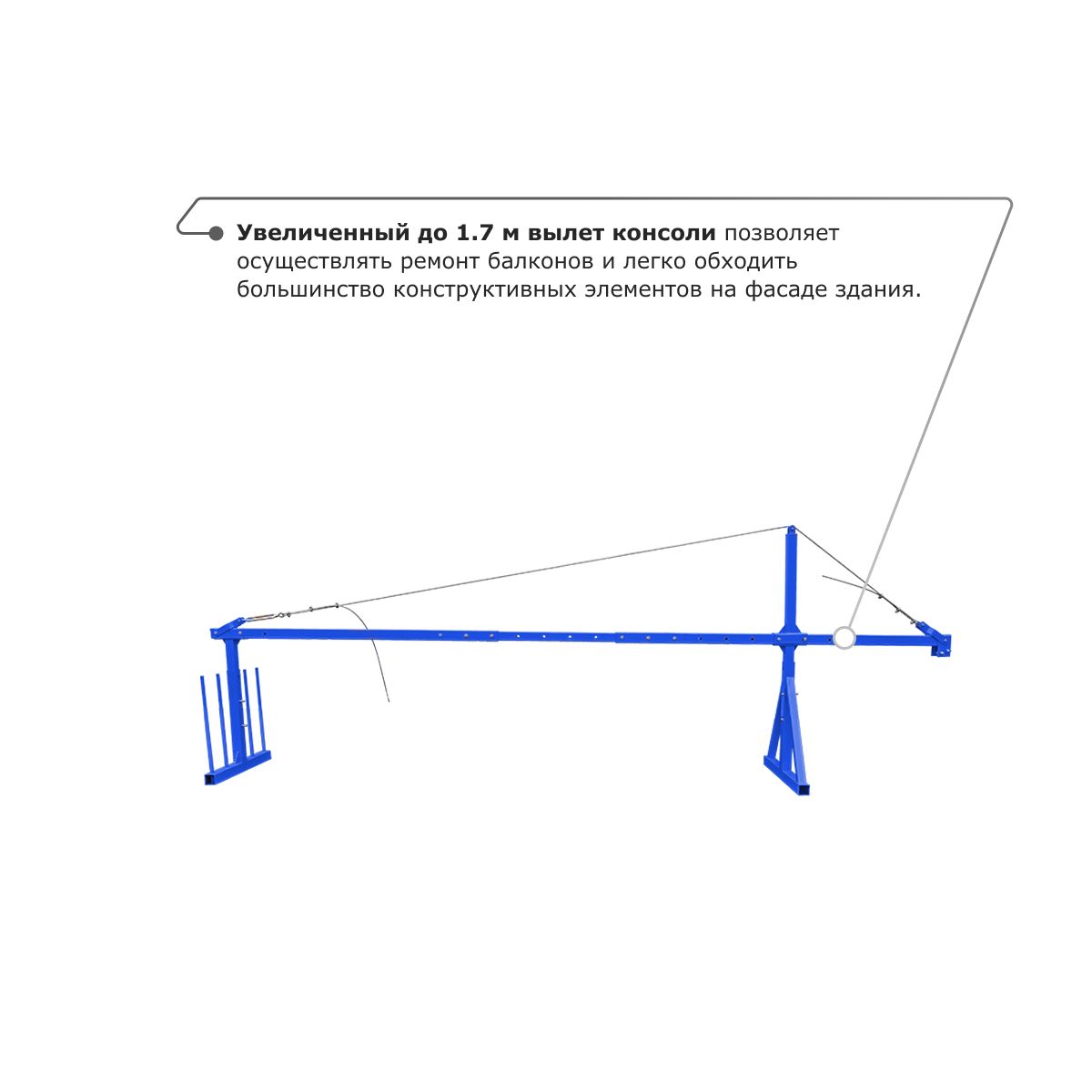 - Увеличенный до 1.7 м вылет консоли позволяет осуществлять ремонт балконов и легко обходить большинство конструктивных элементов на фасаде здания.