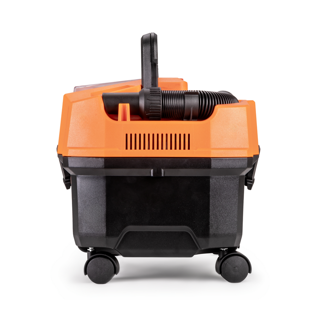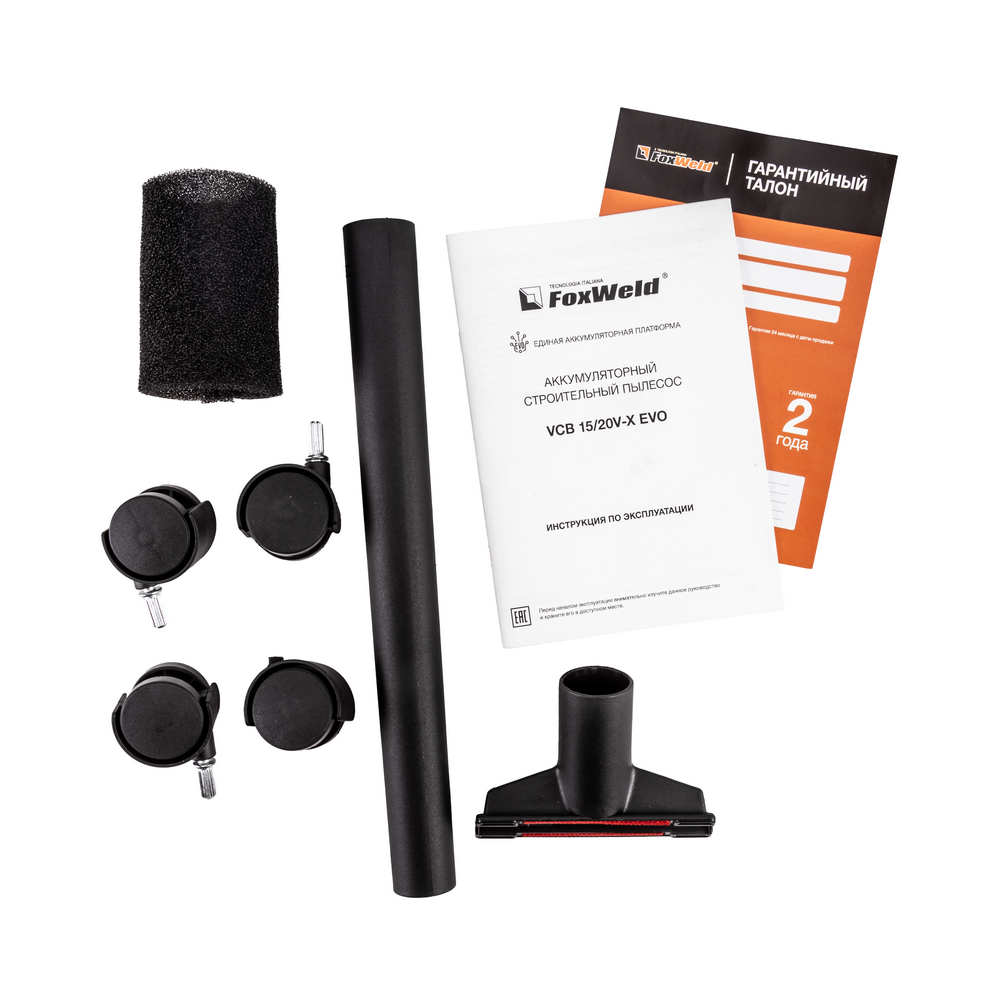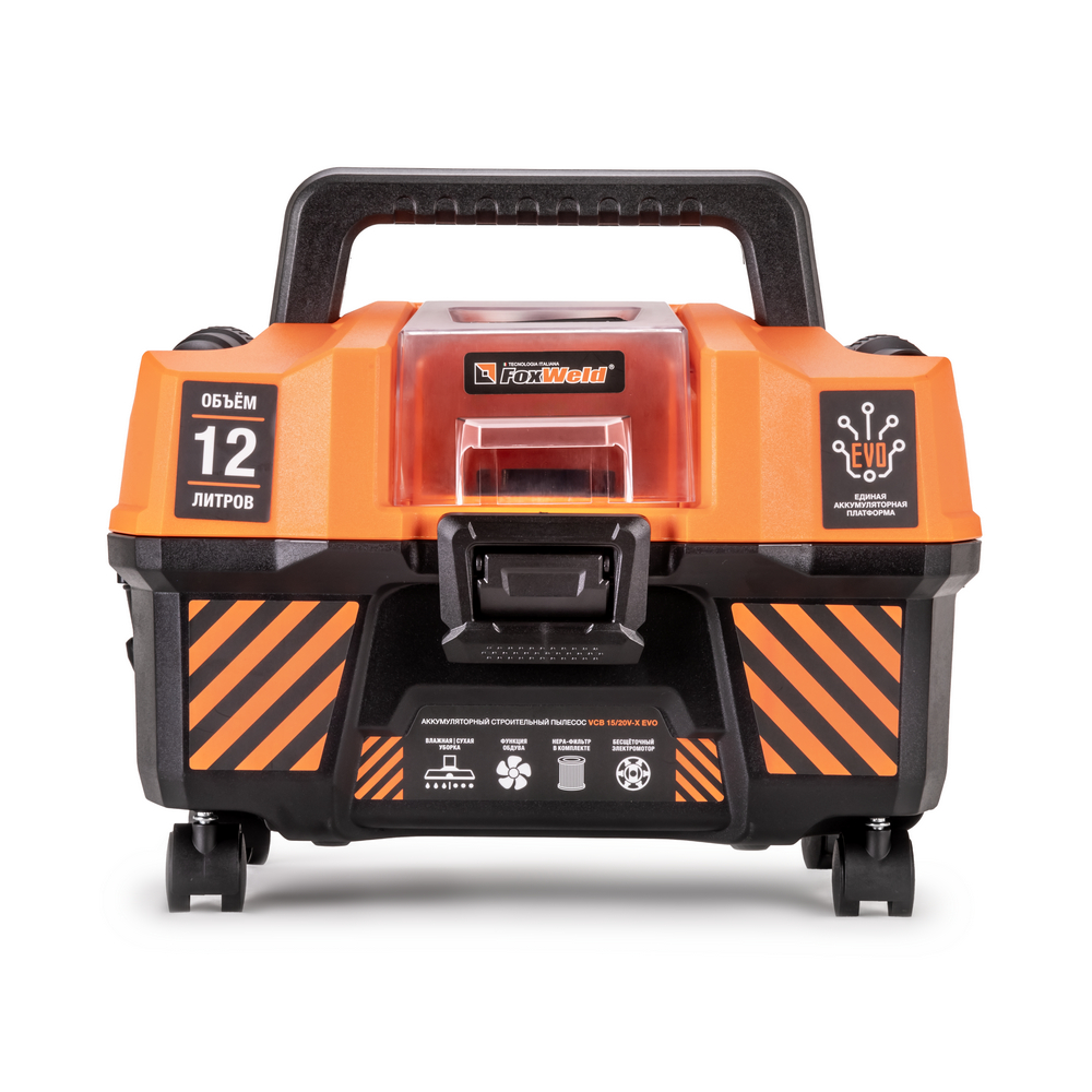 Строительный аккумуляторный пылесос FOXWELD VCB 15/20V-X EVO отлично подходит для уборки после проведения ремонта или строительства и предназначен для сбора сухого и влажного мусора. Это могут быть не только бытовые загрязнения, но и пыль класса М – частицы извести, мела, пыль от меди, жести, никеля, древесины. Строительный пылесос также позволяет собирать негорючую жидкость с любой поверхности, а щелевая насадка облегчает уборку узких участков. VCB 15/20V-X EVO работает от аккумулятора* — это свобода от проводов и возможность производить уборку в любом месте без использования бытовой розетки. Сфера применения пылесоса – промышленная, строительная и бытовая: уборка цеха и производственных помещений, отелей, офисов и квартир после ремонта; продувка фильтров кондиционеров; очистка рабочего места от пыли, стружки, опилок в столярных мастерских; чистка салона автомобиля в автосервисе и на автомойке; уборка жилых и нежилых помещений (частный дом, квартира, гараж, баня); очистка дорожек от листьев, веранды от песка. FOXWELD VCB 15/20V-X EVO входит в семейство инструментов Единой Аккумуляторной Платформы EVO и совместим с аккумуляторами и зарядной станцией этой линейки. *Аккумуляторы и зарядная станция FTL DC20V EVO не входят в комплект и приобретаются отдельно [артикулы 9053, 9054, 8769]. Совместим с аккумуляторными батареями серии MAKITA LXT 18 В.БЕСЩЁТОЧНЫЙ ЭЛЕКТРОМОТОР: Пылесос оборудован современным, эффективным и тихим бесщёточным электромотором с мощностью 180 Вт, который работает без потери мощности (высокий КПД), увеличивает износостойкость инструмента, имеет низкий уровень шума, высокий ресурс работы и не требует регулярного обслуживания.МОБИЛЬНОСТЬ: Небольшой вес около 4 кг, эргономичная ручка на корпусе, всасывающий шланг, который увеличивается в длине до 1,8 м – всё это позволяет проводить уборку в удалённых, труднодоступных местах и в ограниченном пространстве. Поворотные колёса на 360° обеспечивают манёвренность и удобство перемещения.ТУРБОРЕЖИМ: При включении второй скорости (Режим II) пылесос работает на полной мощности. Режим ТУРБО предназначен для сбора крупного и тяжёлого строительного мусора, чистки поверхностей с большим ворсом, сбора воды и обдува. Первая скорость предназначена для уборки деликатной поверхности.ФУНКЦИЯ ОБДУВА: Функция обдува позволяет очистить рабочее место и поверхности от пыли, стружки, опилок и других отходов ремонта или производства, а также сдуть листву с дорожек, очистить веранду от песка, продуть фильтр кондиционера и т.д.СБОР НЕГОРЮЧЕЙ ЖИДКОСТИ: Специальная функция сбора жидкости предназначена для эффективной уборки растворов, суспензий и воды с любой поверхности. Максимальная мощность модели 180 Вт, что позволяет собрать 10 литров жидкости за 5 секунд.ПРЕИМУЩЕСТВА:Единая аккумуляторная платформа EVOСовместимость с аккумуляторными батареями серии Makita LXTМоющийся HEPA фильтр класса H13 предустановленМоющийся губчатый фильтрАккумуляторный = мобильныйВместительный: бак на 12 литровБесщёточный мощный и надёжный моторМедная обмотка бесщёточного электромотораЗащита от перегрева3 функции: сбор сухого строительного мусора, сбор жидкостей и обдувДве скорости всасывания и обдуваКонтроль заполнения контейнераУдобство крепления шланга и аксессуаровКорпус и замки из прочного ABS пластикаУдобная складная ручкаМанёвренность и усто
