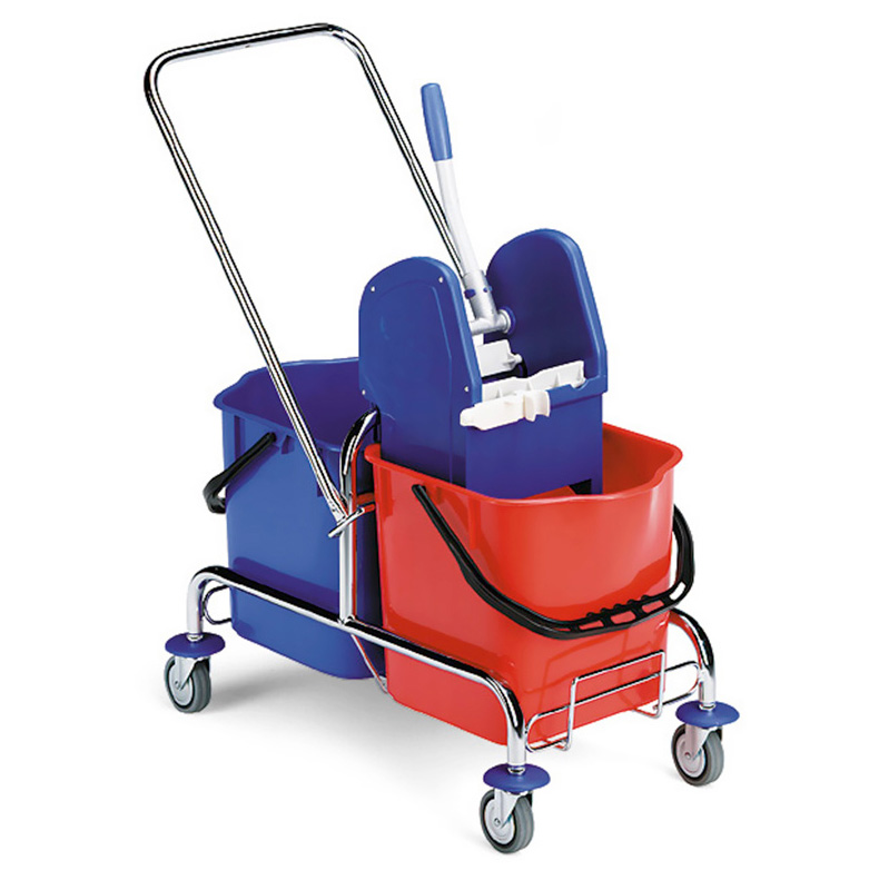 Тележка JACK представляет собой хромированную раму на колёсах, оснащенную высокой П-образной ручкой. На раме размещены два ведра емкостью по 25 л каждое и универсальный механический отжим для МОПов. Надежные поворотные колеса диаметром 80 мм и противоударные бамперы обеспечивают прекрасную маневренность и защищают тележку от соударений.