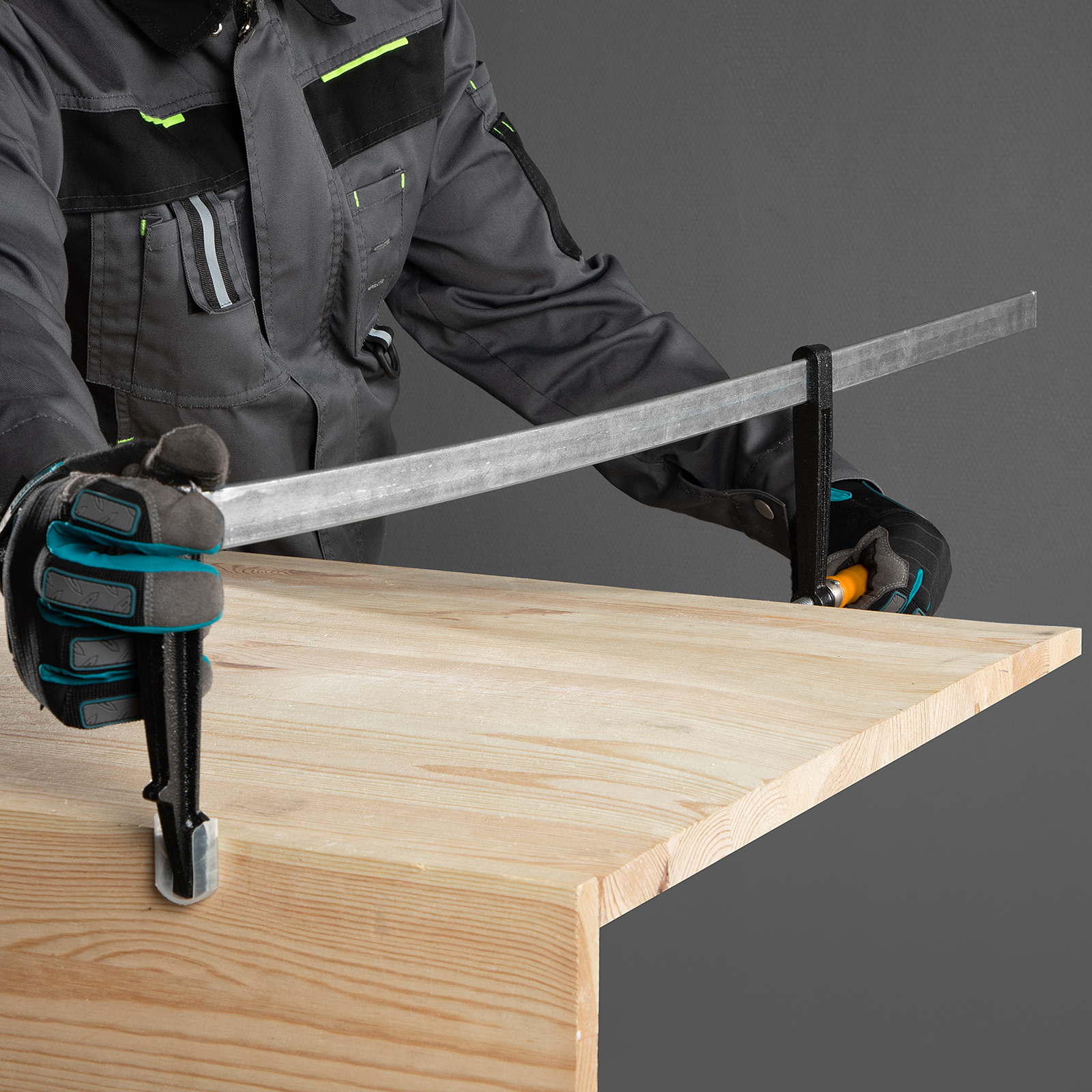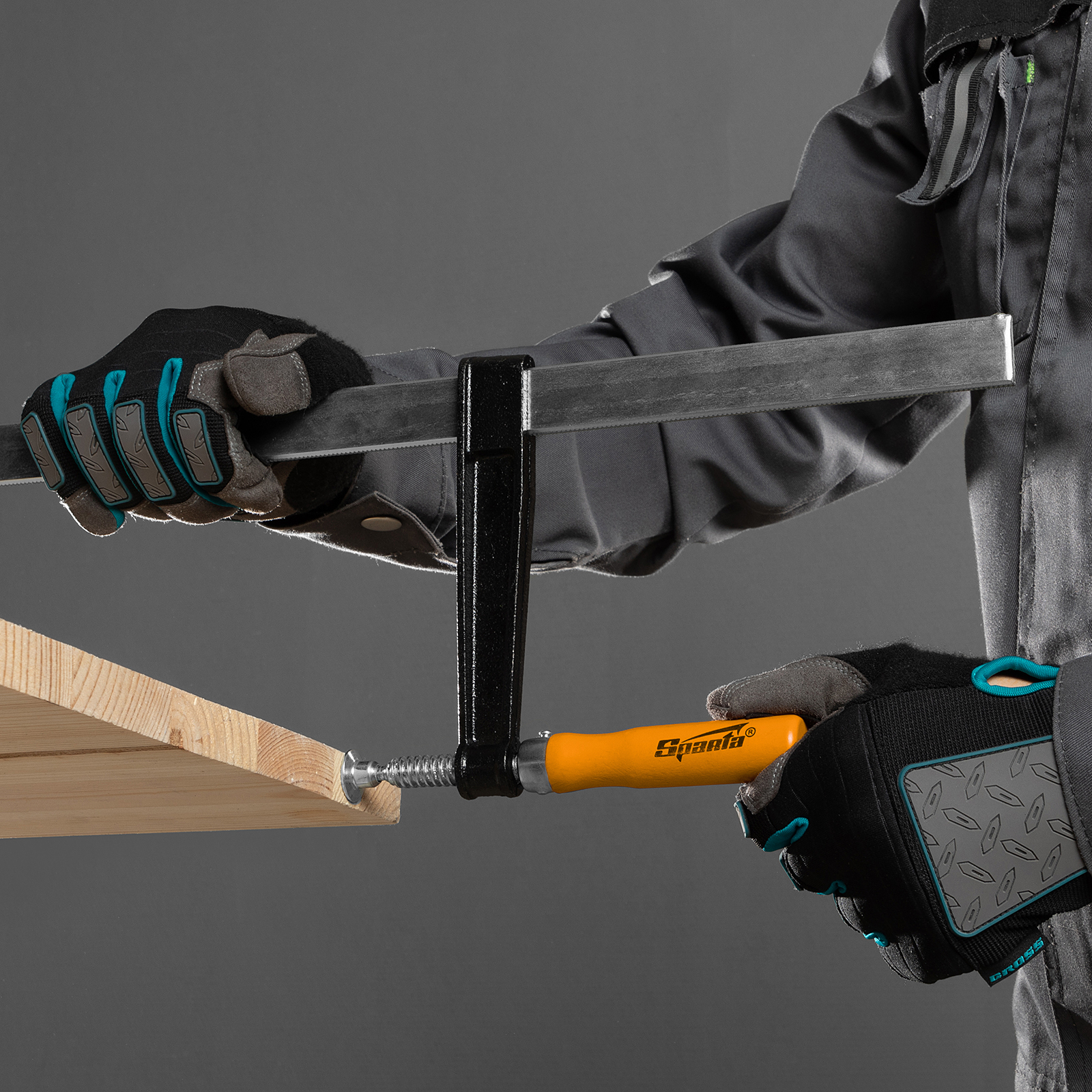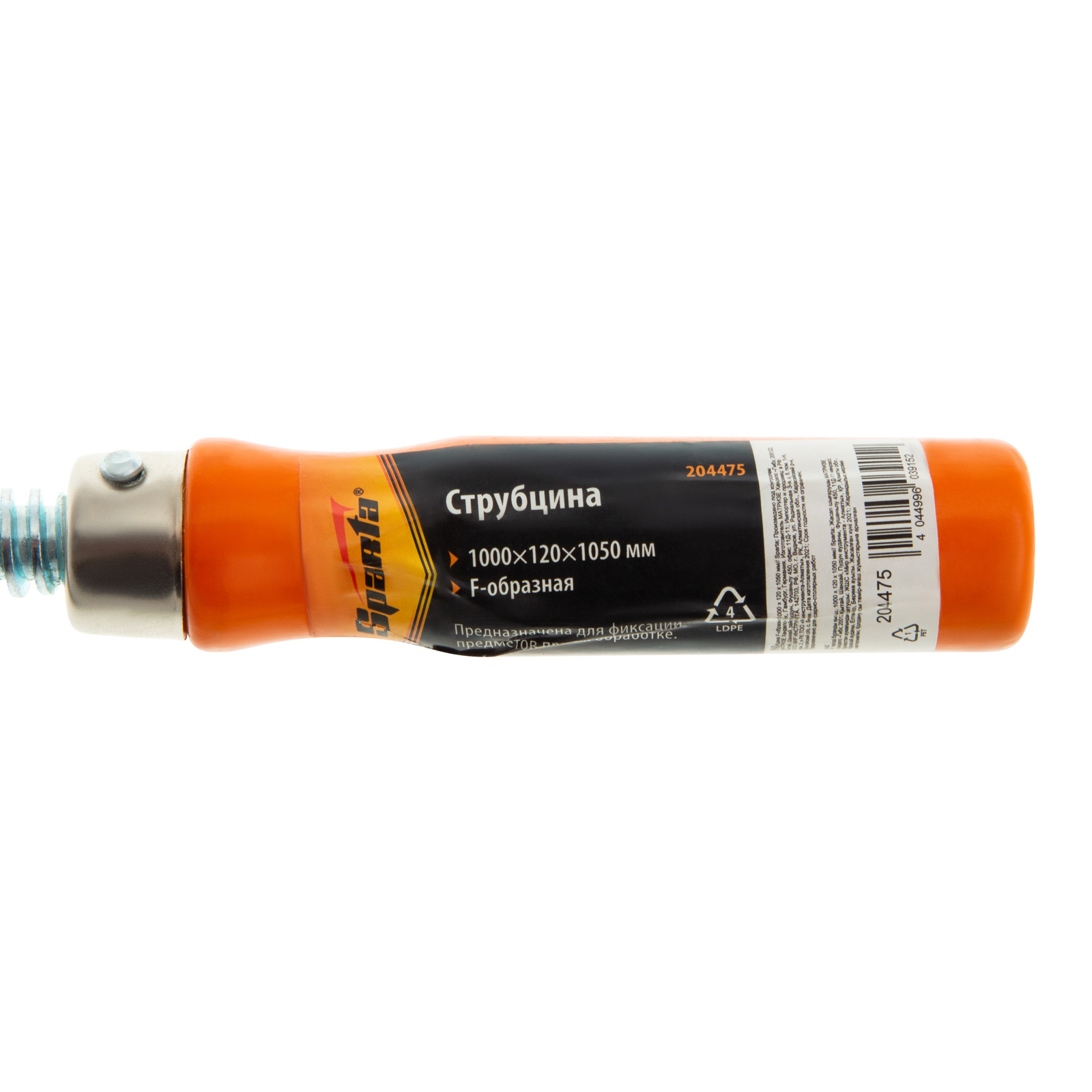 F-образная струбцина Sparta 204475, 1000 х 120 х 1050 мм, используется в столярном и слесарном деле и позволяет фиксировать заготовки из металла, древесины и других материалов для их соединения или обработки. Деталь помещают между губками, одна из которых подвижна и служит для регулировки величины захвата. Винтовой зажим позволяет прикладывать значительное усилие для надежной фиксации. Защитные накладки предотвращают повреждение детали. Элементы конструкции выдерживают высокую температуру, поэтому струбцина подходит для проведения сварочных работ, при этом пластиковые накладки необходимо снять.