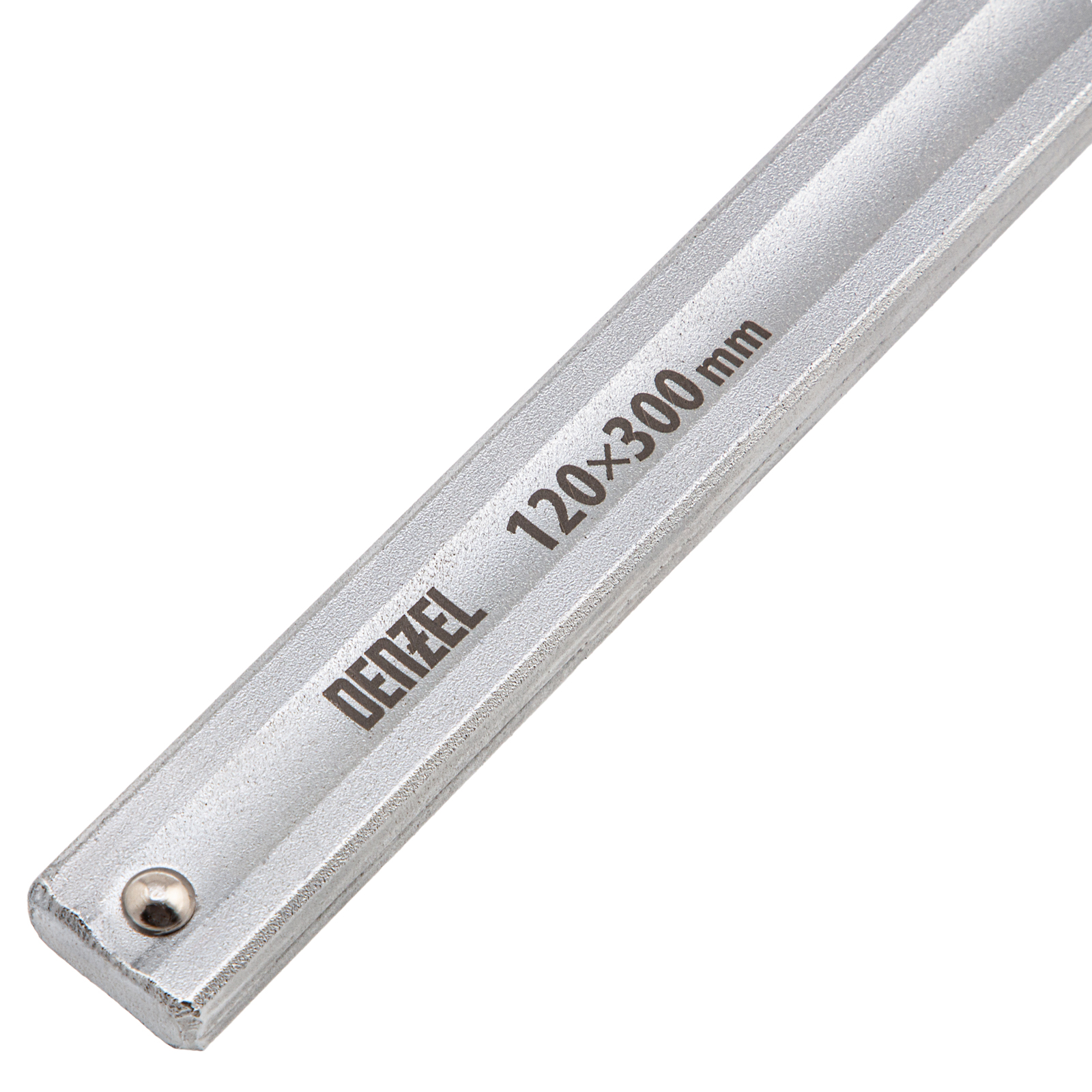 Кованая F-образная струбцина Denzel 20477 с глубиной зажима 120 мм, усиленная, предназначена для фиксации деталей шириной до 300 мм и материалов при проведении слесарных, столярных и сварочных работ. Тавровый профиль обеспечивает устойчивость конструкции к изгибу, что позволяет фиксировать детали со значительным усилием. Струбцина подходит для профессионального применения.