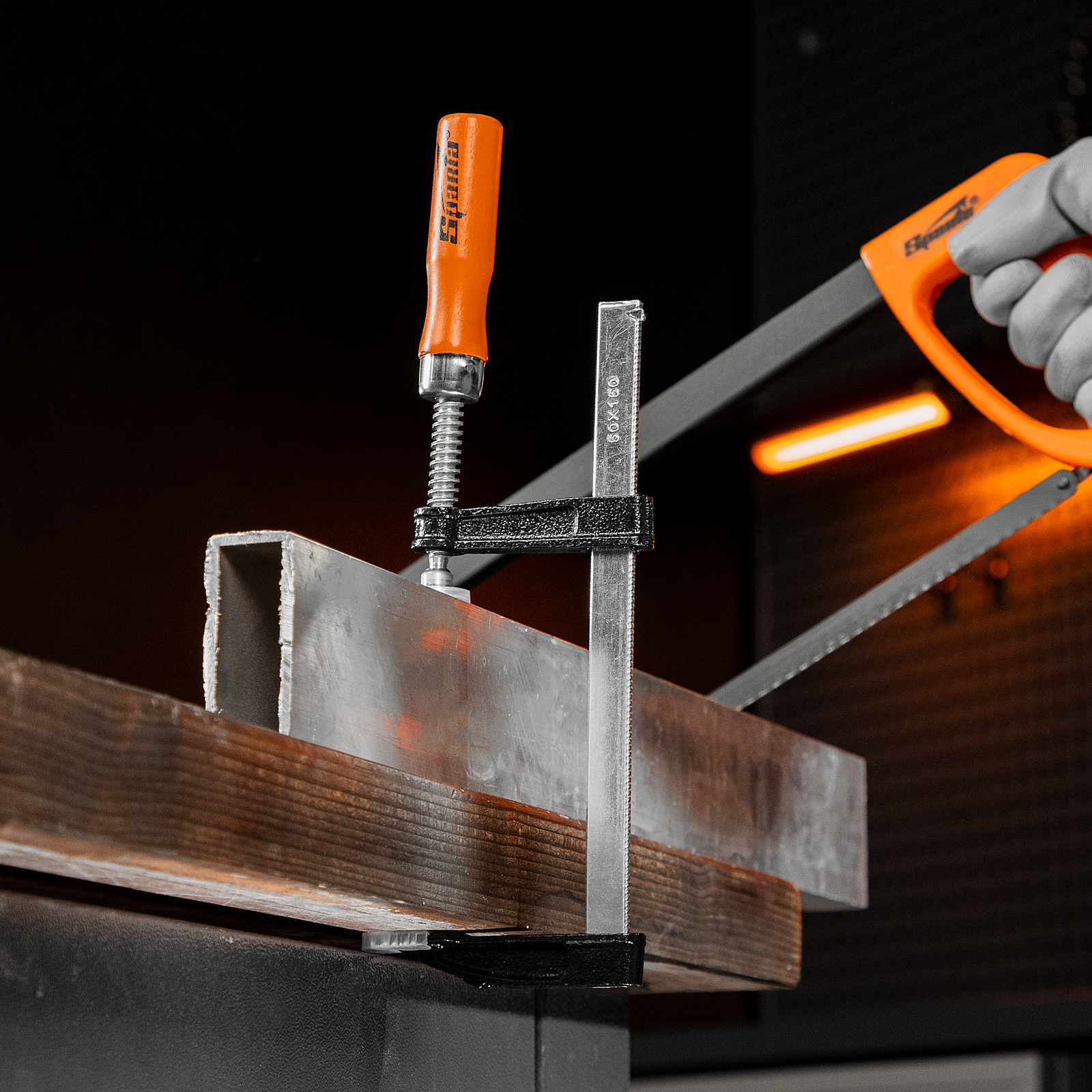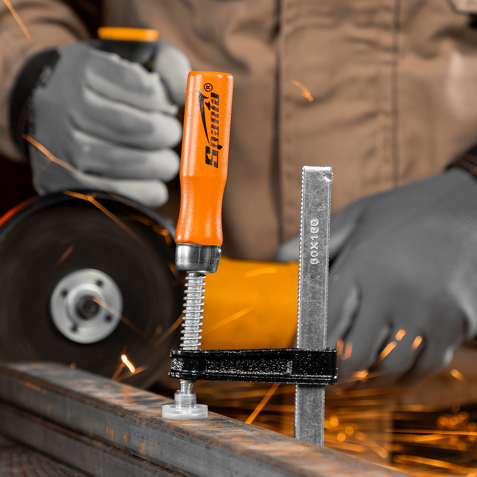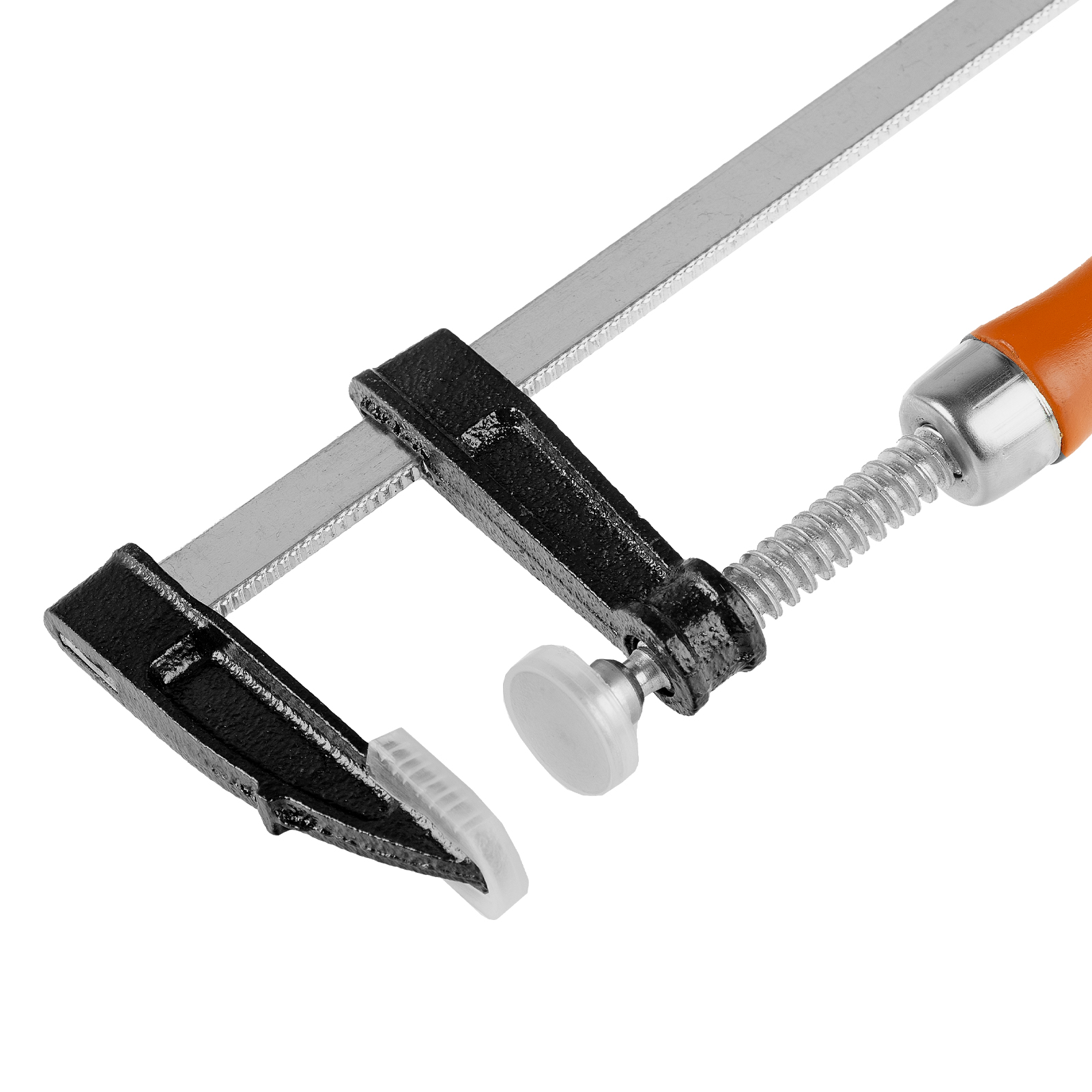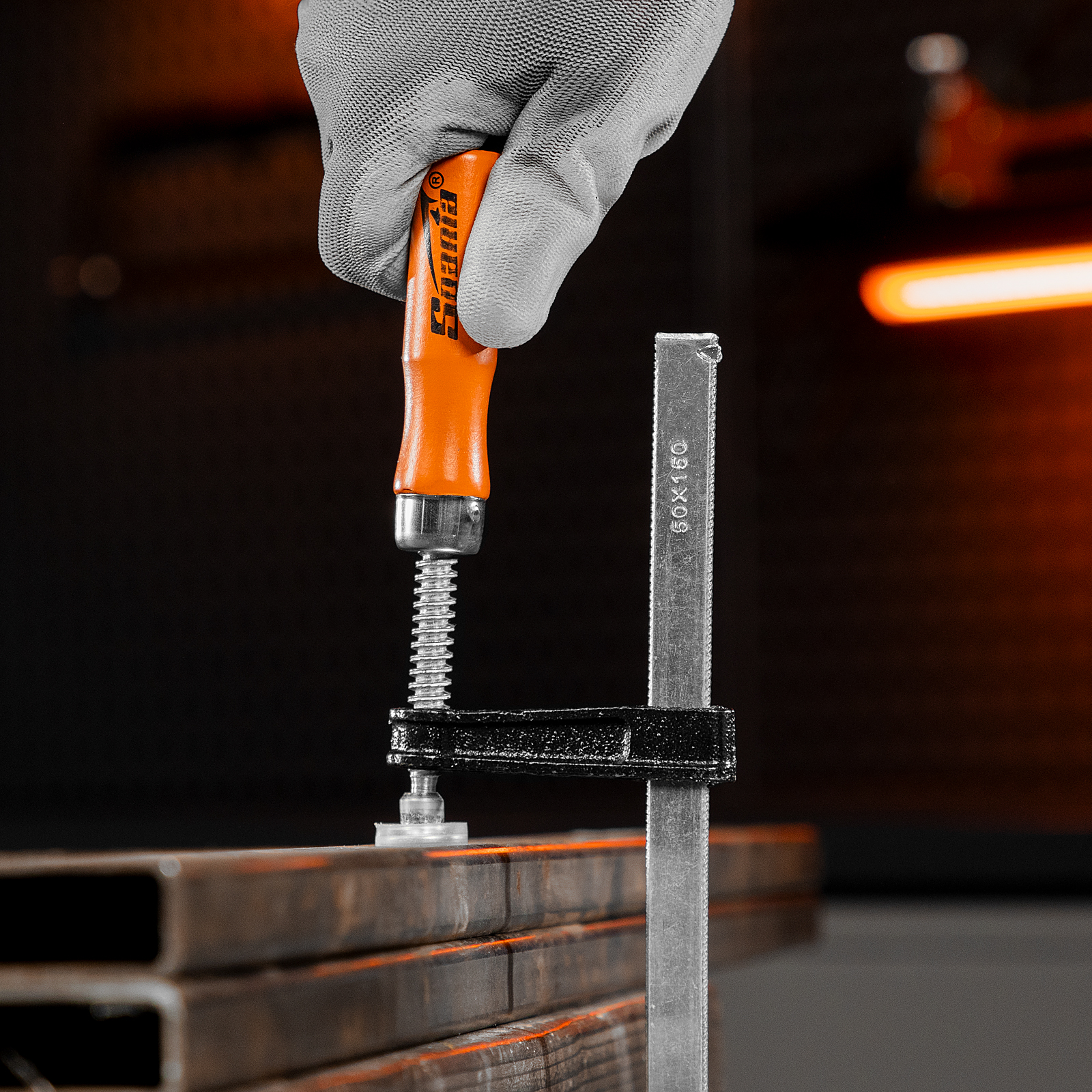 F-образная струбцина Sparta 204235 длиной 200 мм и величиной зажима 150 х 50 мм позволяет фиксировать заготовки из металла, древесины и других материалов для их соединения или обработки. Используется в столярном и слесарном деле. Деталь помещают между губками, одна из которых подвижна и служит для регулировки величины захвата. Винтовой зажим позволяет фиксировать заготовку со значительным усилием. Элементы конструкции выдерживают высокую температуру, поэтому струбцина подходит для проведения сварочных работ, при этом пластиковые накладки необходимо снять.