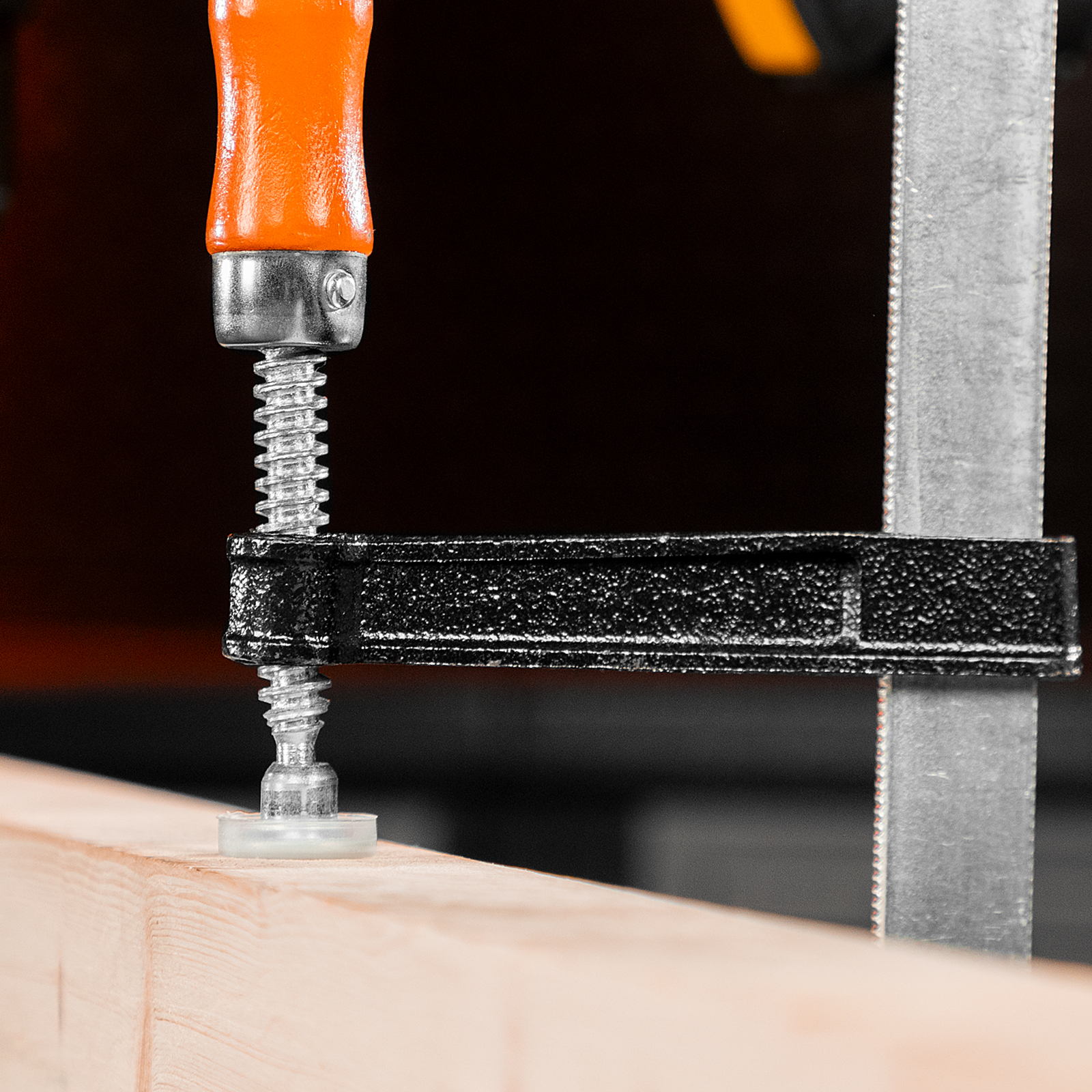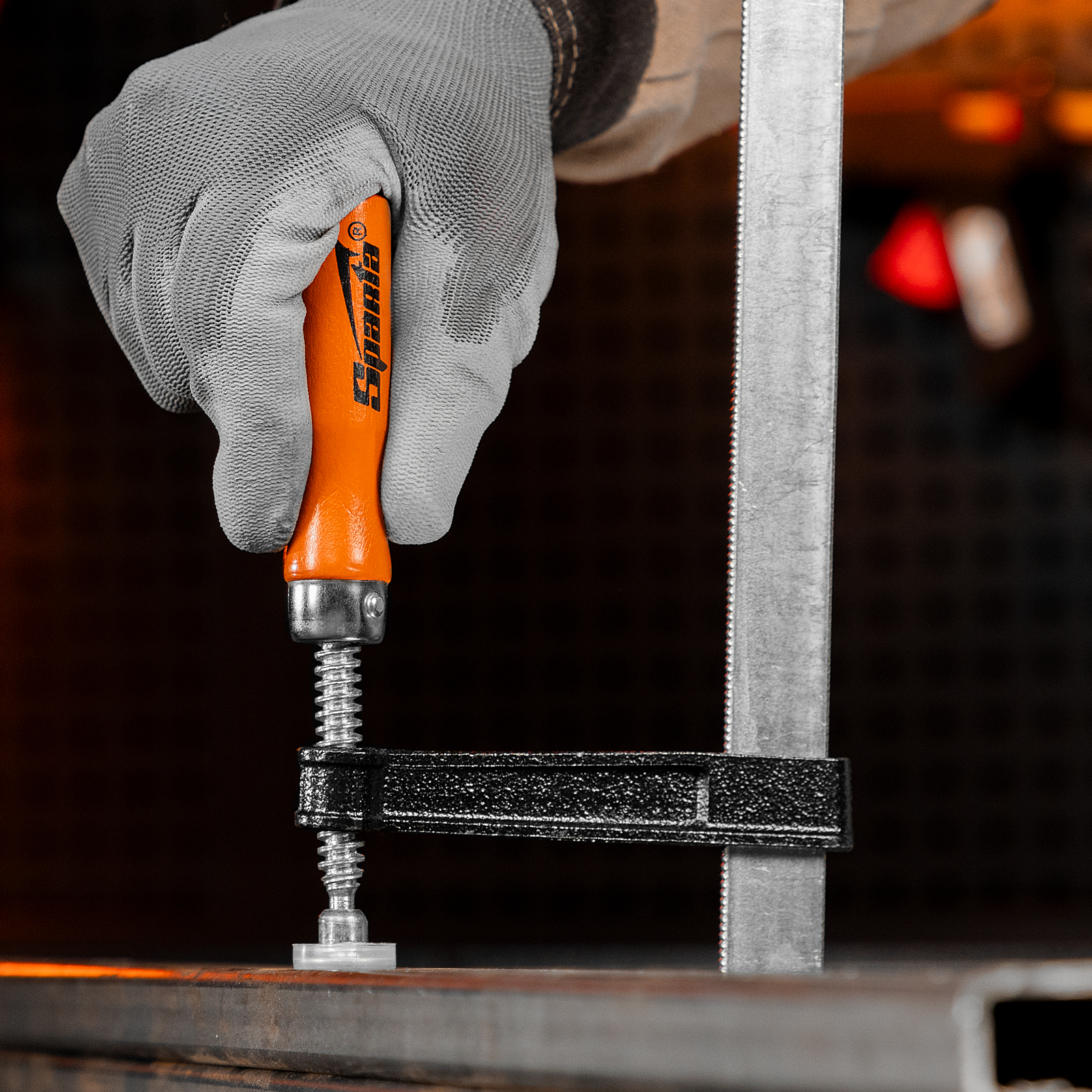 F-образная струбцина Sparta 204355 длиной 360 мм и величиной зажима 300 х 80 мм позволяет фиксировать заготовки из металла, древесины и других материалов для их соединения или обработки. Используется в столярном и слесарном деле. Деталь помещают между губками, одна из которых подвижна и служит для регулировки величины захвата. Винтовой зажим позволяет фиксировать заготовку со значительным усилием. Элементы конструкции выдерживают высокую температуру, поэтому струбцина подходит для проведения сварочных работ, при этом пластиковые накладки необходимо снять.