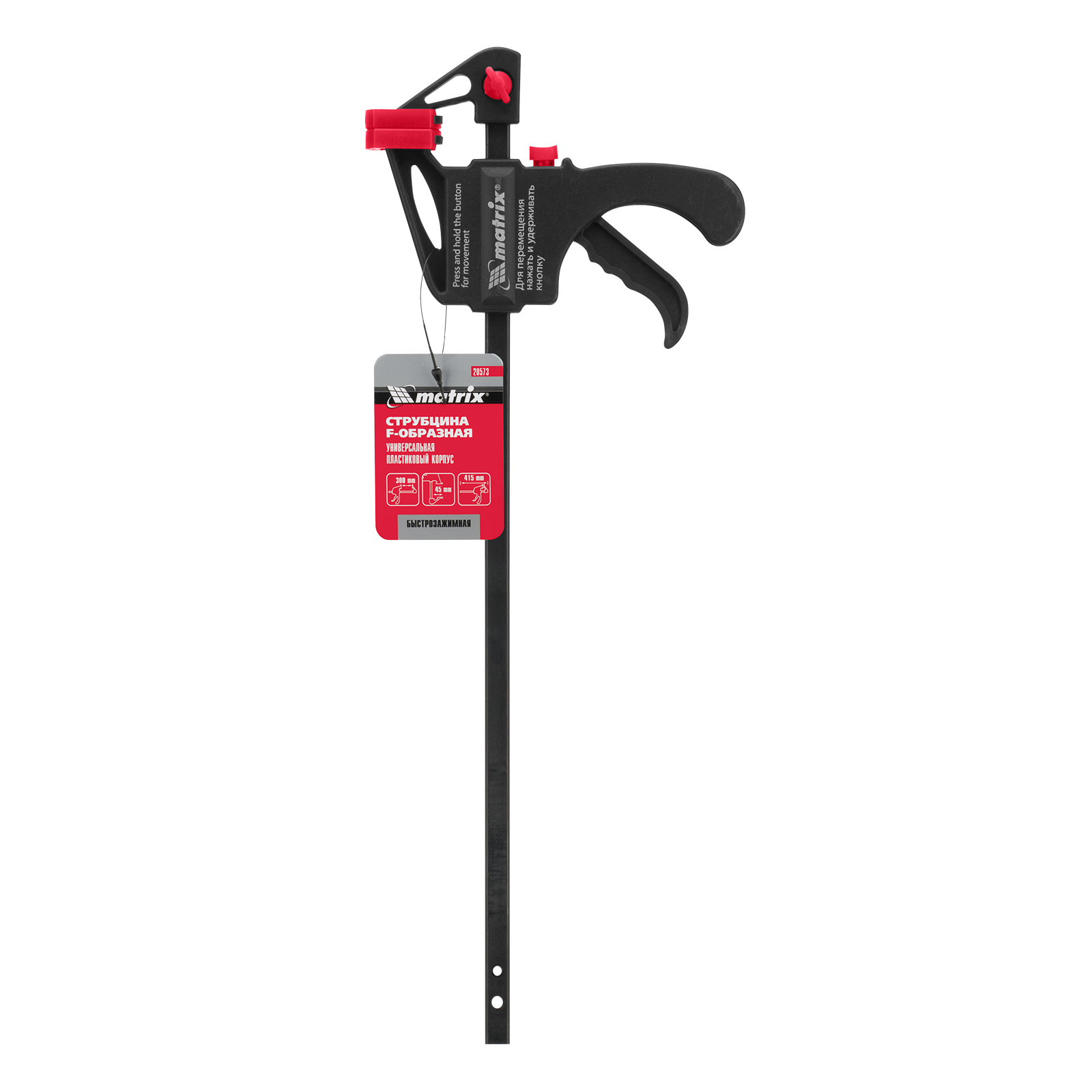 Универсальная F-образная быстрозажимная струбцина Matrix 20573 размером 300 х 415 х 45 мм, в пластиковом корпусе, используется в столярном деле. Позволяет быстро и надежно фиксировать заготовки с целью для последующего склеивания, сверления, шлифовки, пиления и другой обработки. Компактный размер упрощает работу с инструментом.