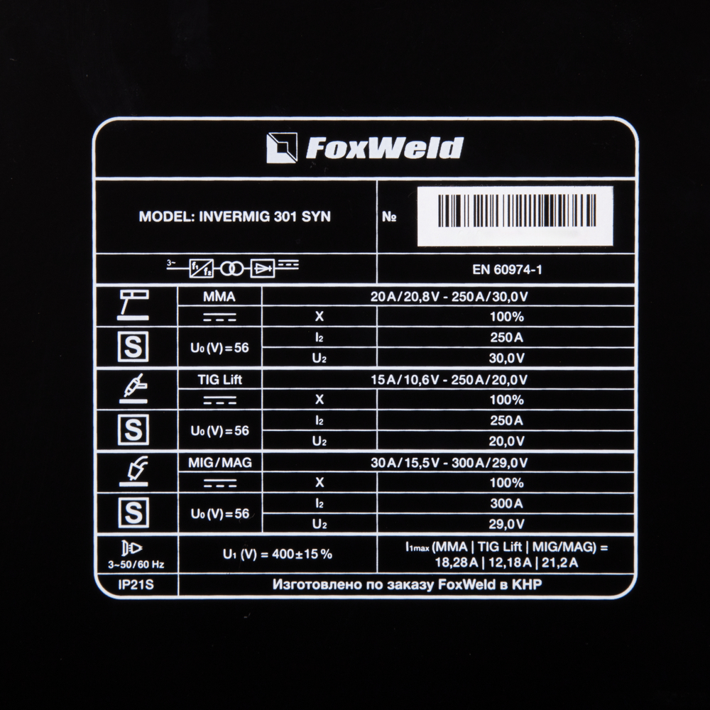 FOXWELD INVERMIG 301 SYN — промышленный многофункциональный трёхфазный синергетический инвертор, позволяющий производить сварку изделий из низкоуглеродистой и легированной стали и алюминия. Аппарат выполнен в едином корпусе со встроенным мощным 4-роликовым механизмом подачи проволоки, рассчитанным для использования катушек D200 (5кг) и D300 (15 кг). 2 цифровых дисплея на панели управления, мощная ручка на корпусе, платформа на колёсах для перемещения с местом для установки баллона с газом – в аппарате есть всё для проведения сварочных работ в сервисных металлоцентрах и при монтаже различных металлоконструкций.РАБОТА БЕЗ ОСТАНОВКИ: ПВ 100% на максимальном токе при КПД 85% обеспечивает бесперебойную устойчивую работу на протяжении всего трудового дня. На задней панели расположена розетка 36 В для подключения подогревателя газа, который необходим для защиты обледенения редуктора во время продолжительной работы.МНОГОФУНКЦИОНАЛЬНОСТЬ 3-В-1: Благодаря своей многофункциональности, аппарат позволяет проводить следующие процессы сварки: полуавтоматическую сварку сплошной проволокой в среде защитных газов с ручным режимом настройки параметров сварки, с синергетическим управлением параметрами сварки (MIG/MAG), полуавтоматическую сварку самозащитной проволокой без использования защитного газа, ручную дуговую сварку штучным электродом с покрытием (ММА), аргонодуговую сварку на постоянном токе с возбуждением дуги касанием вольфрамового электрода (TIG LIFT).СИНЕРГЕТИЧЕСКИЙ РЕЖИМ УПРАВЛЕНИЯ: Полностью синергетическое управление "одной кнопкой". Режим синергетики позволяет сэкономить время и получить качественное сварное соединение даже новичку, так как основные сварочные параметры подбираются автоматически. С помощью синергетического режима управления можно легко и быстро настроить аппарат под любую задачу. Преимущества синергетики: простота в настройке даже неквалифицированным персоналом, быстрая установка сварочных параметров, высокая производительность, гарантированное получение качественного сварного соединения. Синергетику можно отключить для работы в ручном режиме.4-РОЛИКОВЫЙ МЕХАНИЗМ ПОДАЧИ: 4-роликовый механизм подачи с 4-мя ведущими роликами подаёт проволоку в область сварки без проскальзывания и рывков при использовании длинных сварочных горелок, что обеспечивает меньшее давление и деформацию сварочной проволоки. Механизм подачи с 4-мя ведущими роликами отлично подходит для сварочной порошковой проволоки, проволоки, сделанной из алюминия, и даёт дополнительные преимущества при производстве и в монтажных условиях. Подача проволоки осуществляется с высокой точностью и надёжностью, что влияет на производительность, качество сварочного шва и время использования сварочного аппарата.ФУНКЦИЯ VRD: Функция VRD (снижение напряжения холостого хода) повышает безопасность и исключает риск поражения сварщика электрическим током. Сварочный процесс становится более безопасным в замкнутых пространствах и при сварке в условиях повышенной влажности.ПРЕИМУЩЕСТВА:Синергетический режим управленияАргонодуговая сварка (TIG LIFT) на постоянном токеСварка без газа самозащитной проволокойСинергетический режим управленияРежим работы горелки 2Т / 4Т / Special 4TФункции Hot Start (Горячий Старт), AntiSticking (Антизалипание) и Arc Force (Форсаж Дуги)Функция VRD (сниж