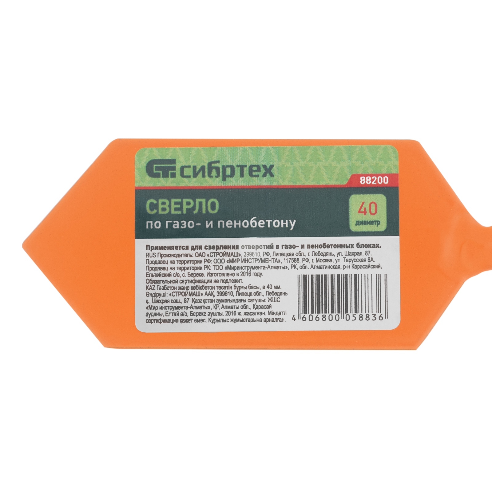 Сверло Сибртех 88200 диаметром 40 мм используется для получения отверстий в газо- и пенобетоне. Оснастка рассчитана на бытовое использование и подходит для выполнения небольшого объема работ.