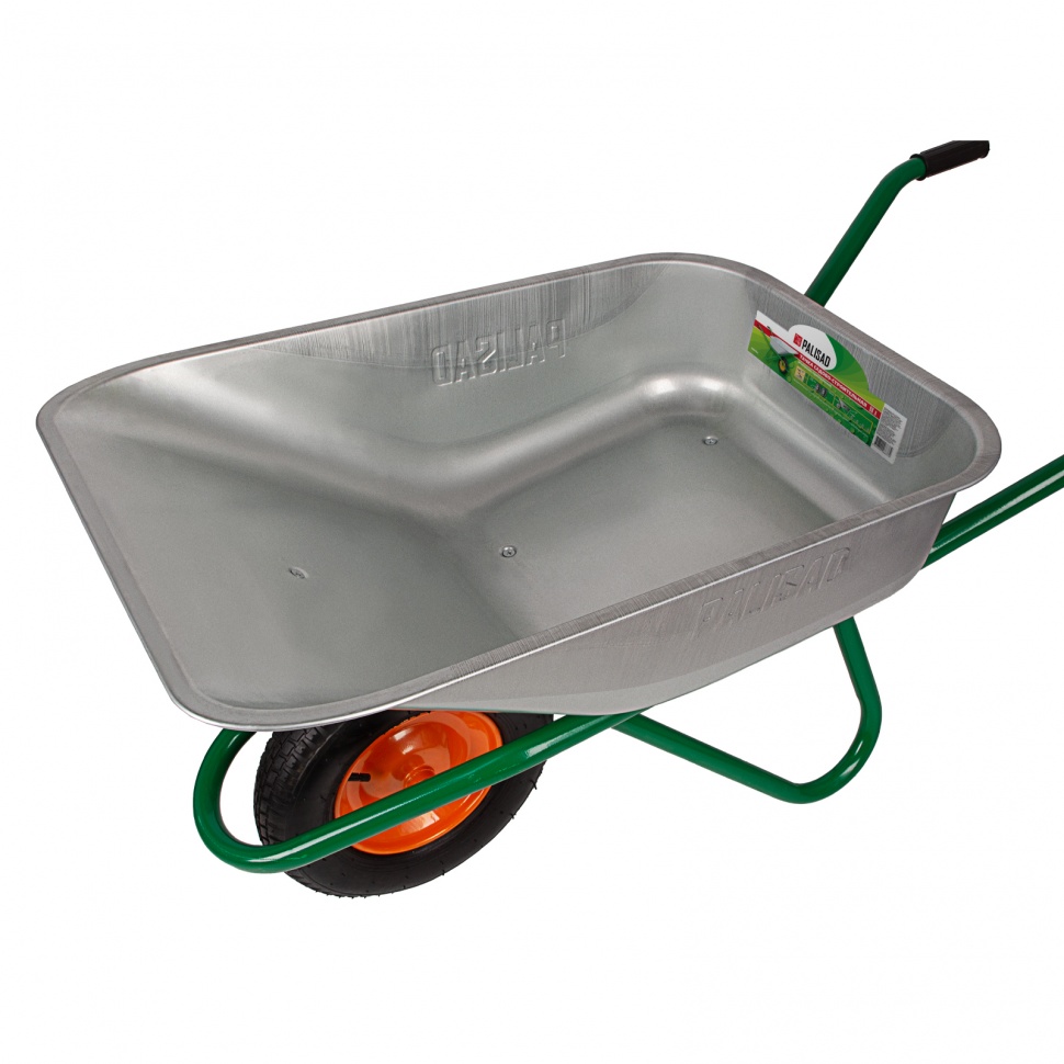 - пневматическое колесо с камерой и резиновой шиной гасит вибрации и обеспечивает плавность хода, что повышает комфортность использования тачки