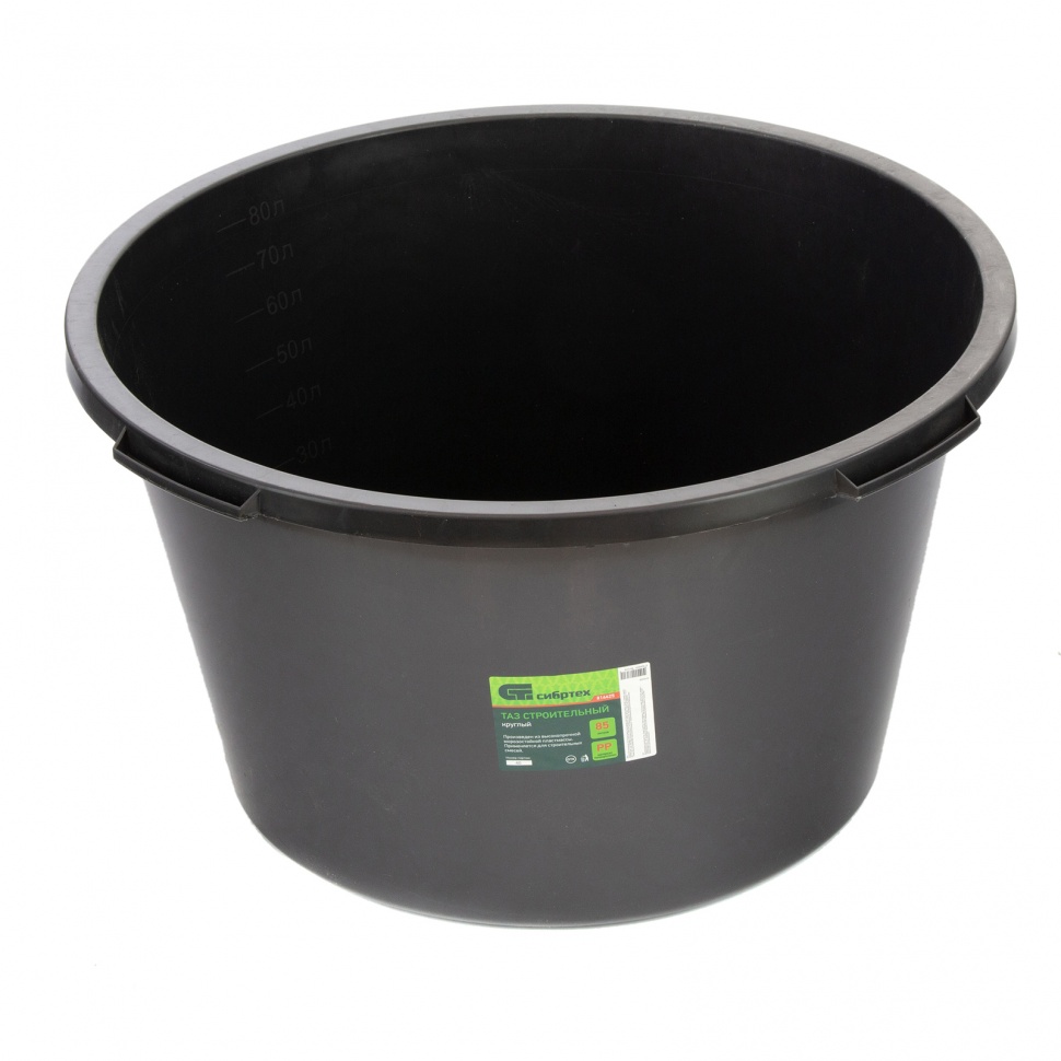 Круглый строительный таз Сибртех 814425 объемом 85 л используется для приготовления штукатурных, шпаклевочных, красящих, клеевых растворов при проведении ремонтных и отделочных работ. Пригодится таз и в быту — в нем удобно хранить и перемещать сыпучие материалы.