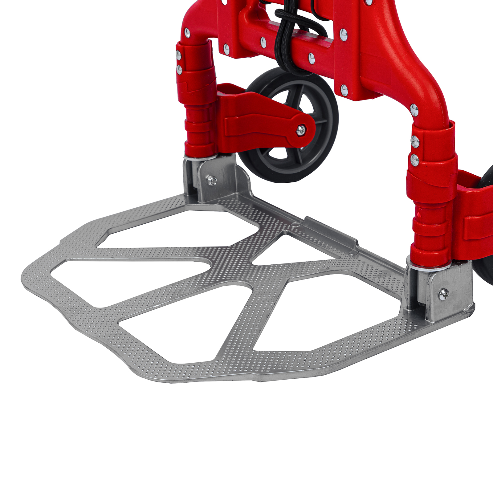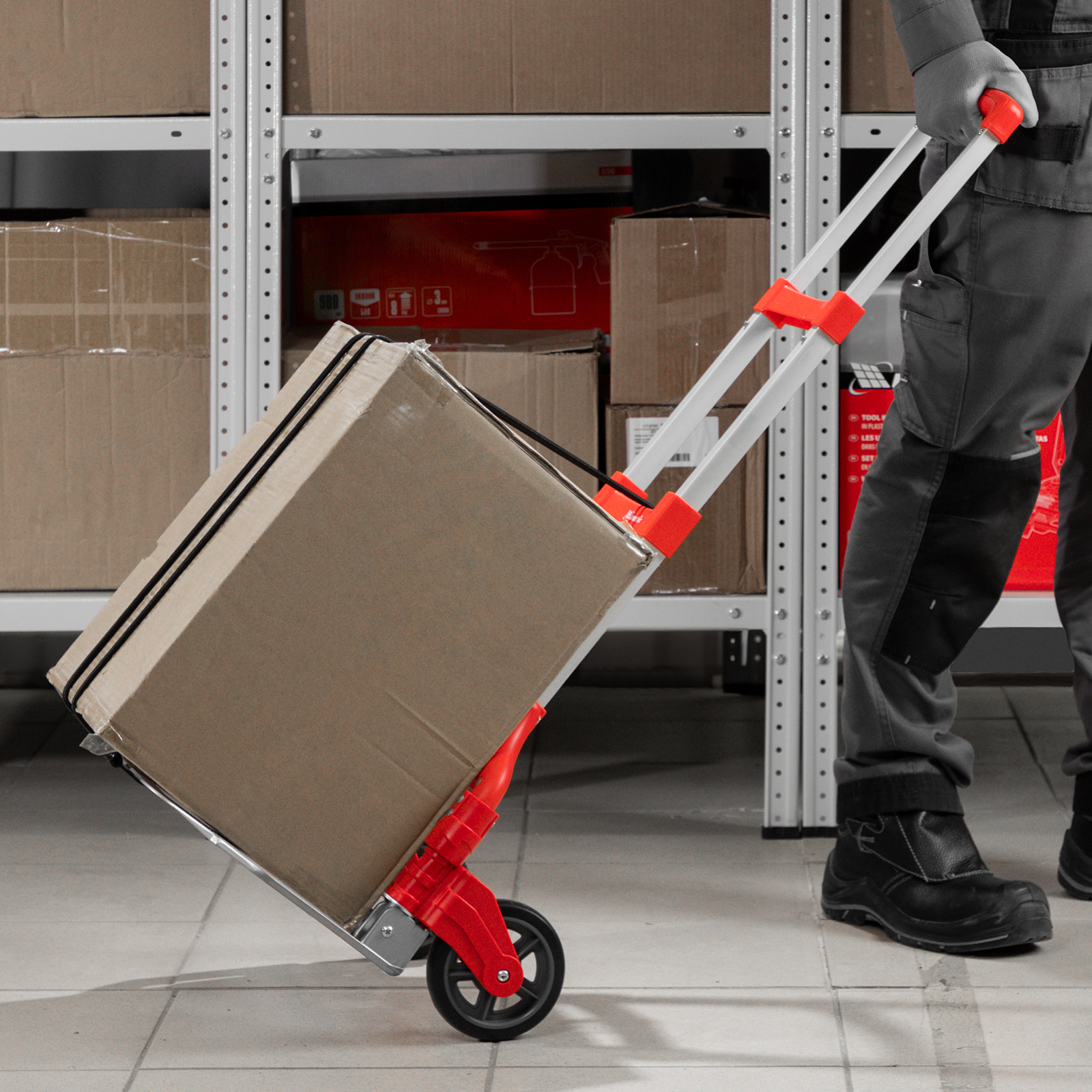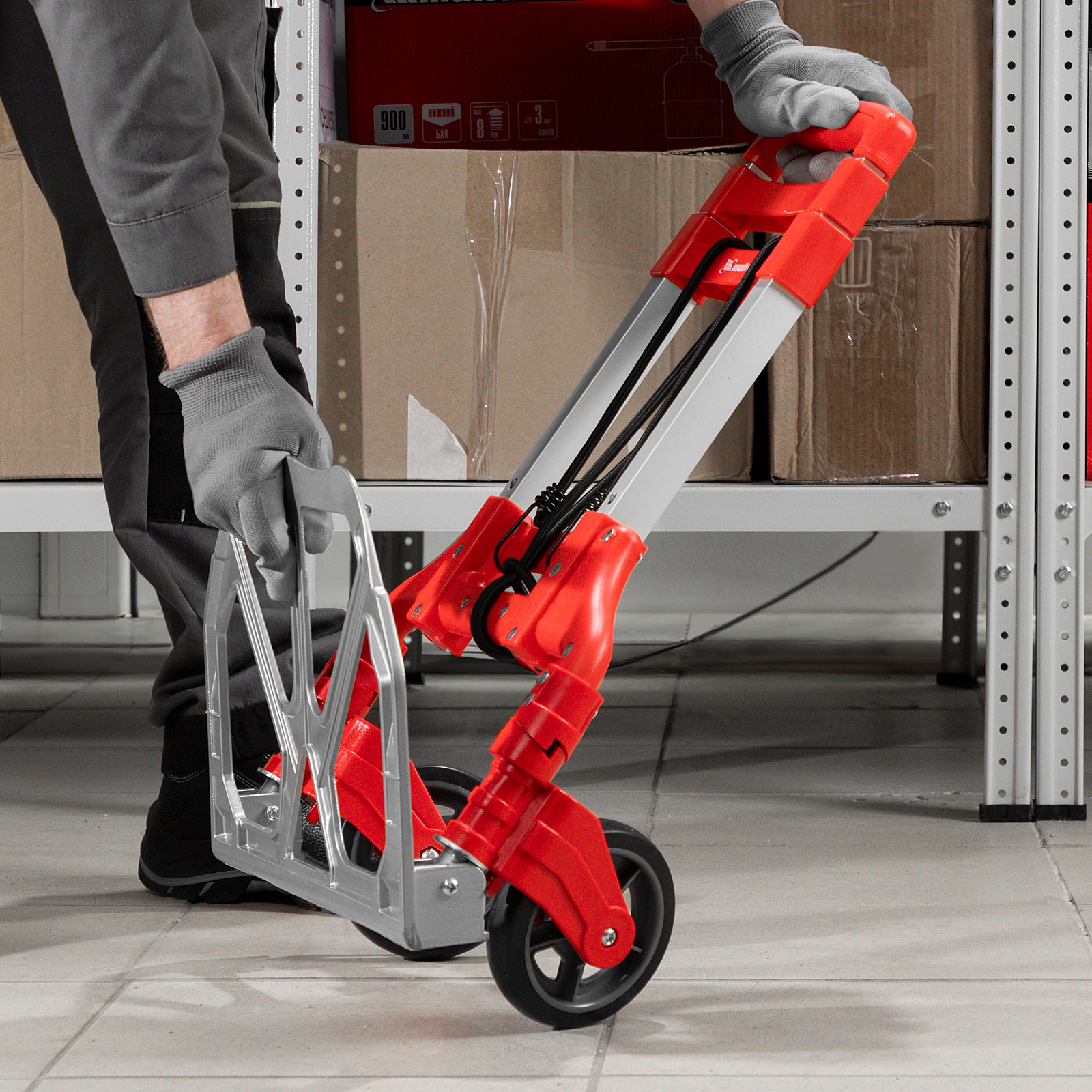 - Удобное хранение и транспортировка — платформа и колеса складываются, поэтому тележка не занимает много места.