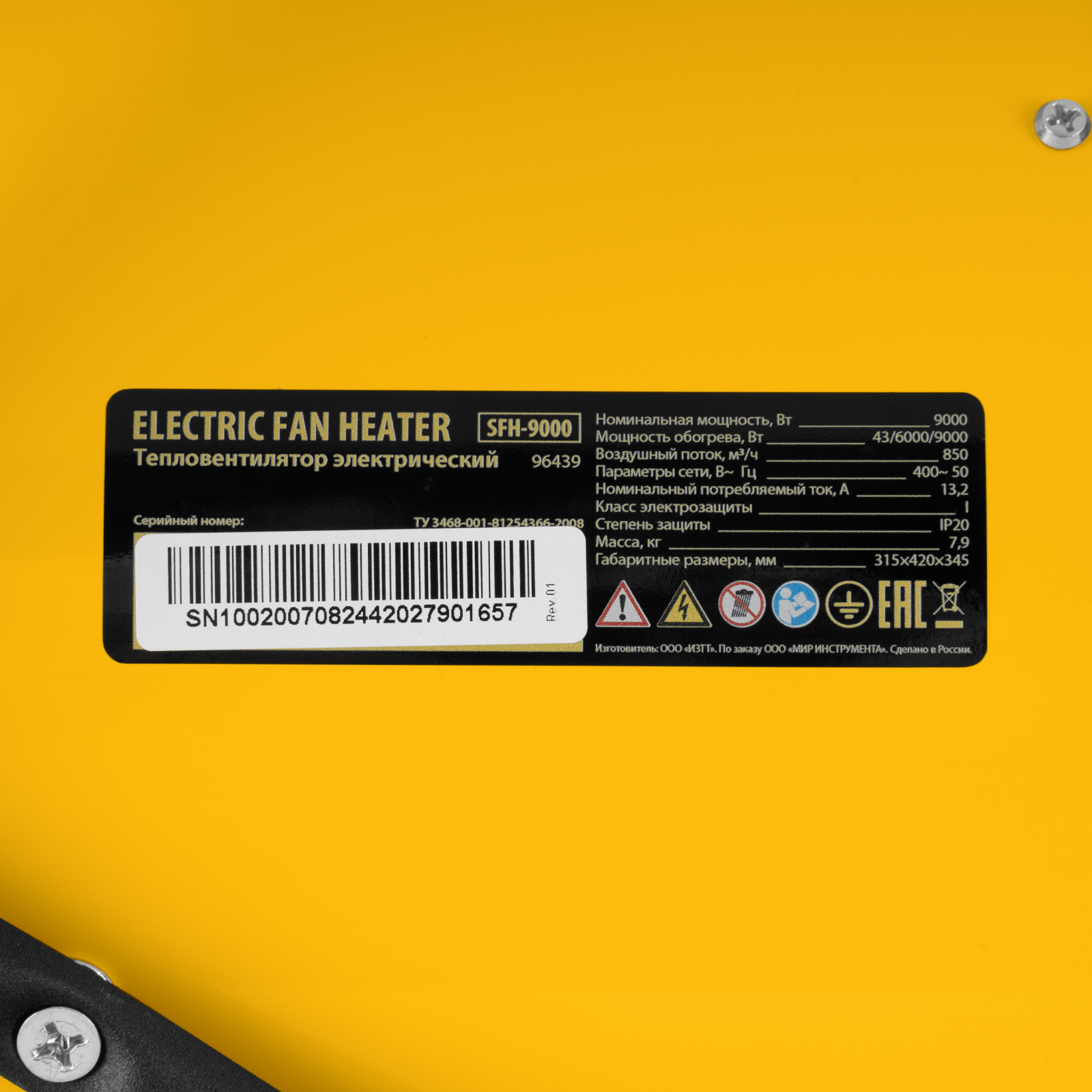 Трехфазная тепловая пушка Denzel SFH-9000 96439 поддерживает 3 режима работы: вентилятор, обогрев на мощности 6000 Вт и 9000 Вт. Предназначена для обогрева и вентиляции помещений площадью до 90 кв. м помещений, а также для просушки предметов и поверхностей. Тепловентилятор увеличенного размера создает теплый воздушный поток, мощность которого составляет 850 м3/ч при максимальной нагрузке. Данная модель оптимально подходит для профессионального применения на строительных объектах, в мастерских и гаражах.