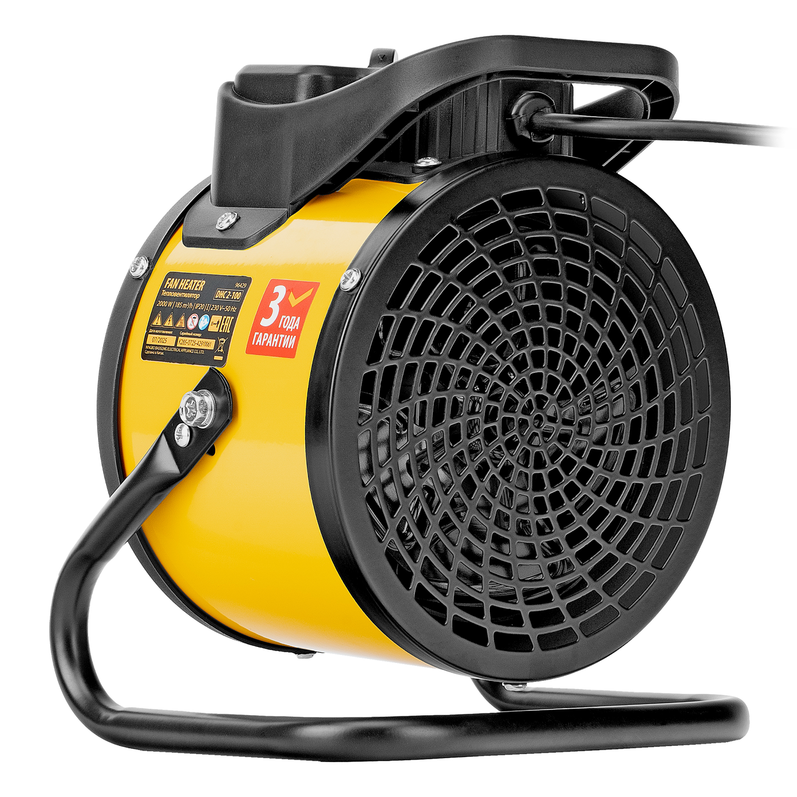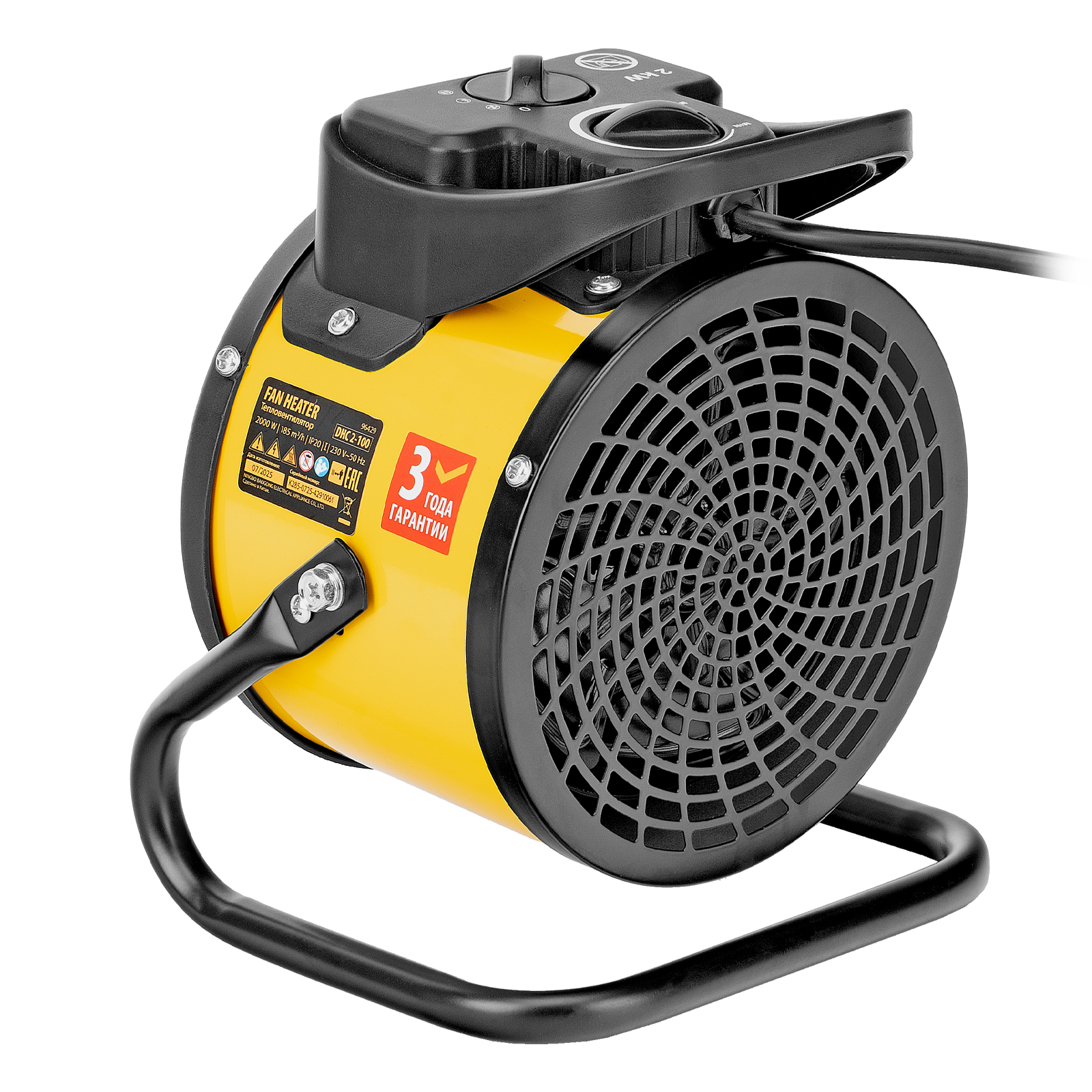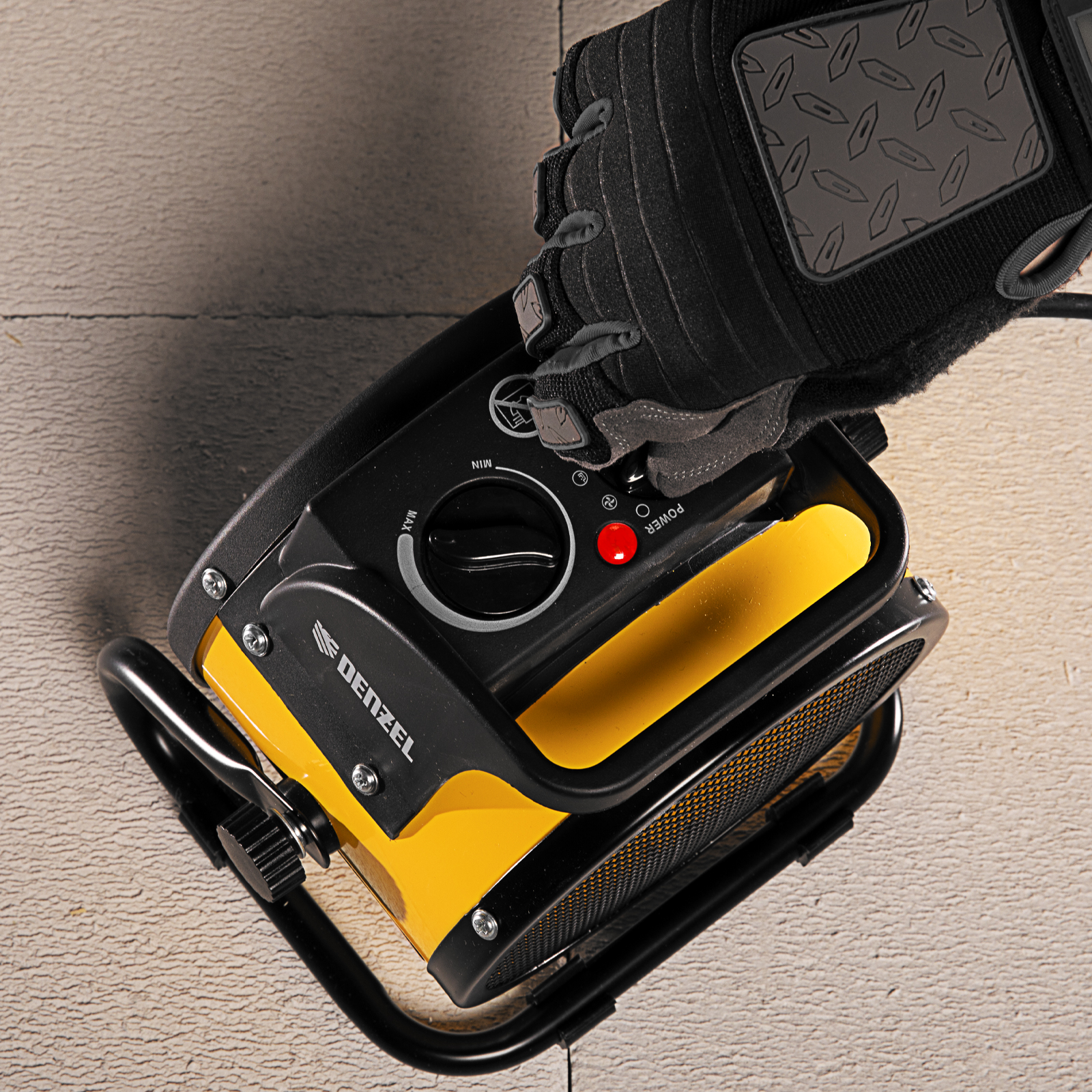 Тепловая пушка Denzel DHC 2-100 96429 работает на мощности 0,025, 1 или 2 кВт. Пригодится в любую погоду: в холод обогреет помещение, а в жару может использоваться в качестве вентилятора. Также тепловентилятор применяется для просушки поверхностей — окрашенных и оштукатуренных стен, стяжек. Максимальной мощности 2 кВт хватит для обогрева помещения площадью до 20 м². Работа пушки не доставляет дискомфорт, безопасна для здоровья людей и животных, поскольку керамический нагревательный элемент не сушит воздух и не выделяет вредных веществ.