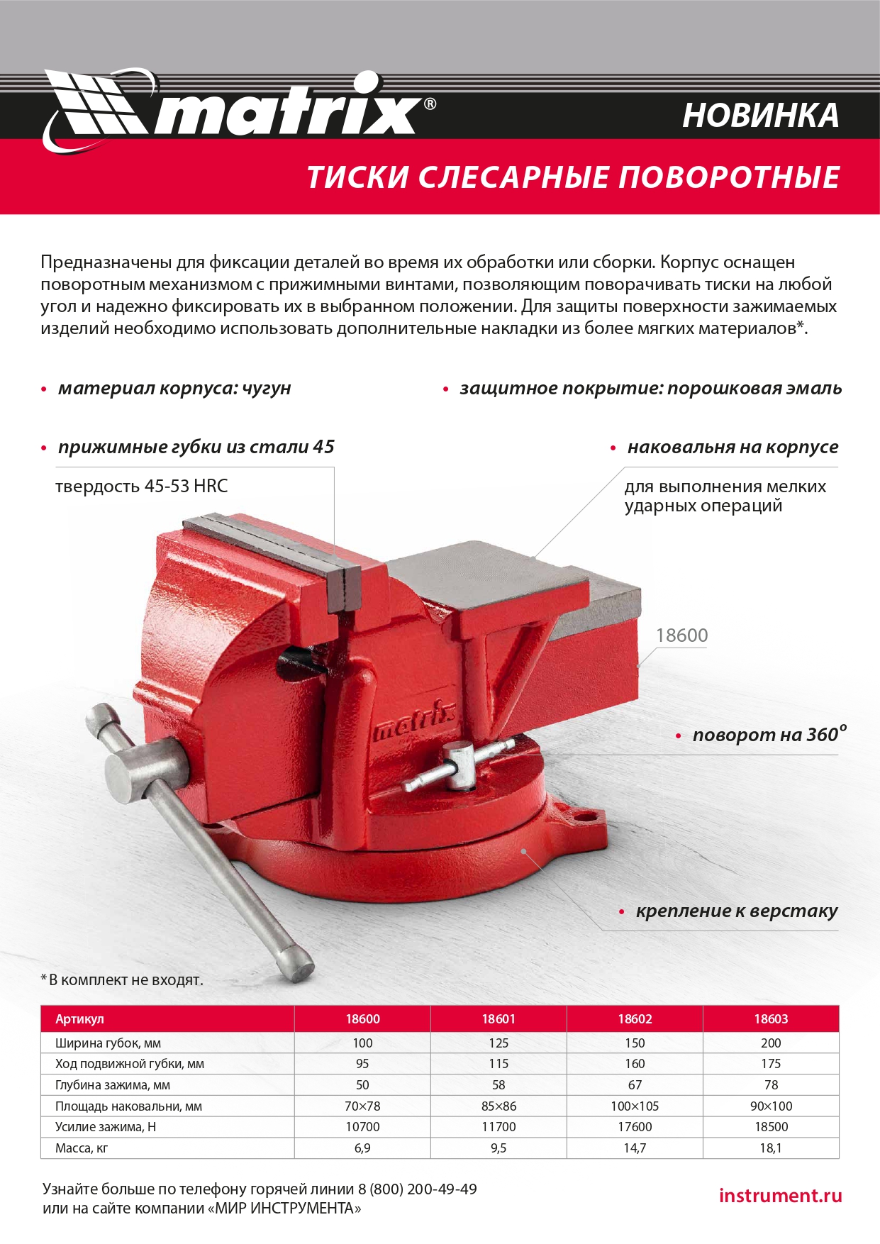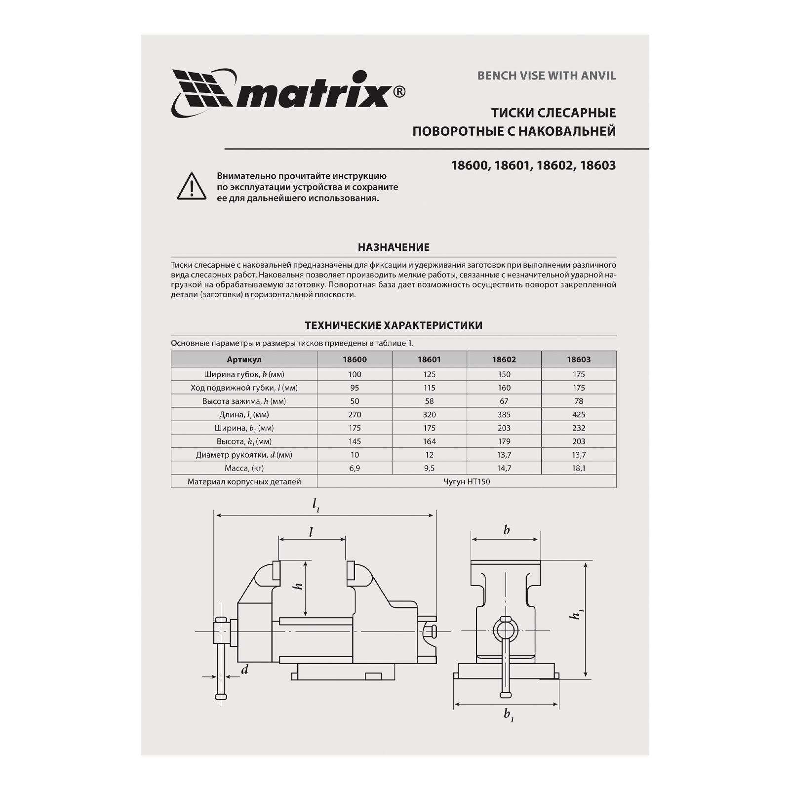 Тиски слесарные, 125 мм, поворотные, с наковальней Matrix в Челябинске