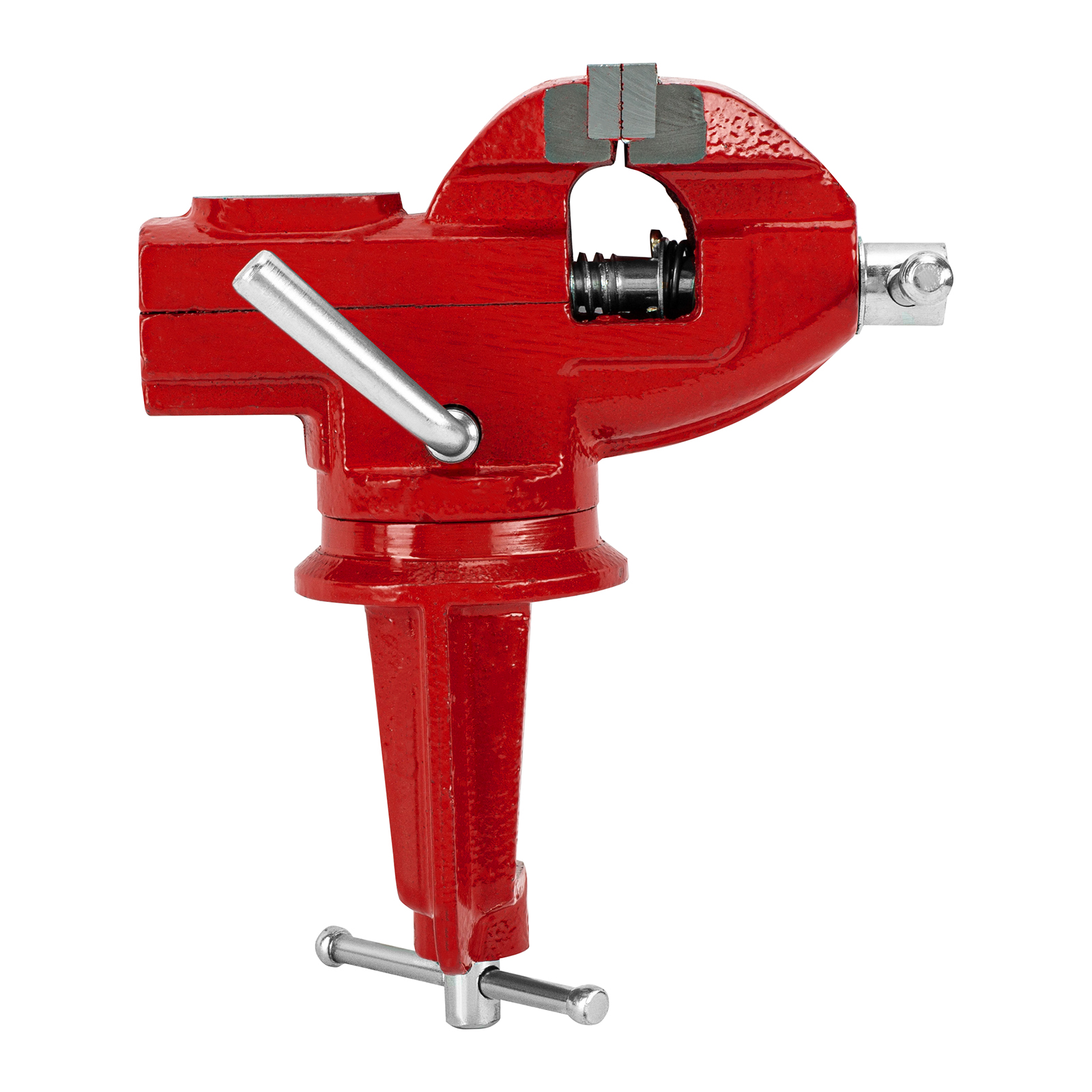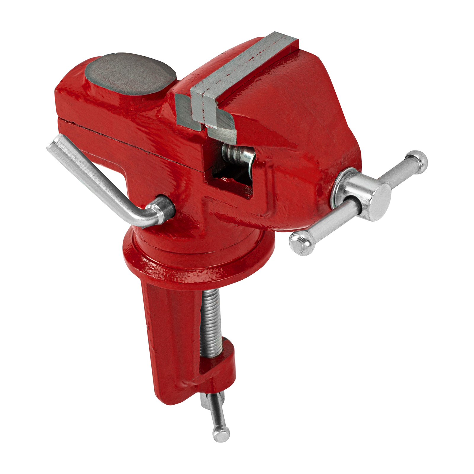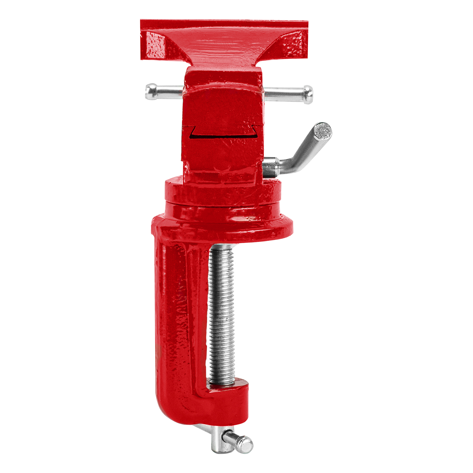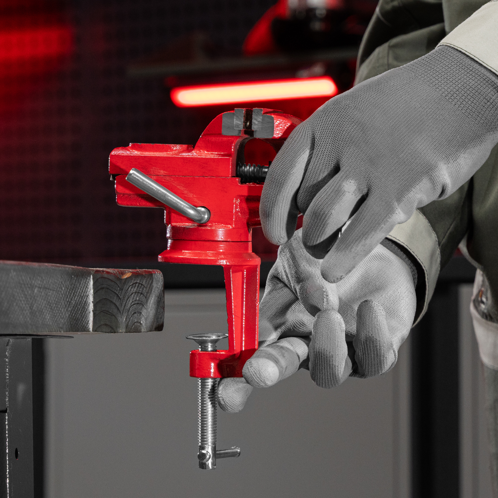 - Простая подготовка к работе — тиски надежно фиксируются на рабочем столе при помощи струбцины с винтовым зажимом.