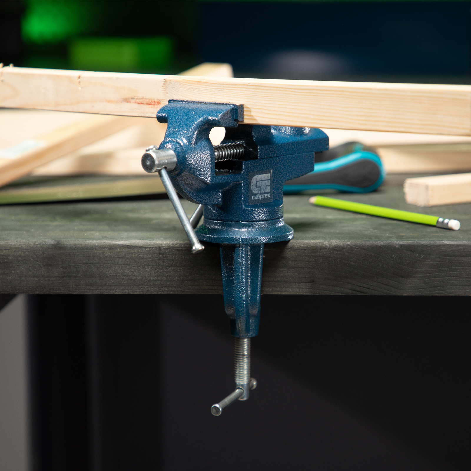 - Винтовой зажим позволяет быстро устанавливать и снимать тиски, поэтому их можно использовать на различных рабочих местах.
