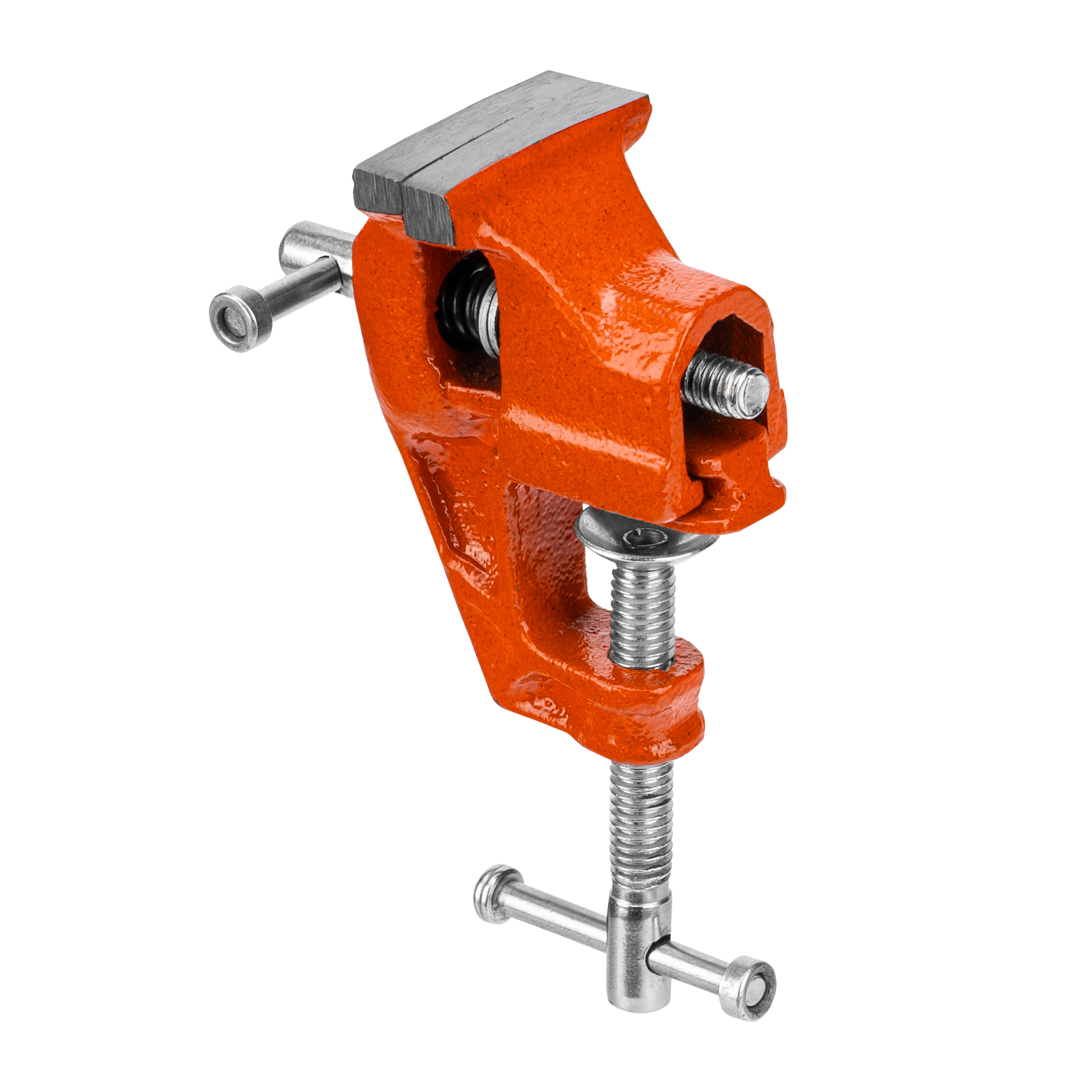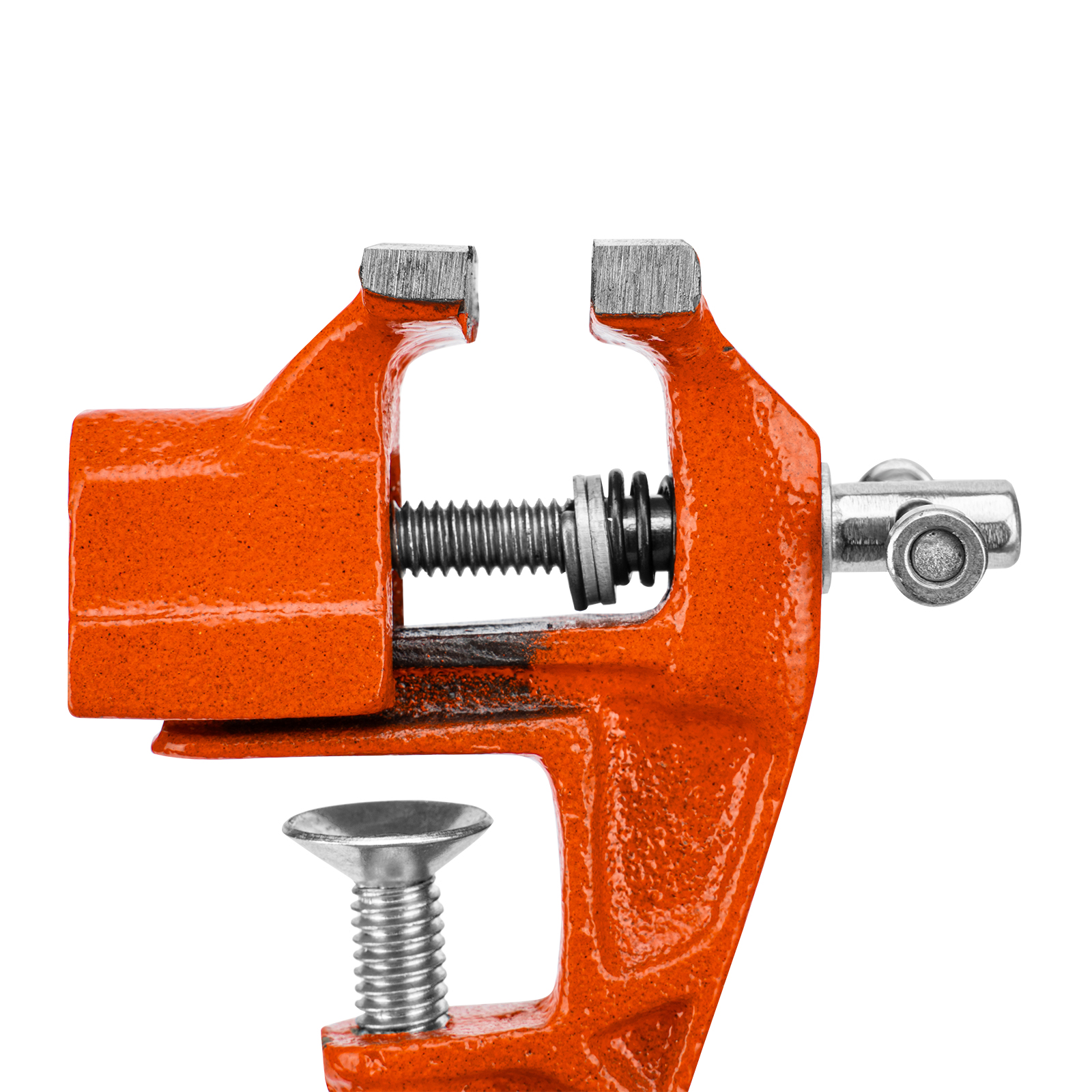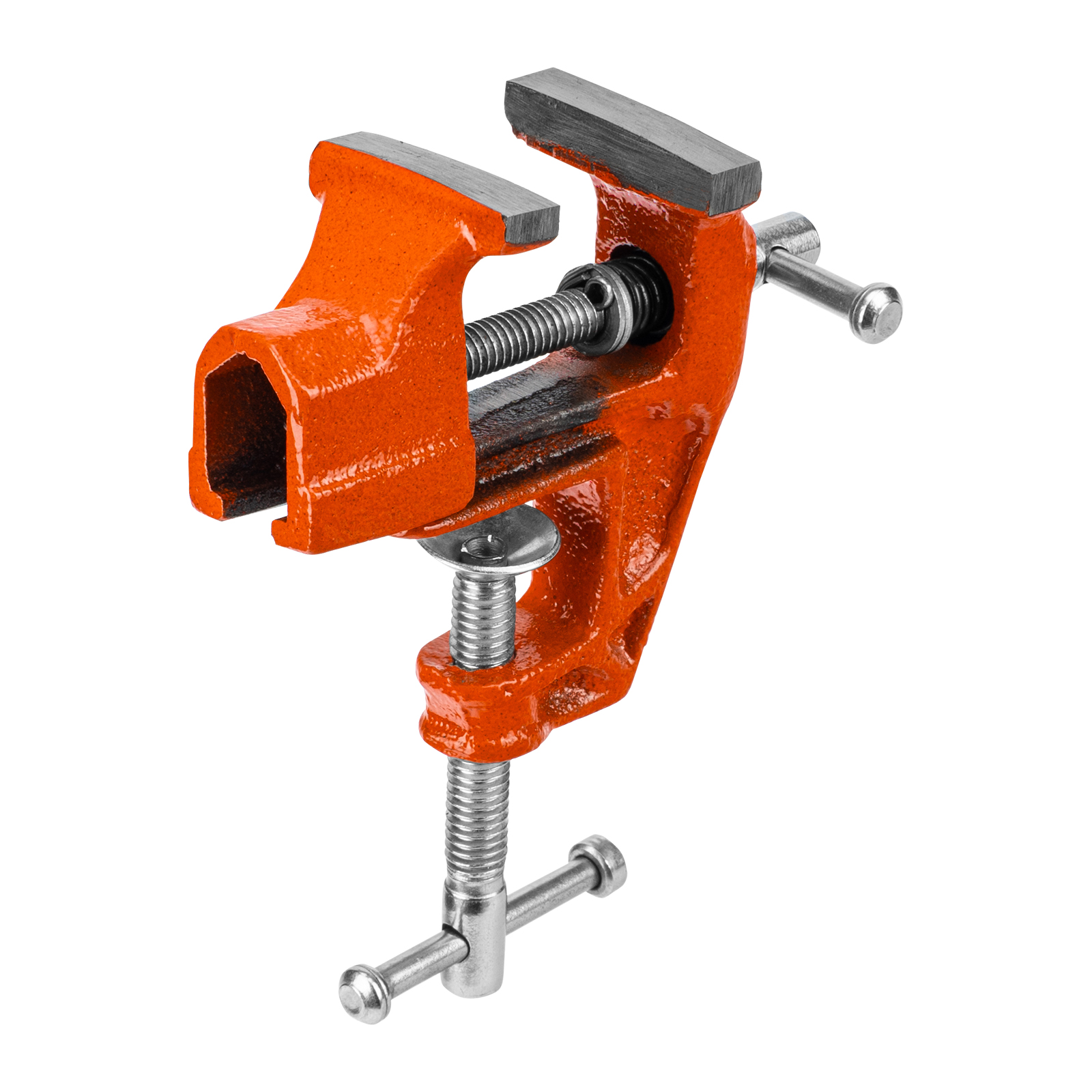 - Простое использование — винтовой зажимной механизм позволяет легко устанавливать и снимать тиски с рабочего стола.