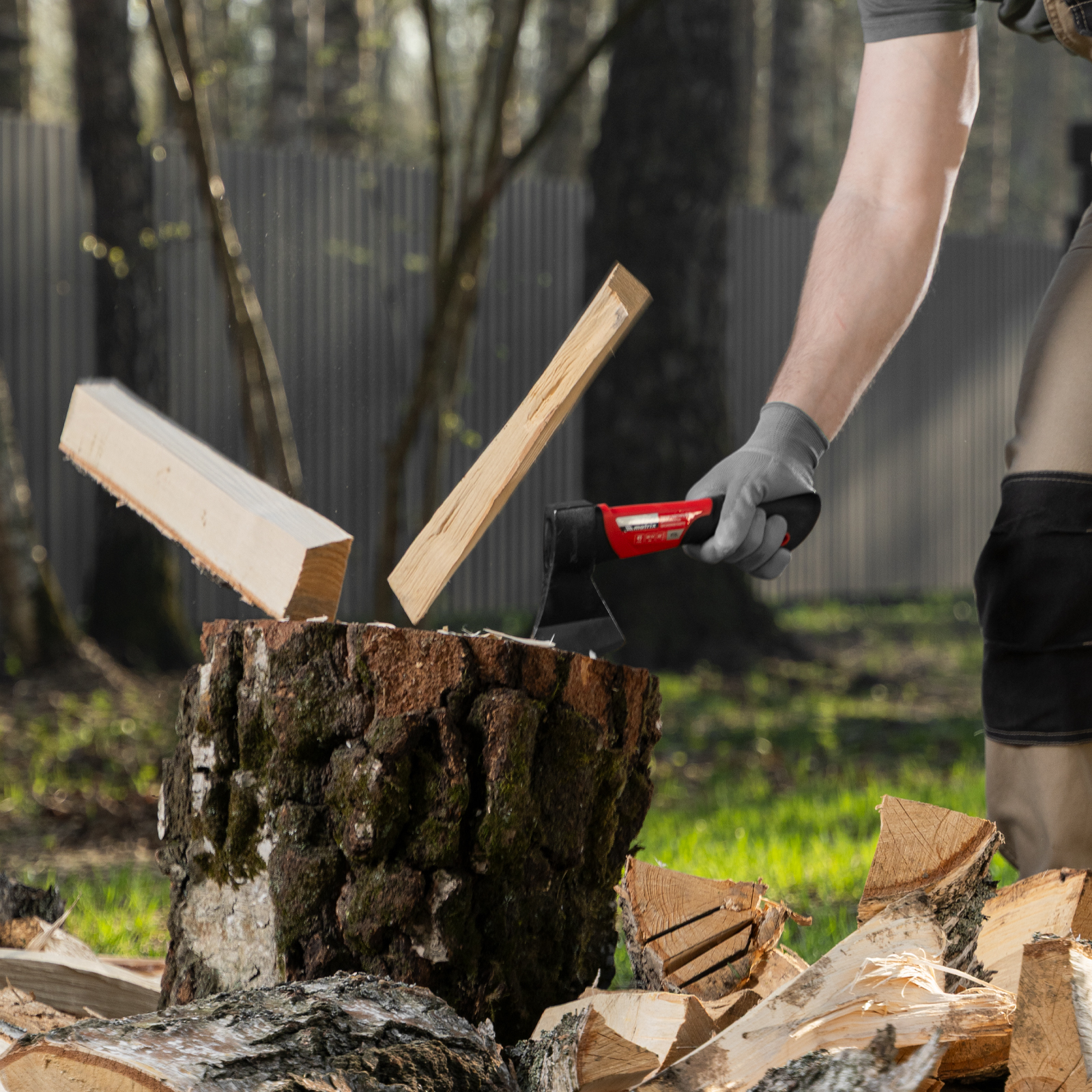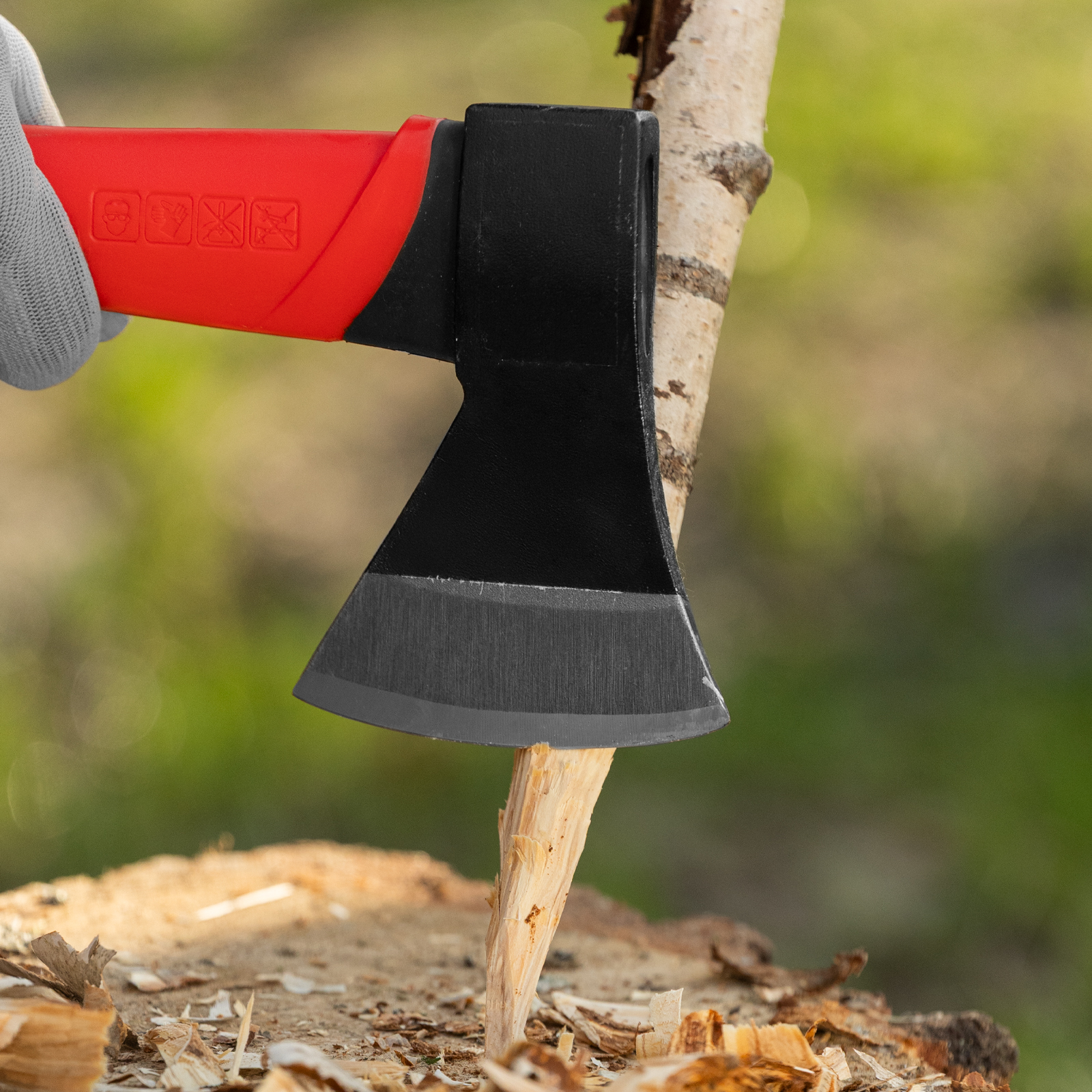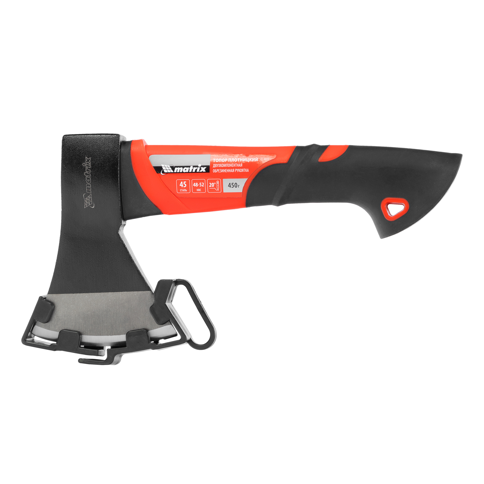 - Безопасное хранение и транспортировка — топор поставляется с защитной пластиковой накладкой на лезвии.