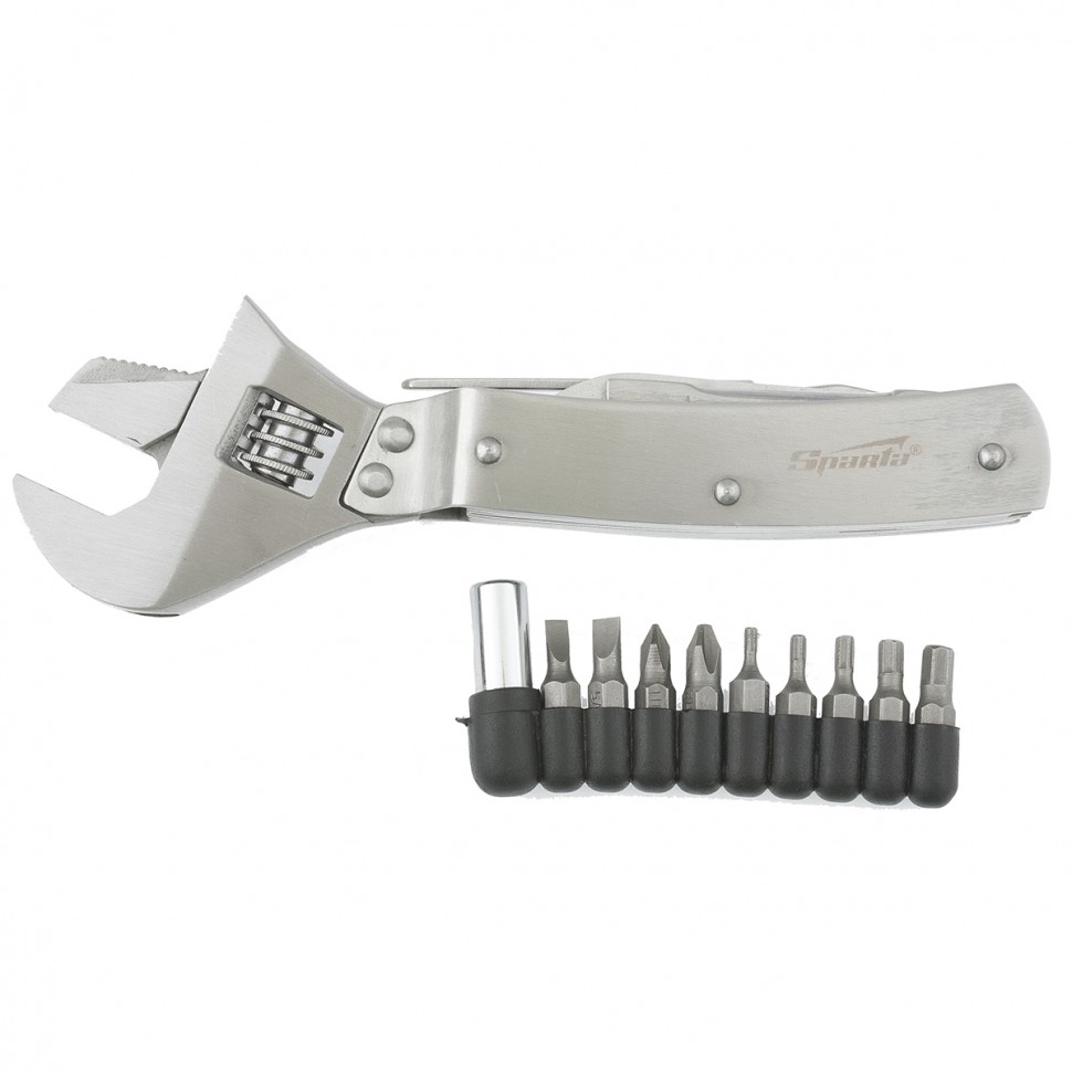 Трансформер Sparta 176065 длиной 170 мм включает в себя 8 предметов и позволяет успешно решать самые разные задачи. Ножом можно разрезать веревку или картон, напильником — заточить рыболовный крючок. Многофункциональный набор включает также разводной ключ, пассатижи и биты, необходимые для выполнения слесарных работ. Его можно использовать дома, на даче, в гараже, а также в походе, на охоте или рыбалке.