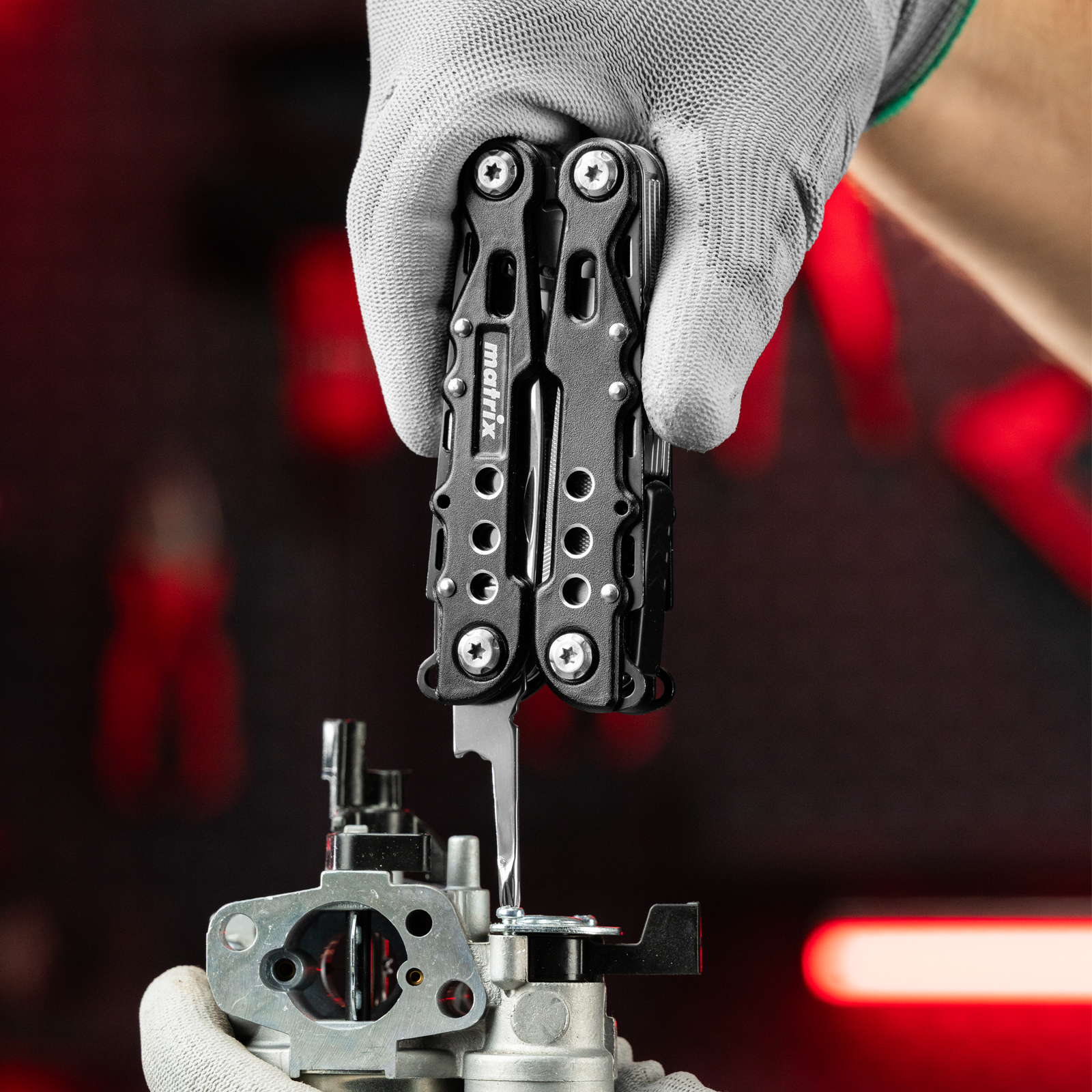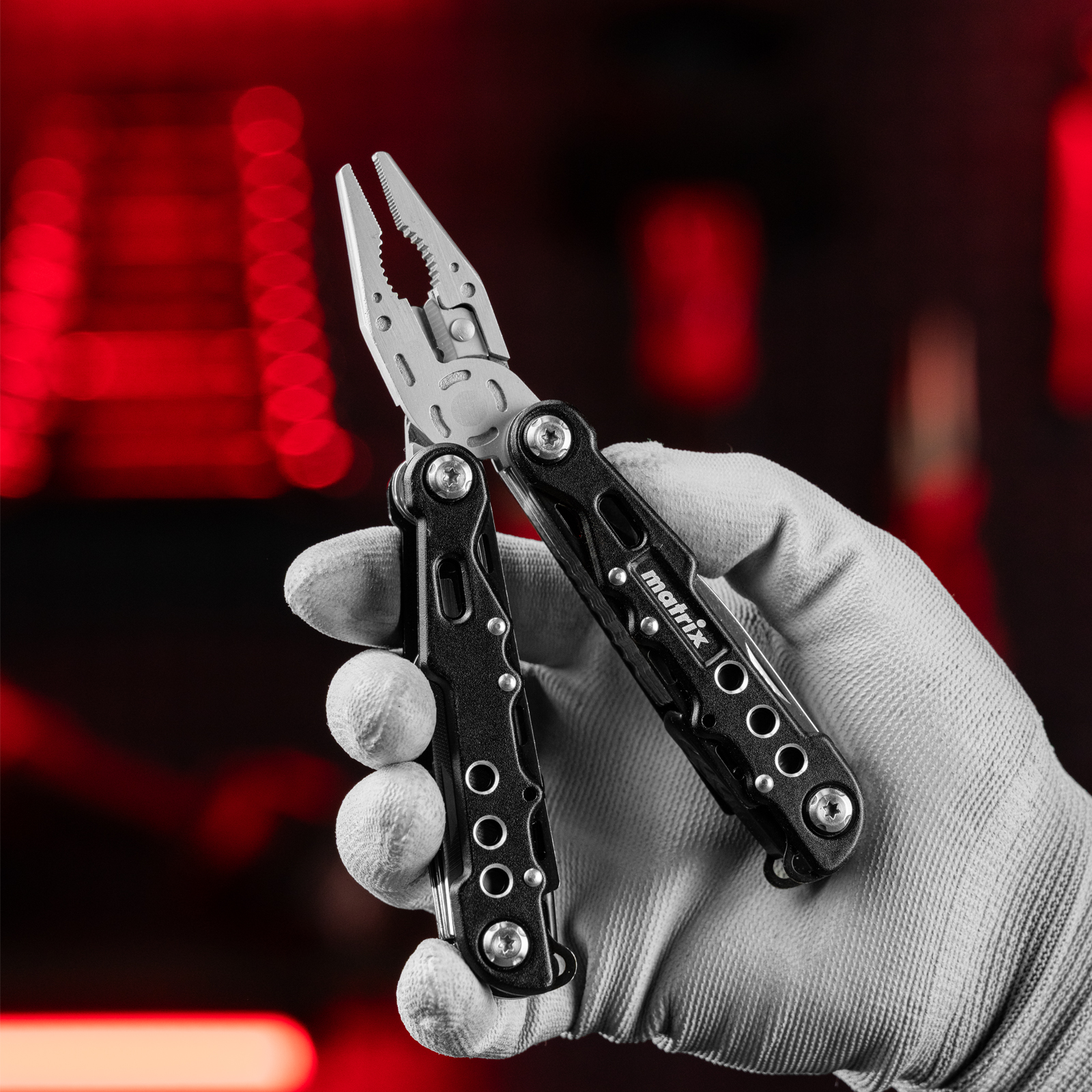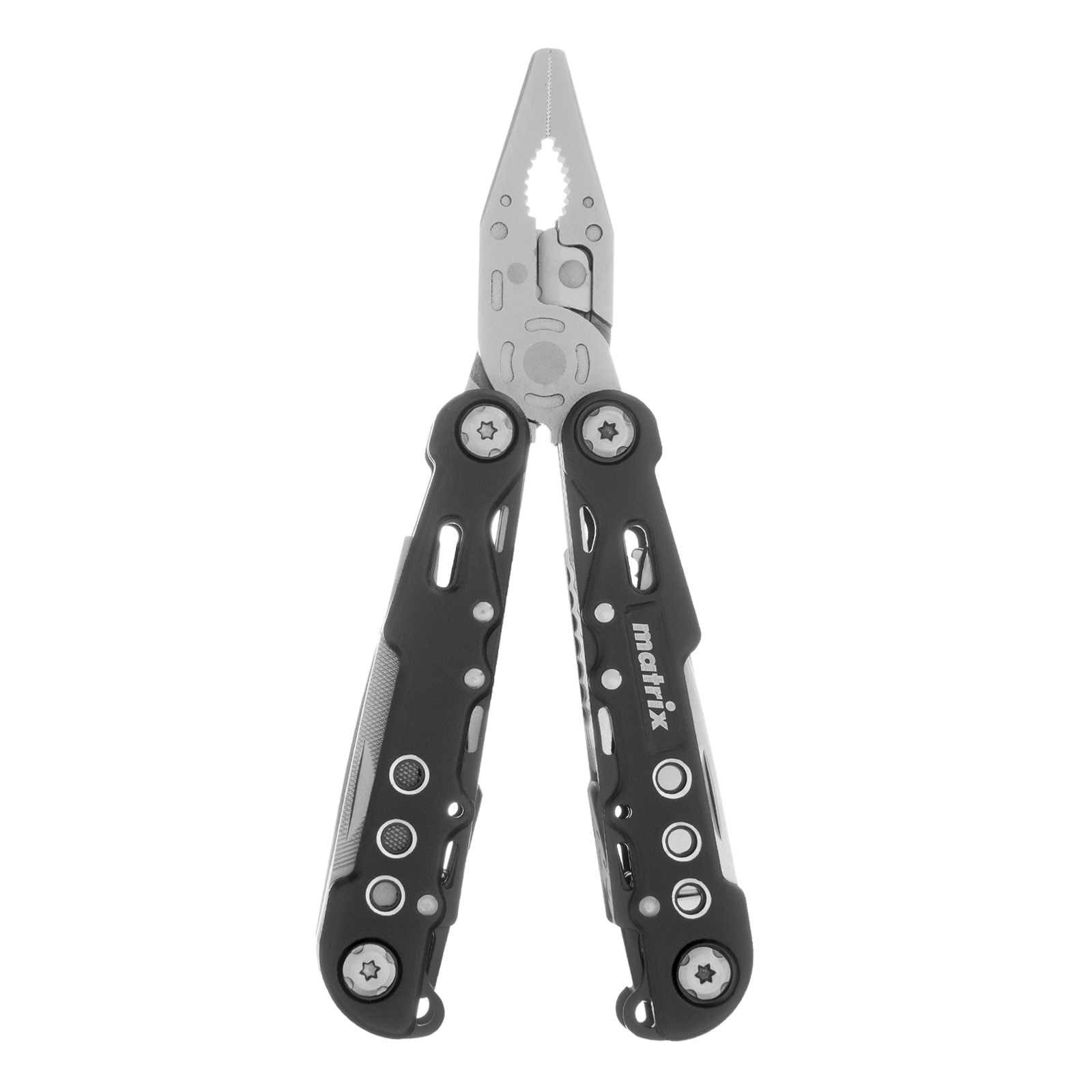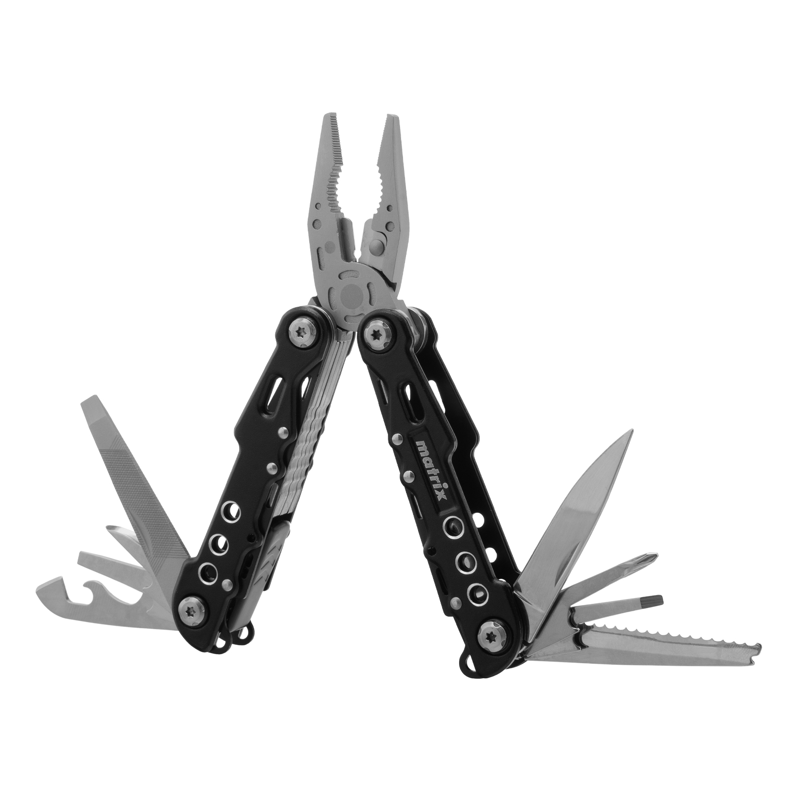 Трансформер Matrix 17622 — это мультитул длиной 165 мм с 13 функциями и авторазжимом, поставляется с чехлом. Его можно использовать в гараже — он включает длинногубцы с кусачками и захватом полукруглых предметов, а также отвертки. Инструмент пригодится в походе, на рыбалке или охоте, поскольку имеет в составе нож, пилу, открывалку и консервный нож. Благодаря пилке для ногтей мультитул будет полезен в быту.