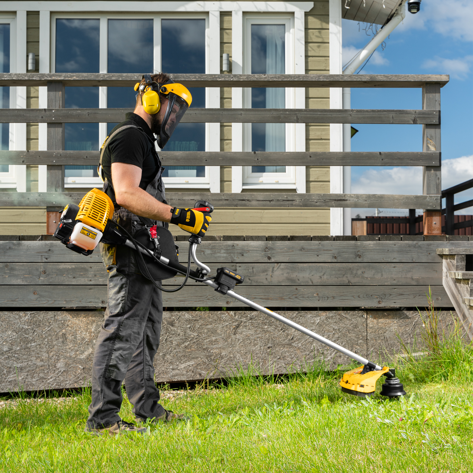 - Максимально комфортная работа — благодаря плечевому ремню триммер удобно удерживать, а мягкая пластина предохраняет пользователя от вибраций и ударов штангой по бедру.