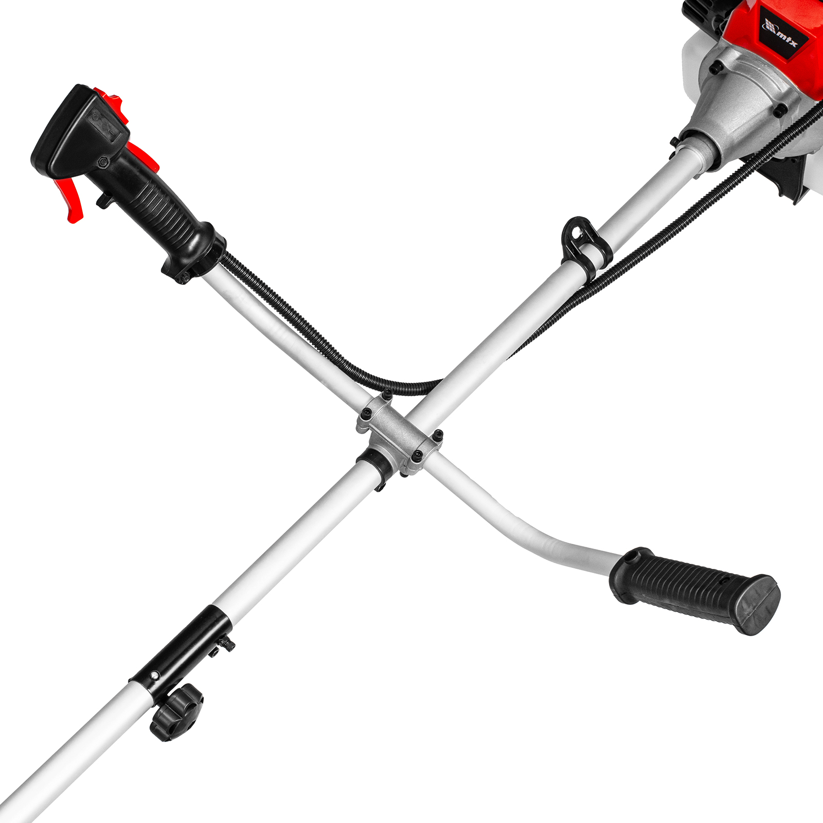 - Комфортная работа — благодаря плечевому ремню и рукояткам велосипедного типа триммер удобно удерживать и направлять.