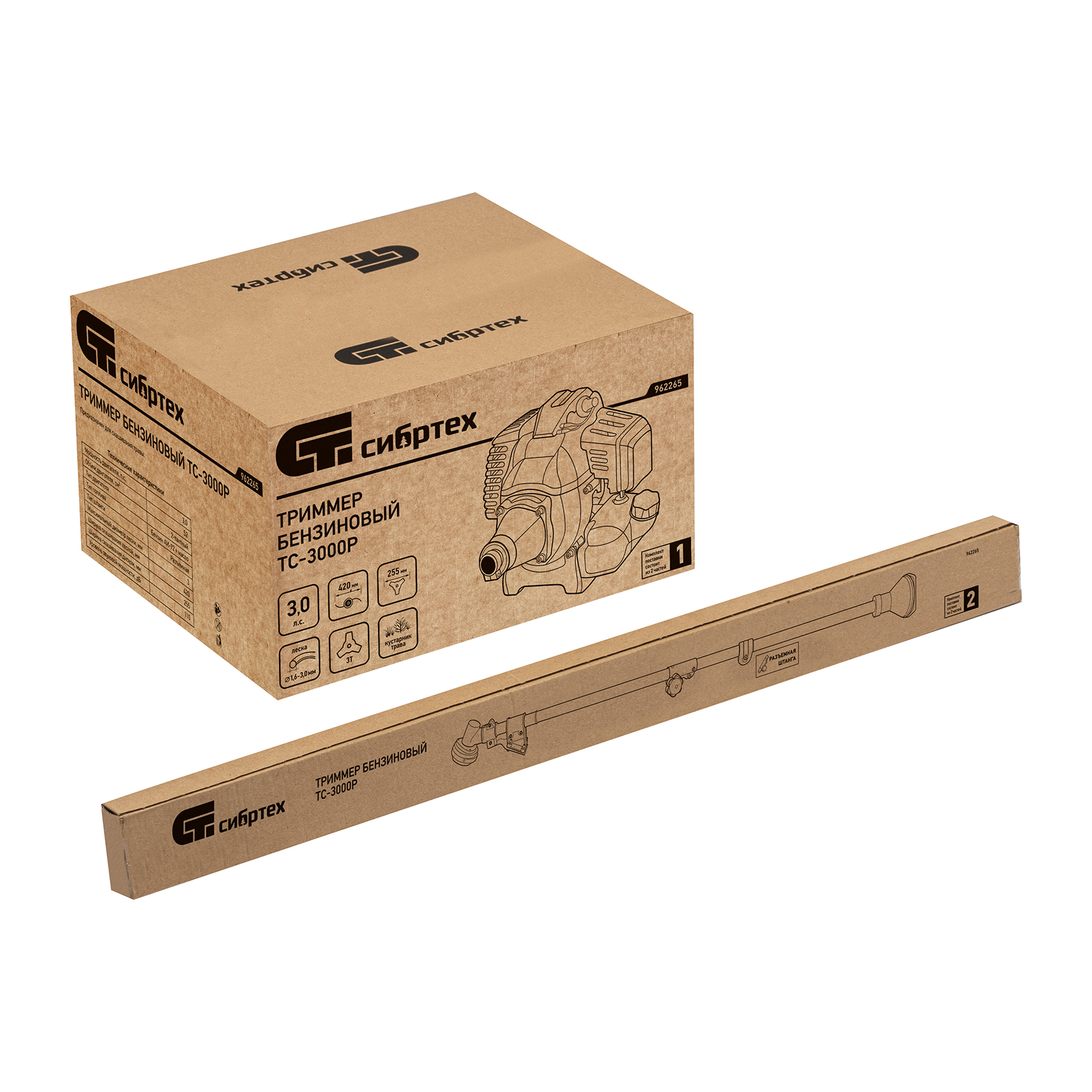 Триммер бензиновый Сибртех ТС-3000Р 962265 с двигателем объемом 52 см3 и разъемной штангой поставляется комплектом, состоящим из 2 частей. Используется для стрижки газонной травы и скашивания растительности. Входящий в комплект поставки трехлопастный нож позволяет легко справляться с густой, жесткой травой и толстыми стеблями сорняков. Оснастка вращается с частотой 9500 об/мин, ширина скашивания леской составляет 420 мм, ножом — 255 мм. Двигатель мощностью 3 л.с. обеспечивает высокую производительность инструмента и позволяет быстро справиться с работой.