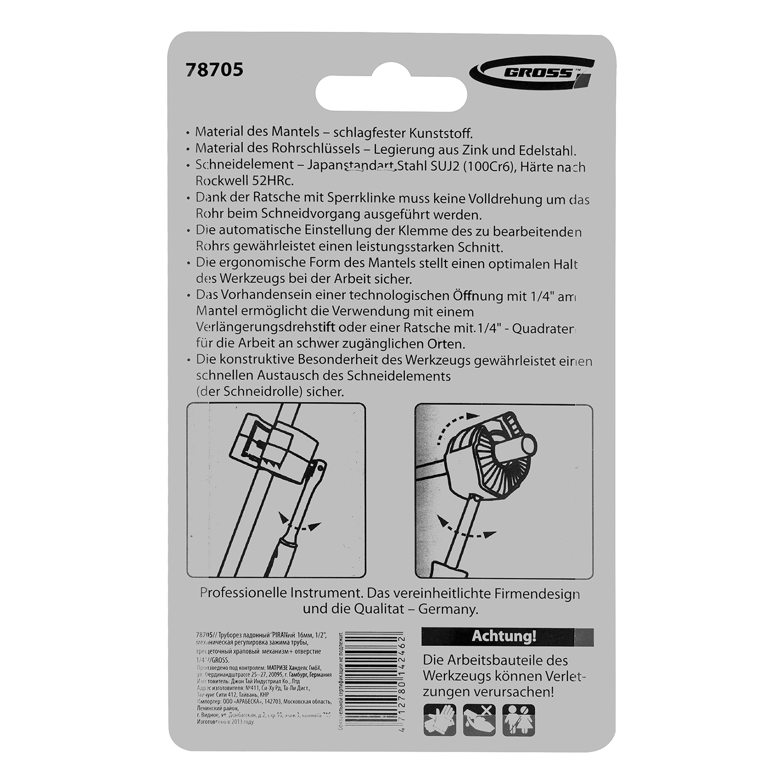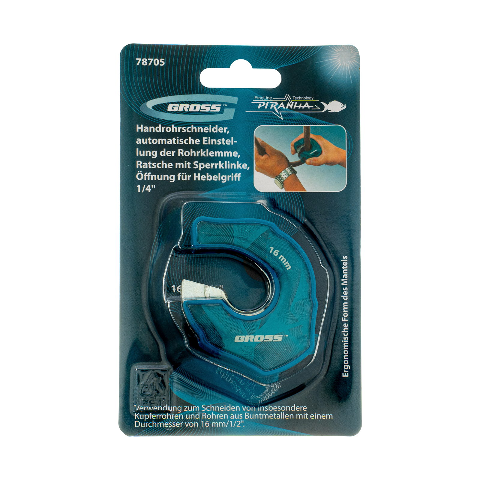 Ладонный труборез Gross «PIRANHA» 78705 с автоматической регулировкой зажима, трещоточным храповым механизмом и отверстием 1/4" используется для резки труб диаметром 16 мм (1/2") из меди и других цветных металлов. Пригодится частному мастеру и профессионалу.