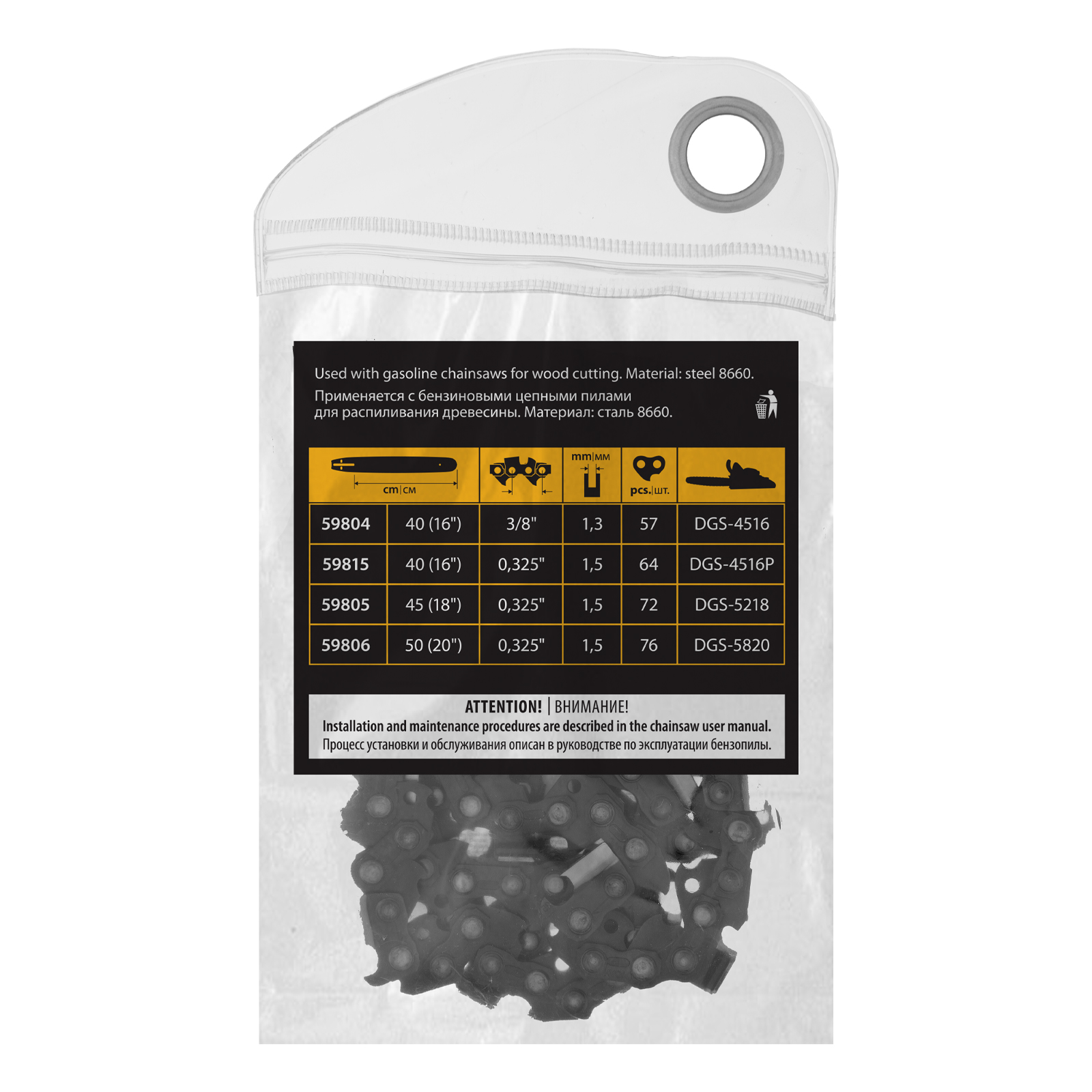 - Безопасное хранение и транспортировка — защитная упаковка предотвращает случайный контакт с острыми звеньями цепи.