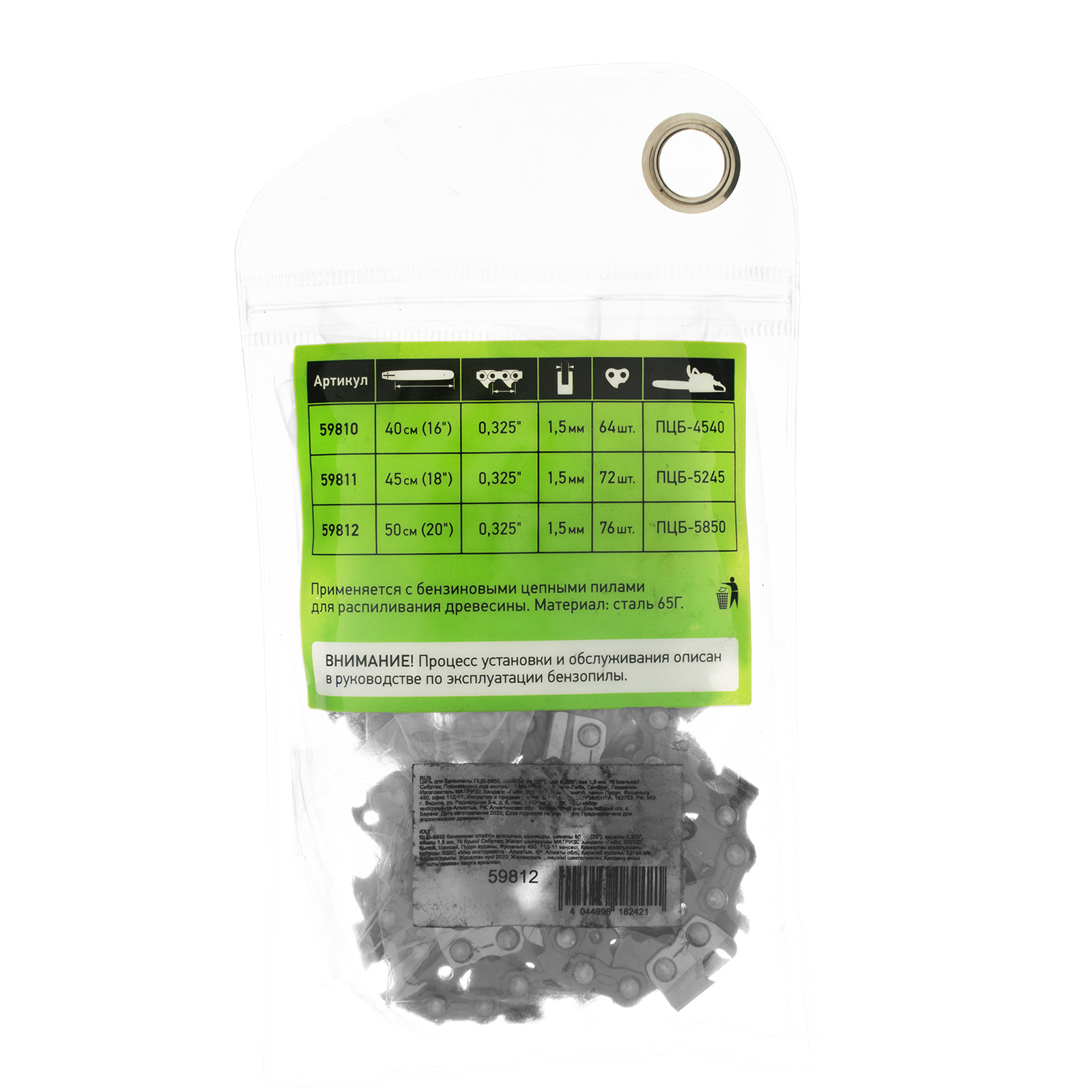 Цепь Сибртех 59812 с шириной паза 1,5 мм используется с бензопилой ПЦБ-5850, состоит из 76 звеньев с шагом 0,325″ и надевается на пильную шину длиной 50 см (20″). Подходит для полупрофессионального применения в быту, на строительной площадке и на выездных работах.