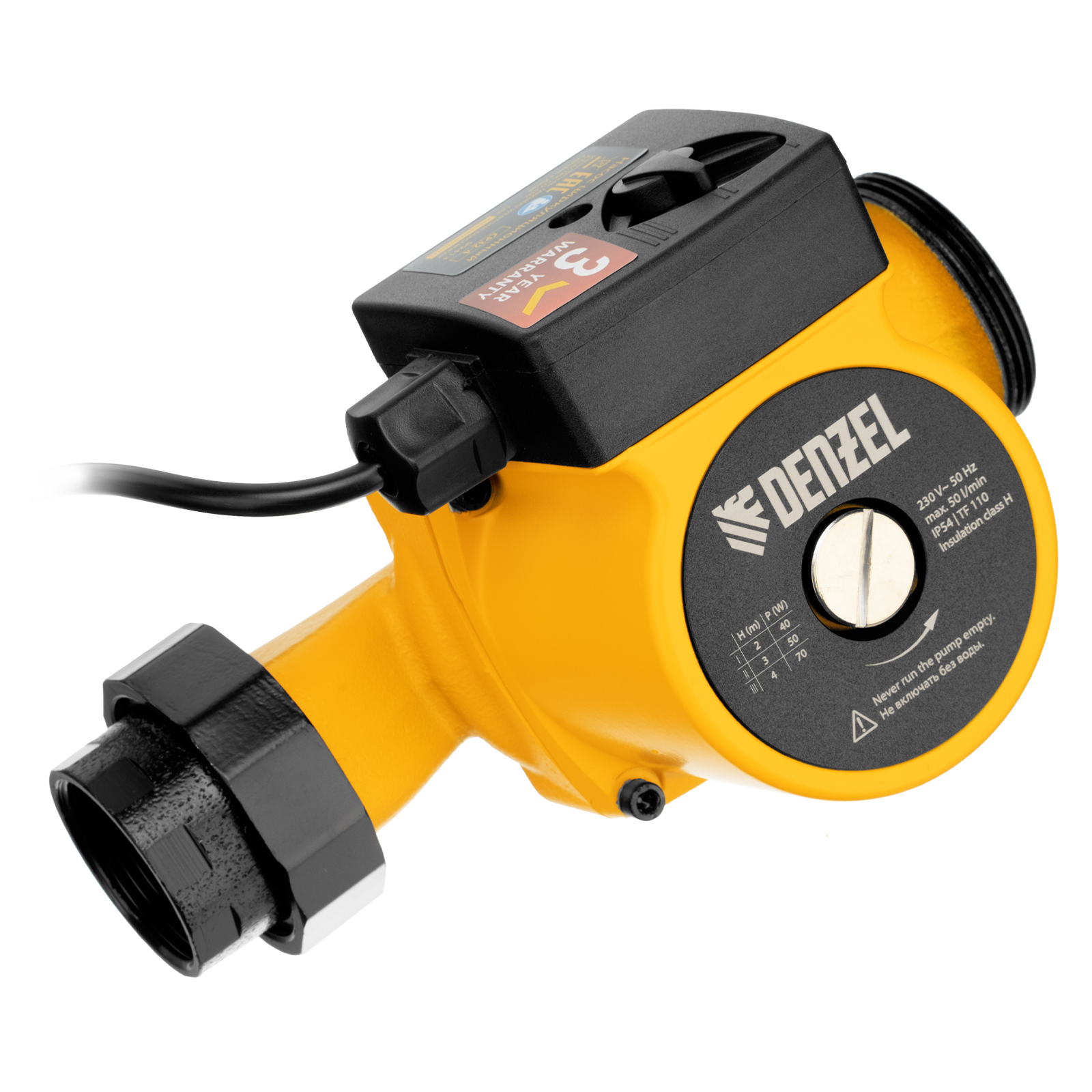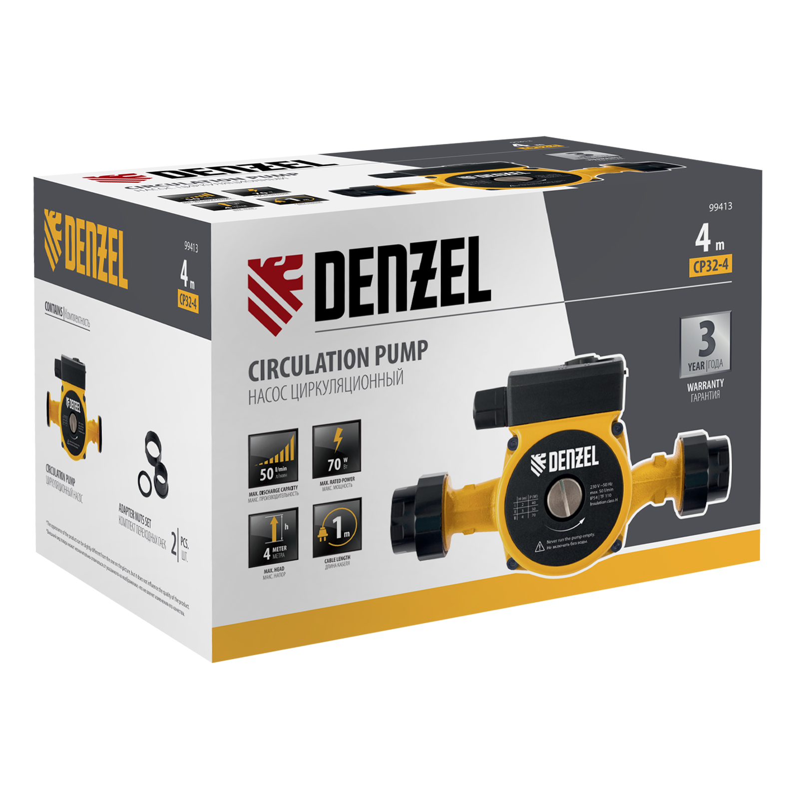 Циркуляционный насос Denzel CP32-4 99413 с кабелем длиной 1 м имеет монтажную длину 180 мм и обеспечивает напор до 4 м, максимальный объем перекачиваемой жидкости составляет 50 л/мин. Устройство обеспечивает непрерывное движение горячей воды температурой до 110 °C по трубопроводу. Насос позволит организовать эффективную систему теплоснабжения загородного дома.