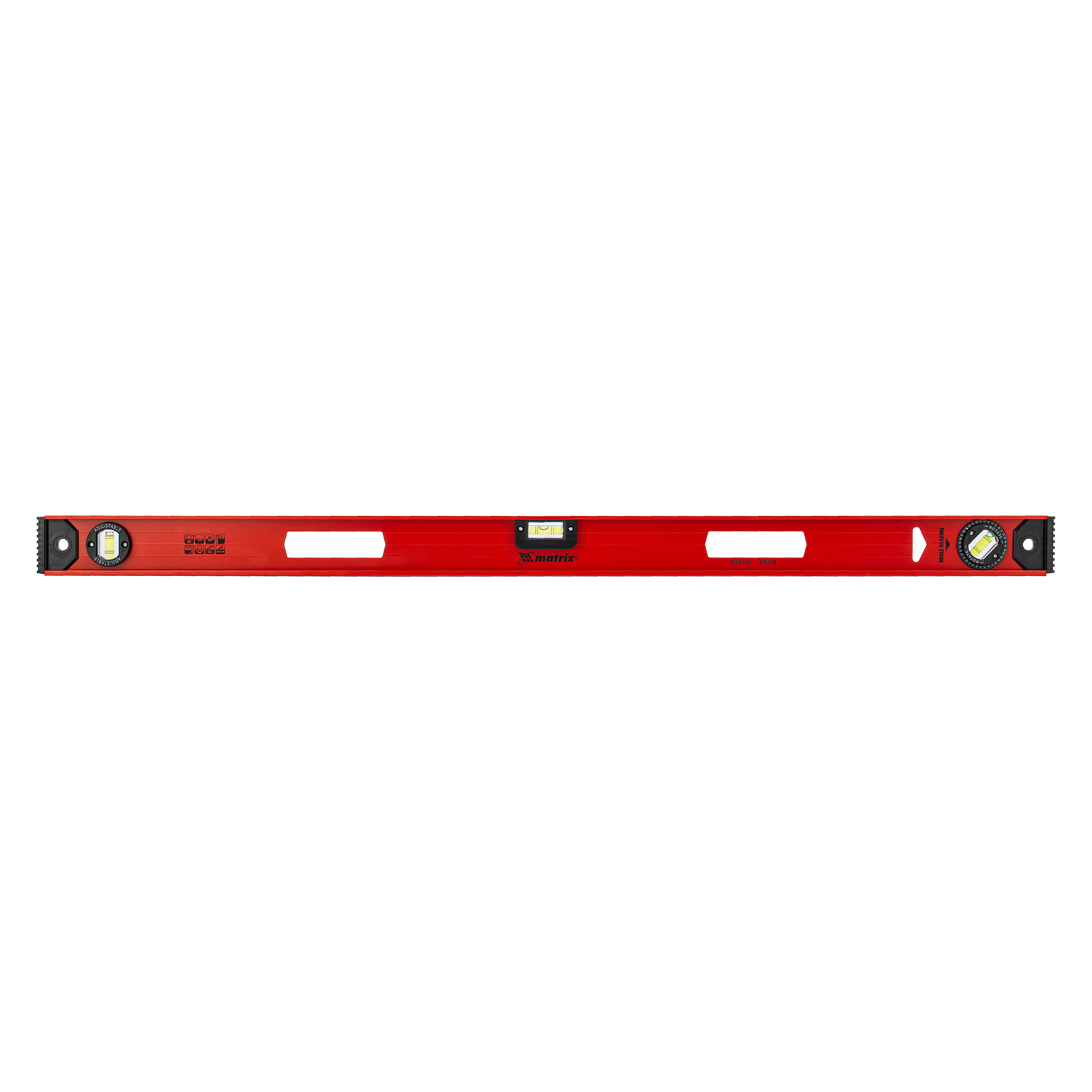Уровень алюминиевый усиленный Matrix «Рельс» 34010 длиной 1000 мм снабжен 3 глазками для проверки отклонений относительно горизонтальной и вертикальной плоскостей. Поворотный глазок уровня позволяет выстроить произвольный угол. Инструмент пригодится строителю, отделочнику, бетонщику и другим специалистам.