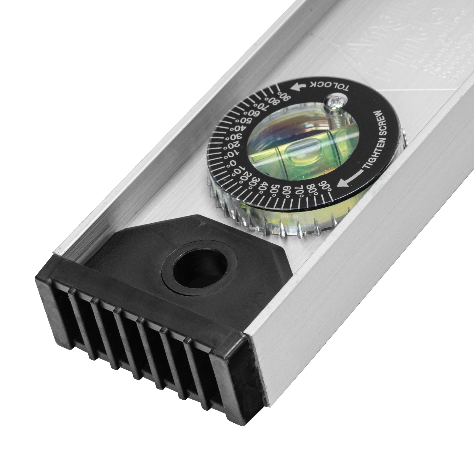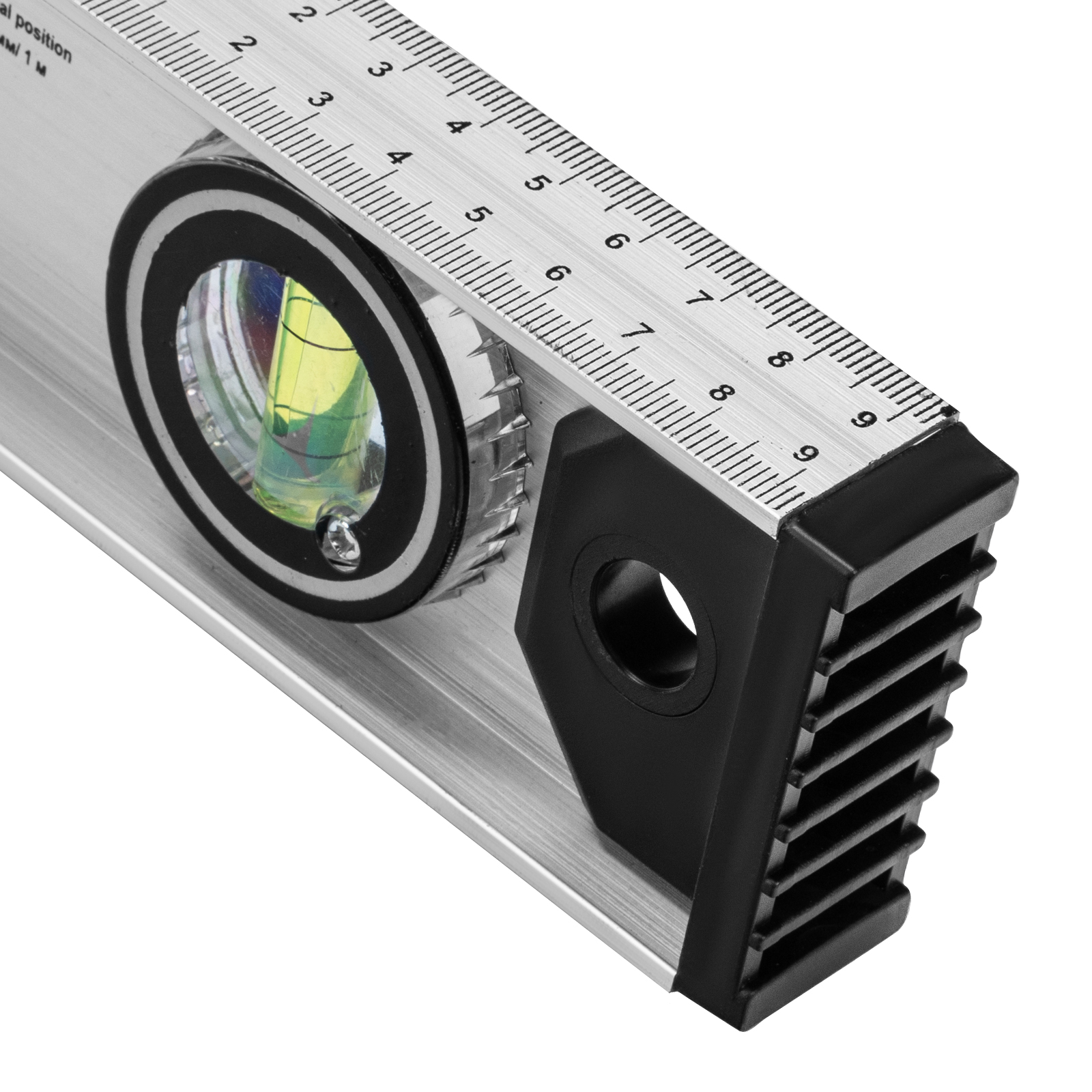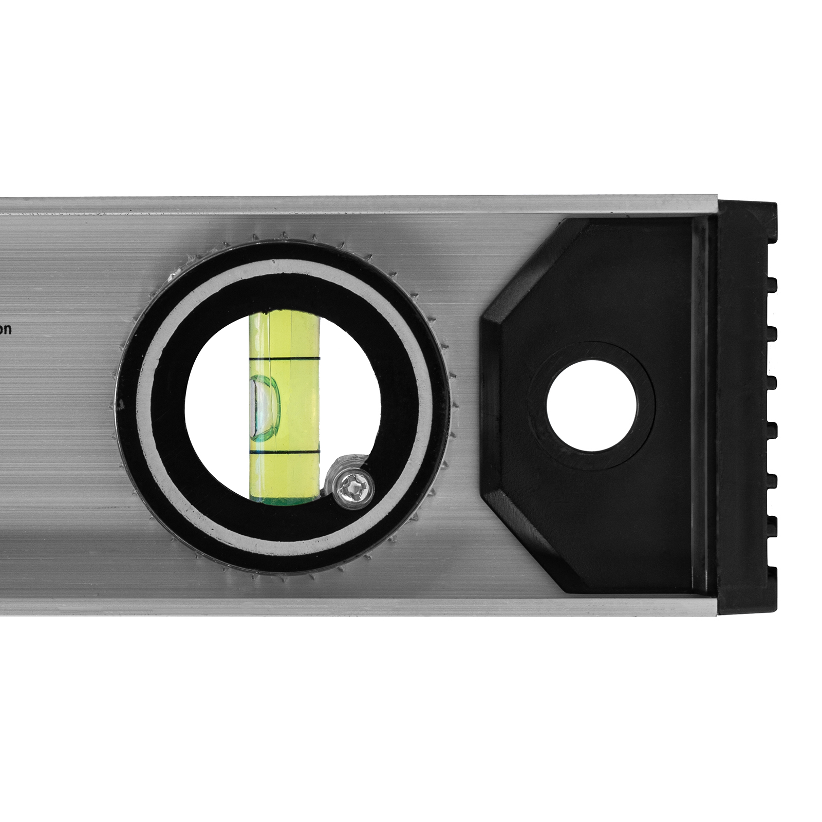 Алюминиевый уровень Matrix «Рельс» 34041 длиной 2000 мм имеет 3 глазка: 2 для проверки отклонений от заданной вертикали и горизонтали и 1 поворотный для проверки наклонных поверхностей.,Для определения отклонения вертикали 90 градусов необходимо использовать пузырьковую ампулу только в верхнем положении уровня. Только базовая поверхность является рабочей (противоположная ампуле 180 градусов).