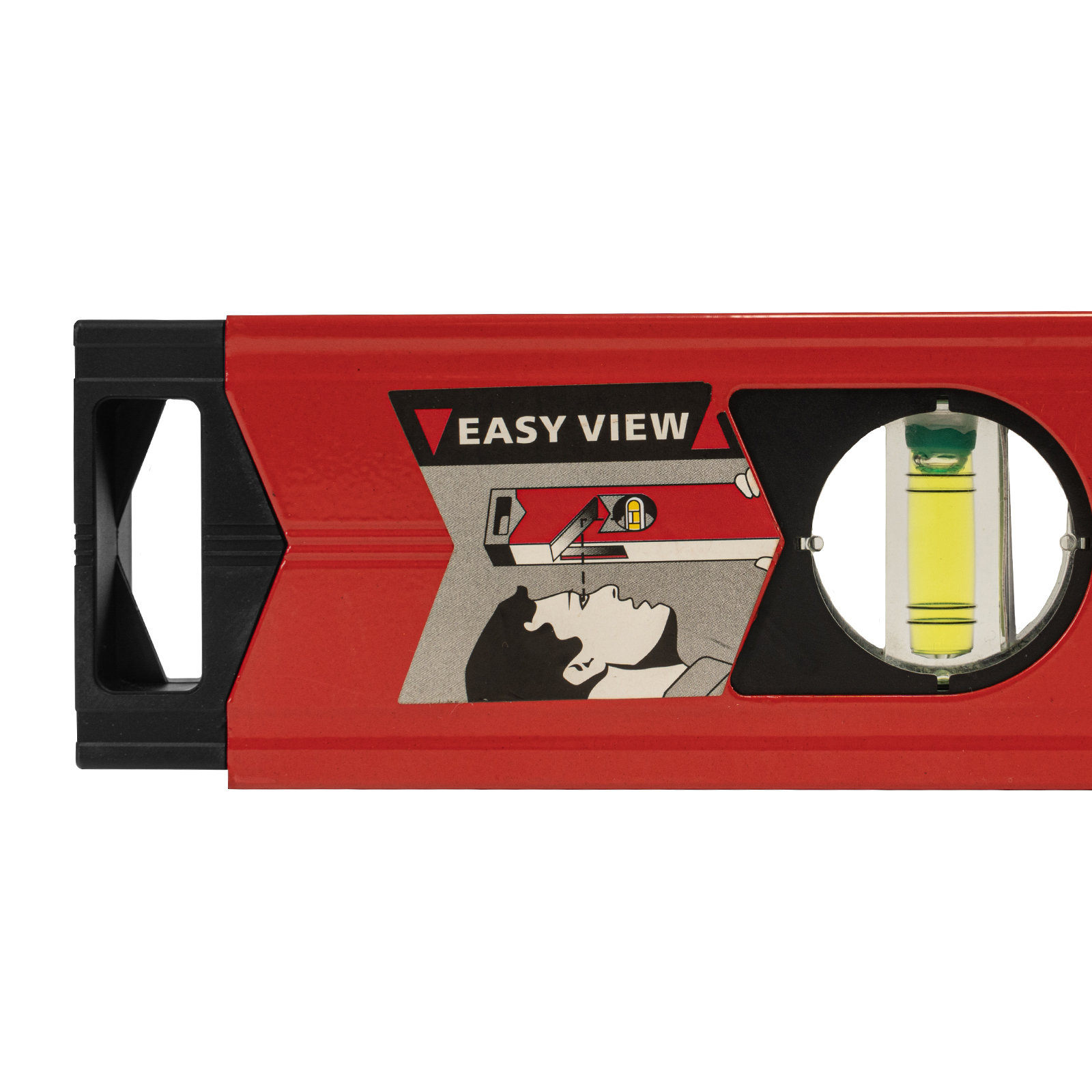 Уровень алюминиевый магнитный Matrix 34710 усиленной конструкции, длиной 1000 мм, с фрезерованной рабочей поверхностью, оснащен 3 глазками и одним зеркальным отражателем. Позволяет выявить отклонения от вертикали, горизонтали и угла 45°. Встроенный зеркальный глазок облегчает считывание показаний.