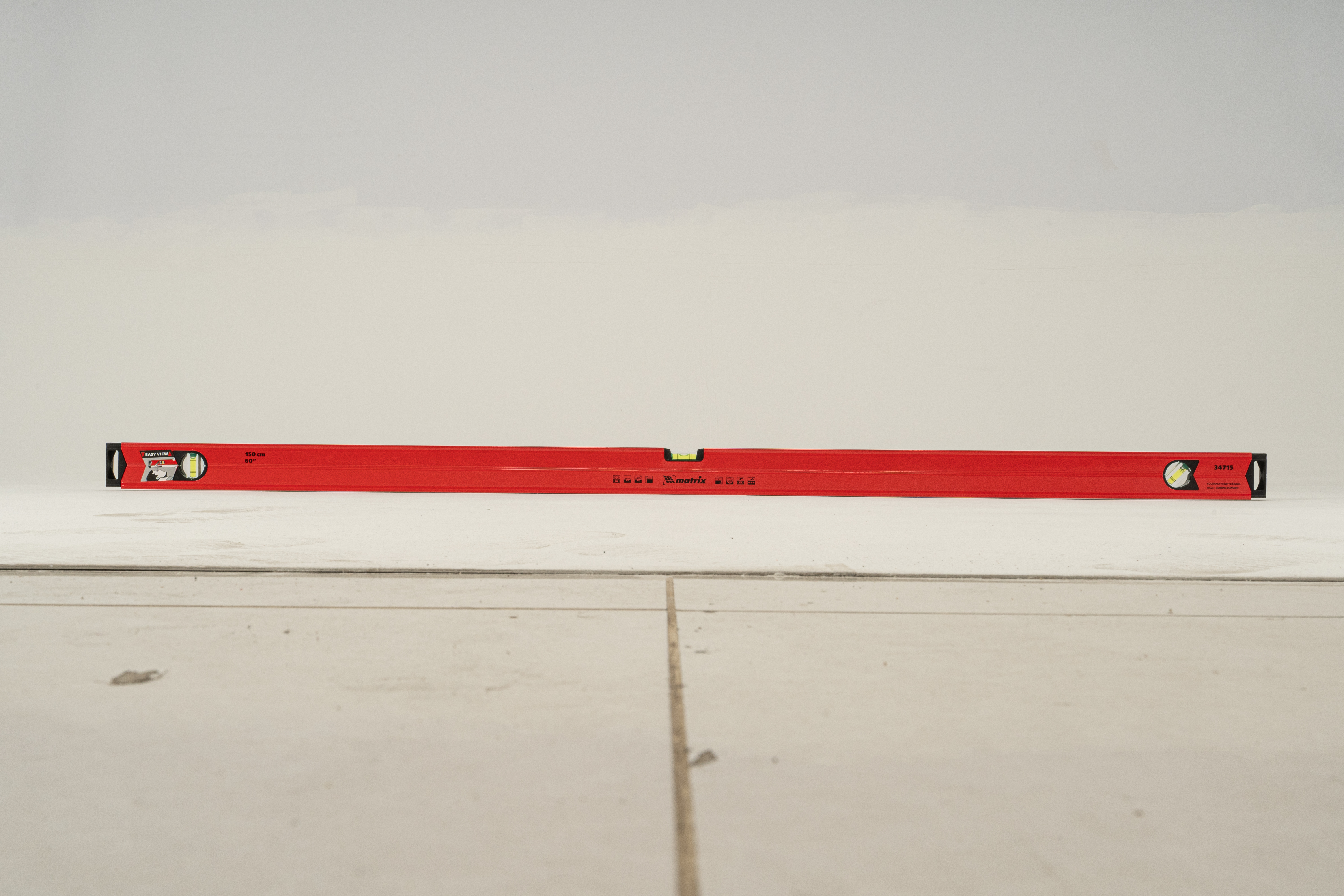 Уровень алюминиевый магнитный Matrix 34715 усиленной конструкции, длиной 1500 мм, с фрезерованной рабочей поверхностью, оснащен 3 глазками и одним зеркальным отражателем. Позволяет выявить отклонения от вертикали, горизонтали и угла 45°. Встроенный зеркальный глазок облегчает считывание показаний.