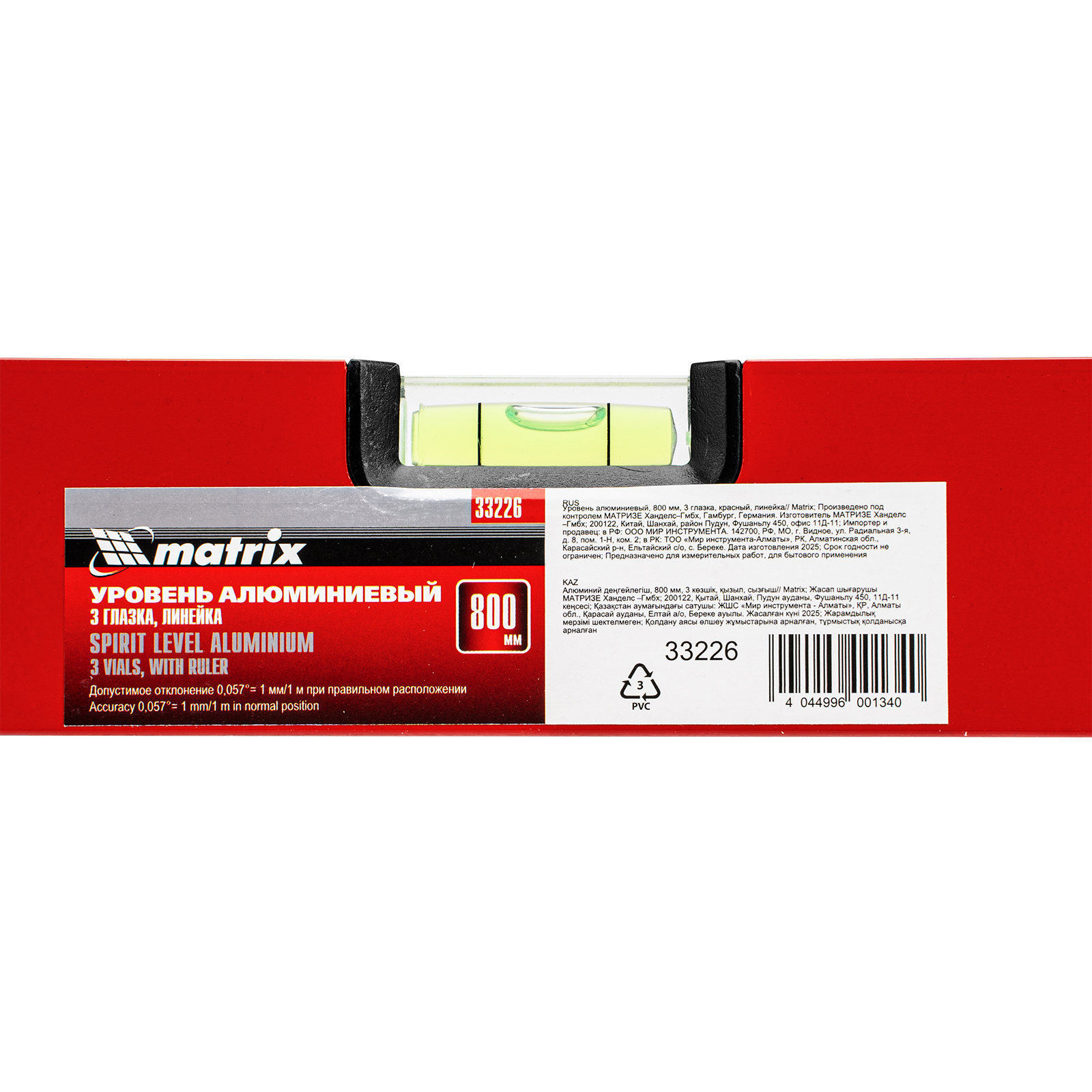 Уровень алюминиевый, 800 мм, 3 глазка, красный, линейка Matrix в Челябинске
