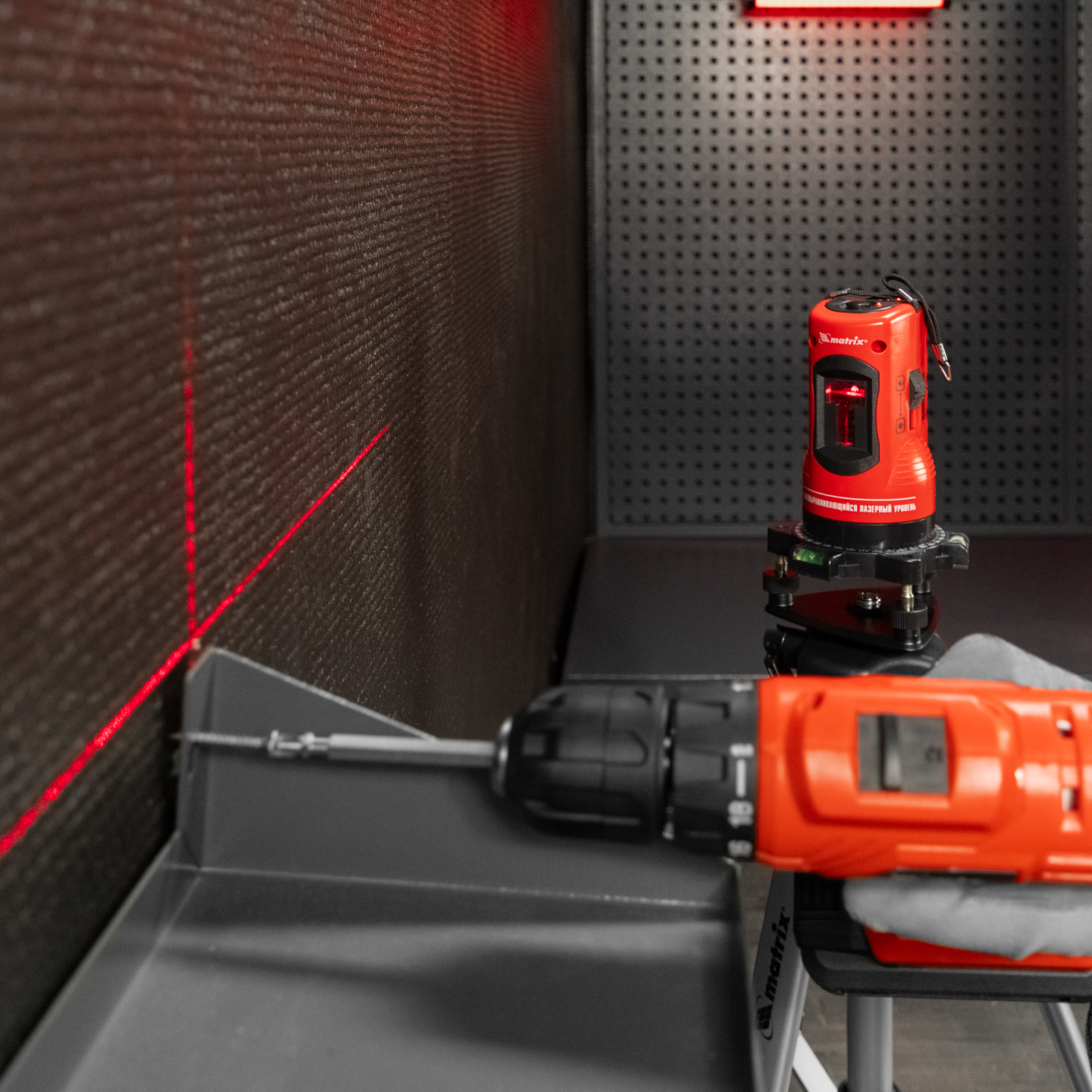 Самовыравнивающийся лазерный уровень Matrix 35033 размером 150 мм, поставляющийся в наборе со штативом 1150 мм в пластиковом кейсе, выстраивает проекции на плоскости: горизонталь, вертикаль или две сразу в виде креста. Инструмент облегчает проведение ремонтных, строительных, монтажных работ, декорирование помещений. Максимальная дальность проекции составляет 10 м, а лазерный луч одинаково хорошо виден в светлое и темное время суток, в помещениях и на улице.