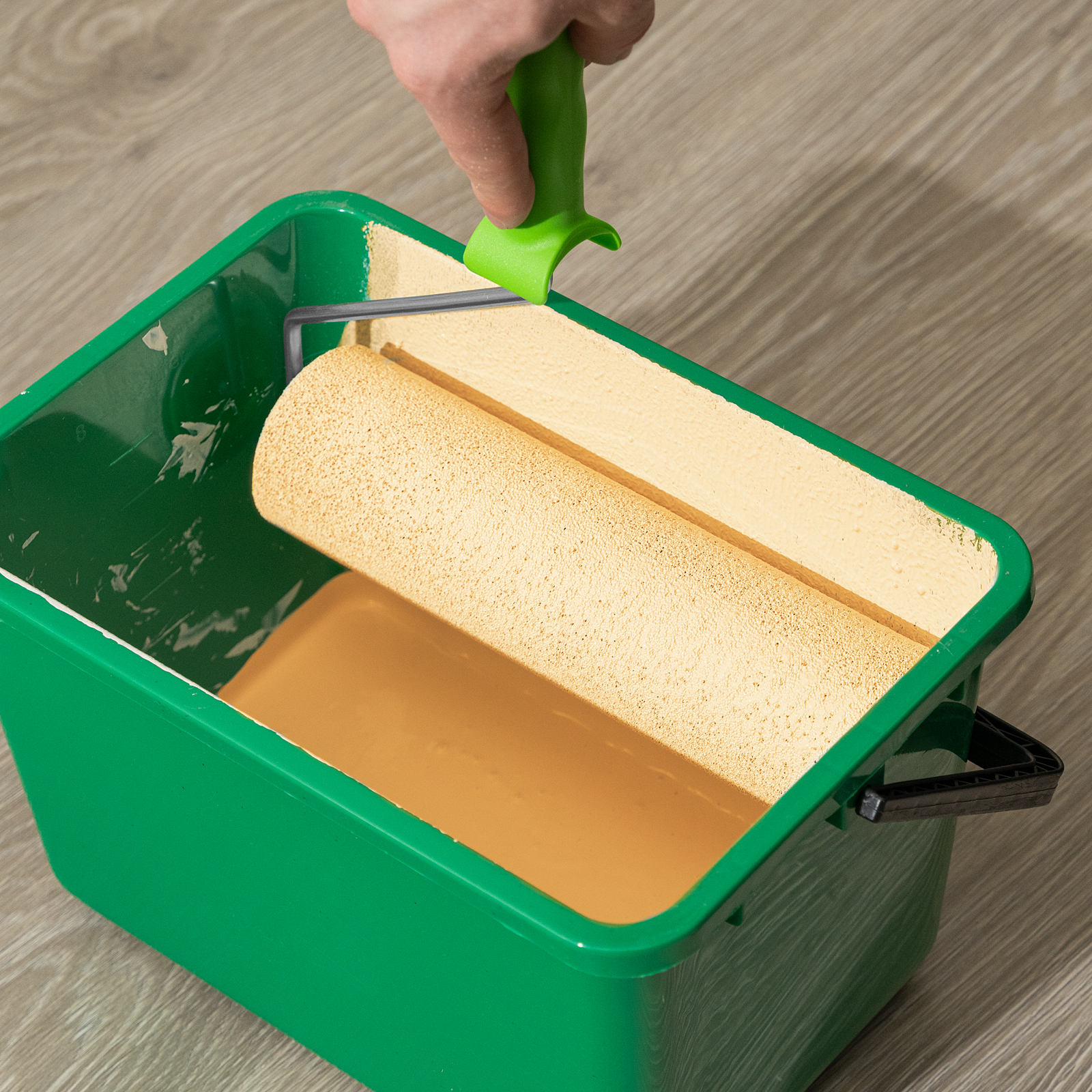 - Комфортная работа — прямоугольная форма ведра облегчает погружение валика, а рельефные полосы на внутренних стенках помогают удалять излишки краски с инструмента.