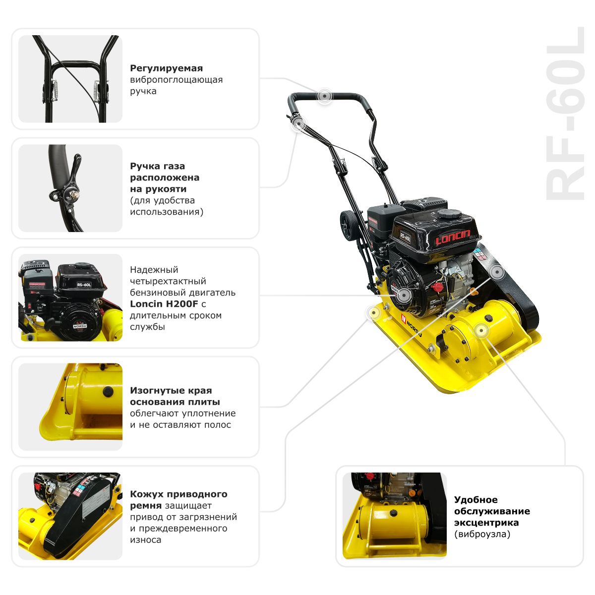 Прямоходная виброплита NORSU RF-60L — модель, отличающаяся эффективностью и высоким качеством исполнения. Объем топливного бака составляет 2.5 л. Основание плиты сварное, устойчивое к деформациям и износу. Допускается использовать RF-60L для укладки тротуарной плитки (для этих видов работ необходимо отдельно приобрести полиуретановый коврик).