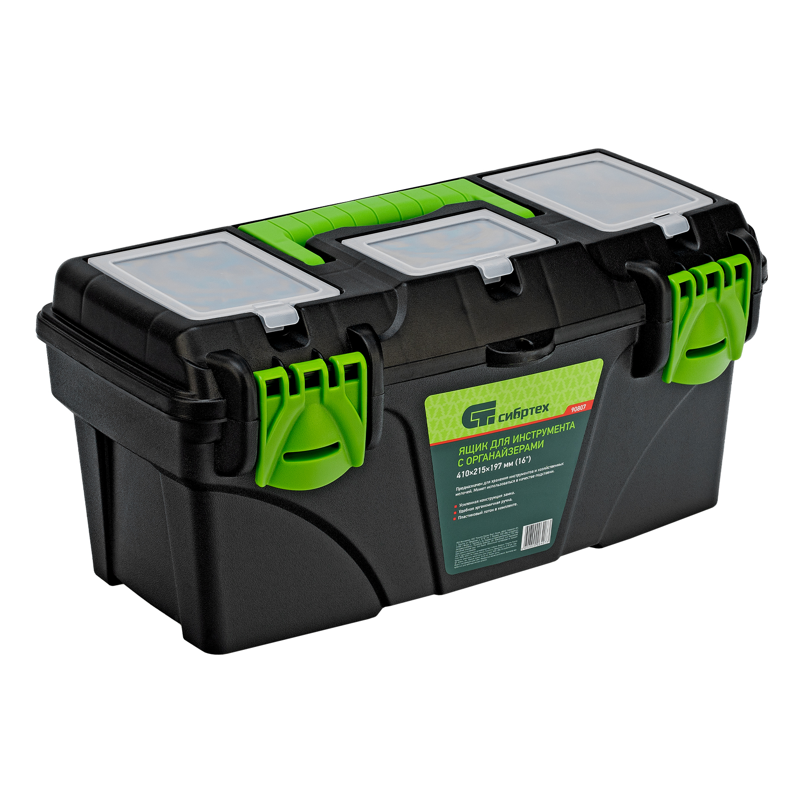 Ящик Сибртех 90807 длиной 16", с органайзерами, используется для хранения и транспортировки инструментов, оснастки, крепежа, хозяйственных мелочей и других предметов. Крышка и замок усилены трехрядными петлями, поэтому ящик выдерживает вес содержимого до 30 кг. Съемный лоток позволяет оптимизировать пространство внутри ящика. Его можно брать в поездку, также он пригодится дома, на даче или в гараже.