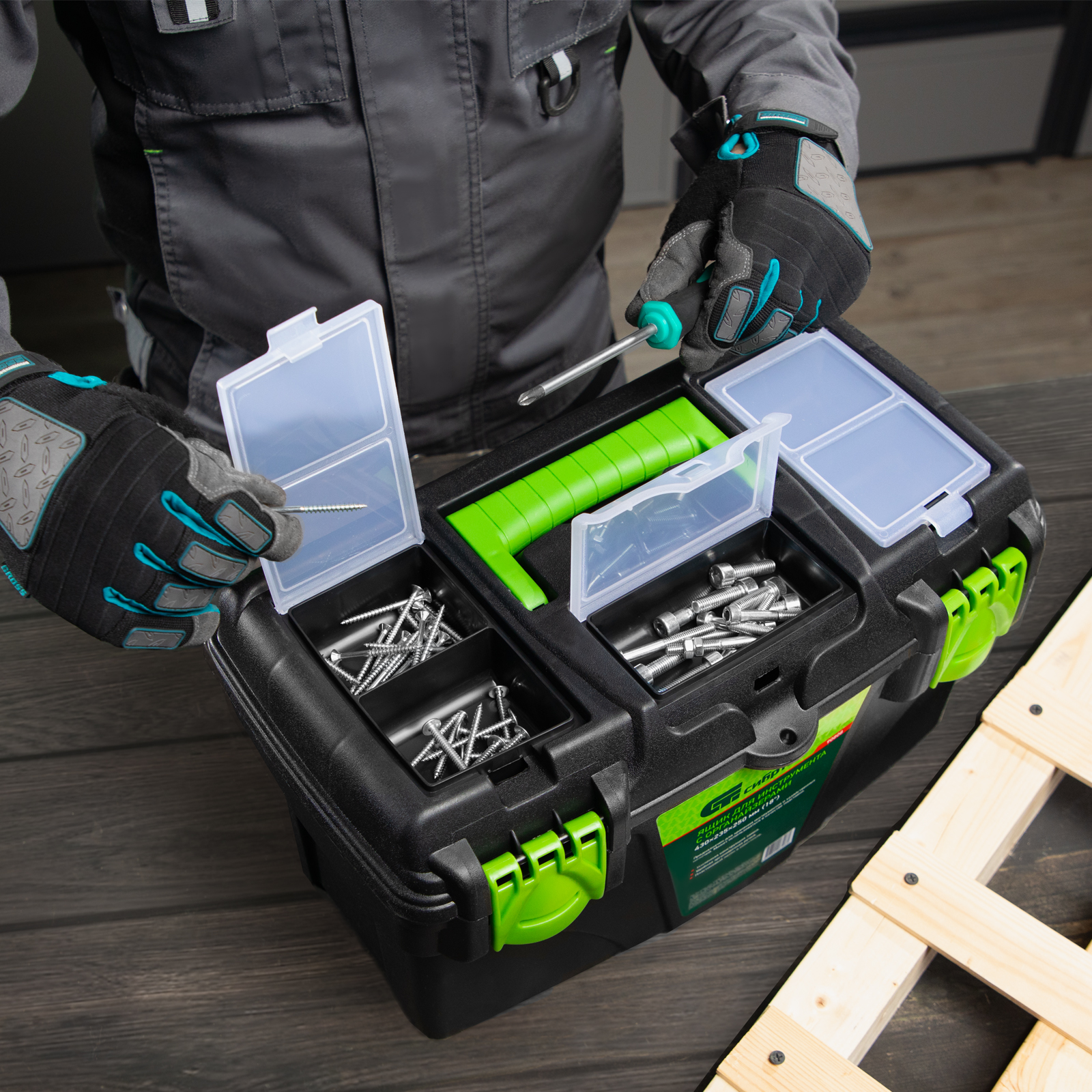 - Удобное хранение крепежа и мелких деталей — в крышке имеются органайзеры.