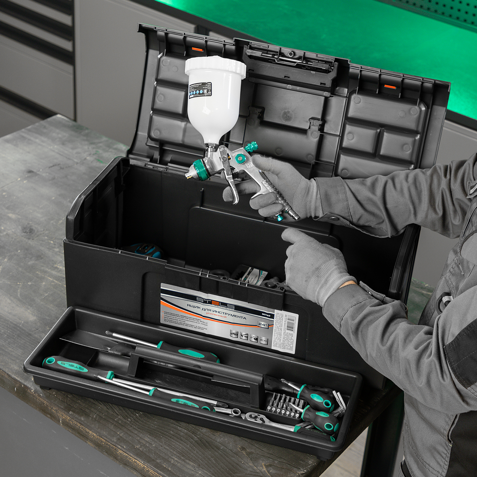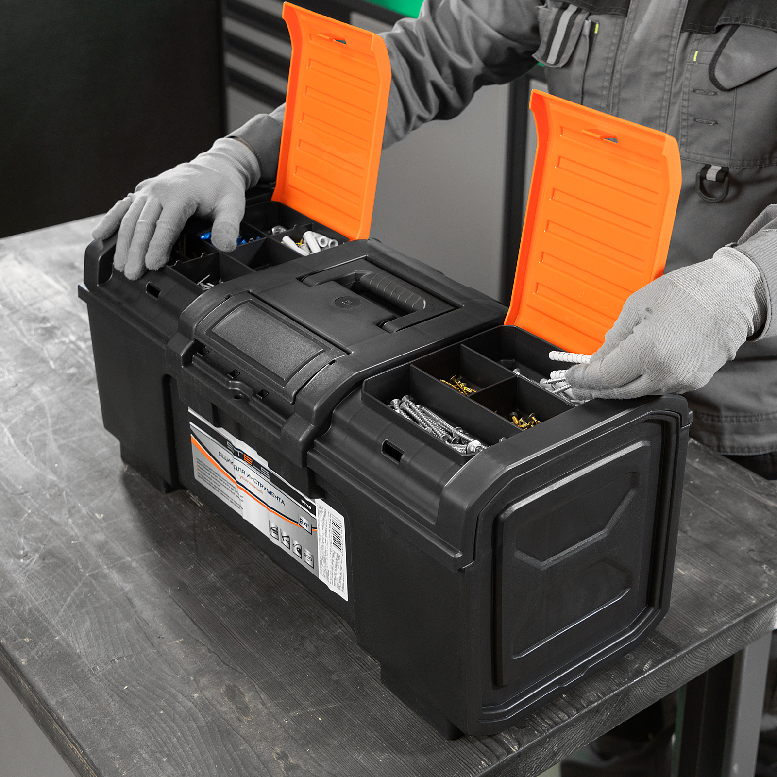 - Упорядоченное хранение крепежа и мелких деталей — в крышке имеются специальные органайзеры, также в комплект поставки входит съемный лоток с ручкой.