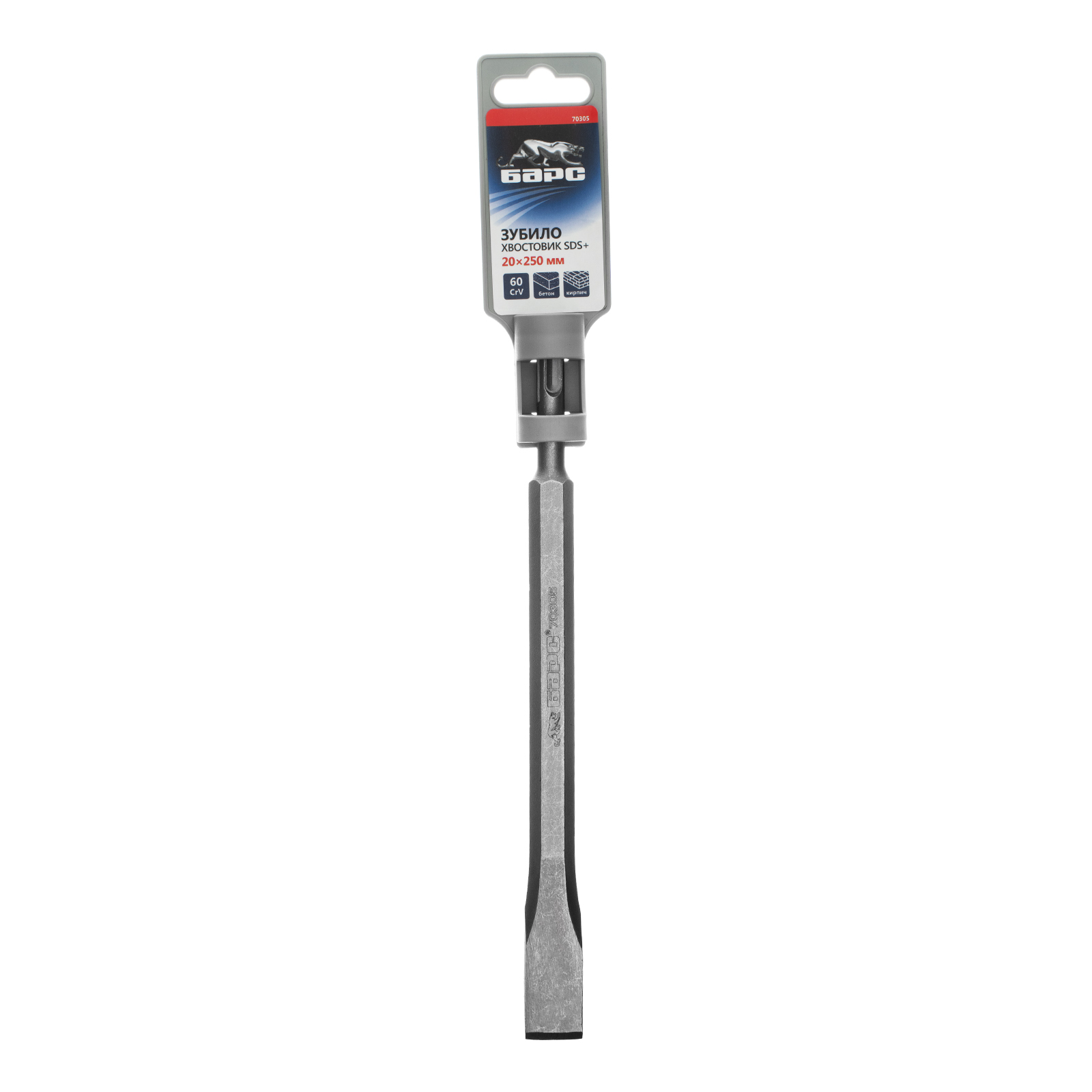 Зубило Барс 70305 размером 14 х 20 х 250 мм, из стали 60 CrV, с хвостовиком SDS PLUS, применяется совместно с перфоратором для дробления твердых материалов: камня, бетона и кирпича. Пригодится частным и профессиональным мастерам для разрушения различных конструкций, демонтажа старой отделки, штробления стен и выполнения других операций.